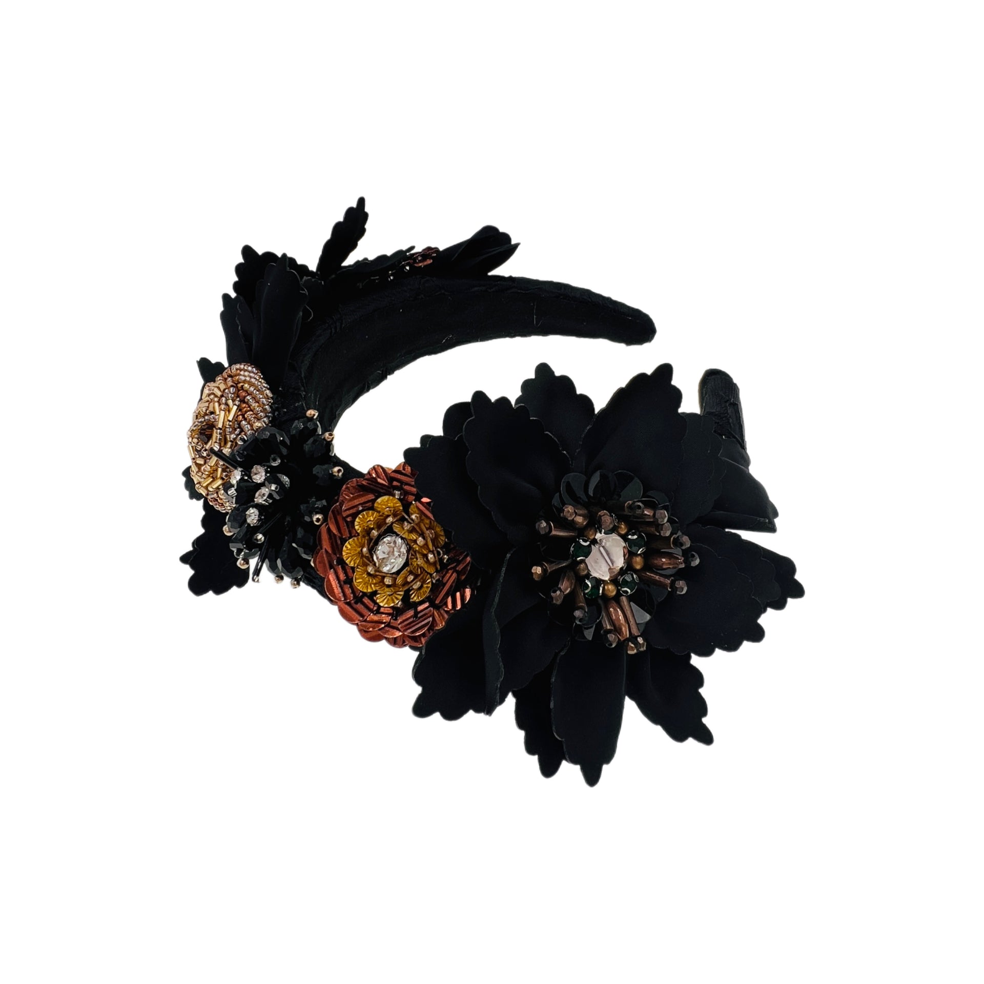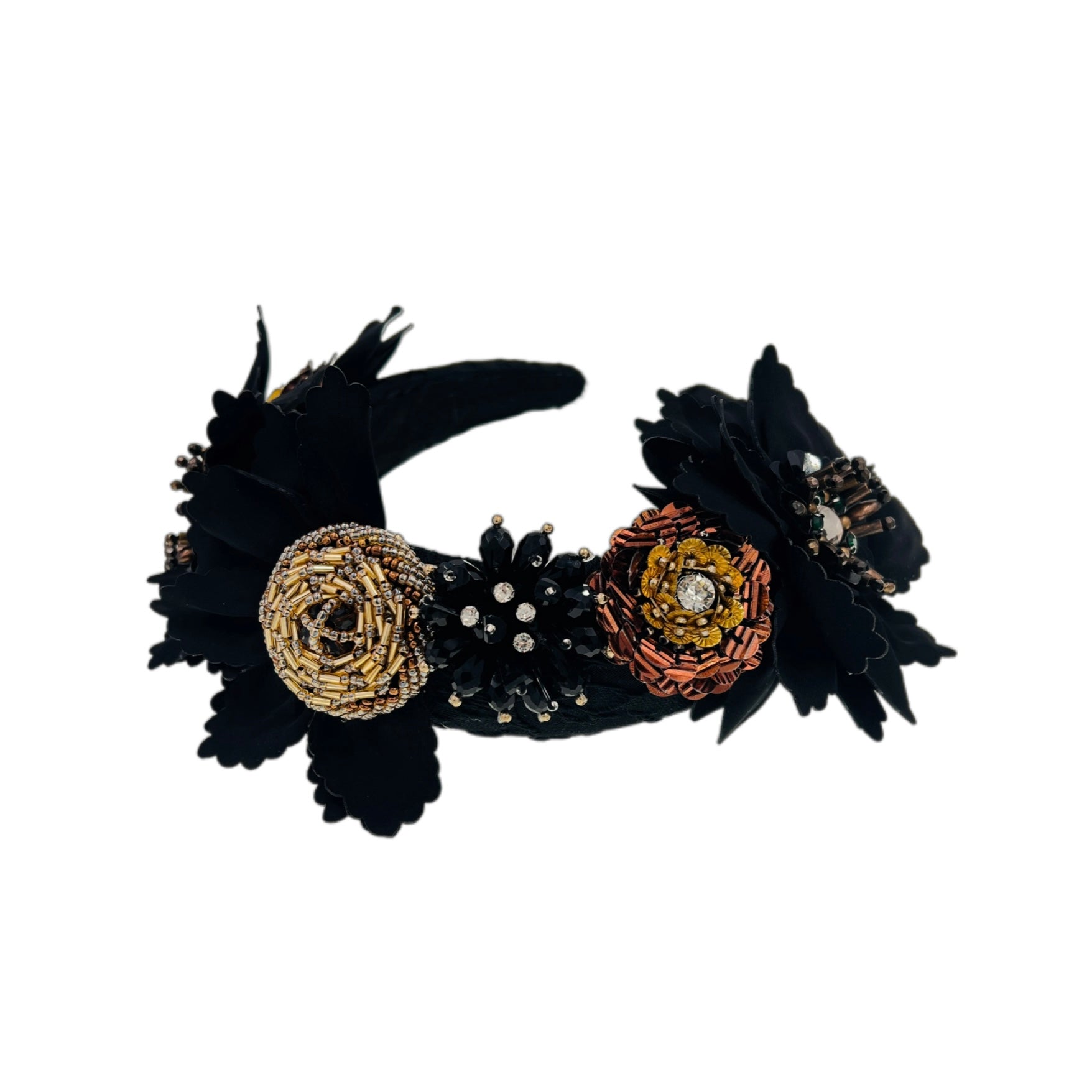 A handcrafted statement headband adorned with dimensional florals made from seed beads, crystals, metal accents, and Czech rhinestones. Arranged in rich layers along the band, each flower reveals intricate detail and texture from every angle.