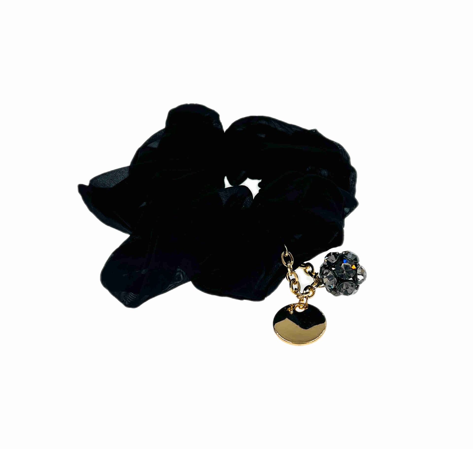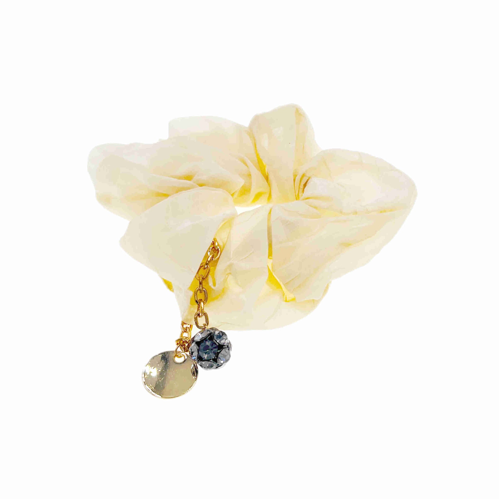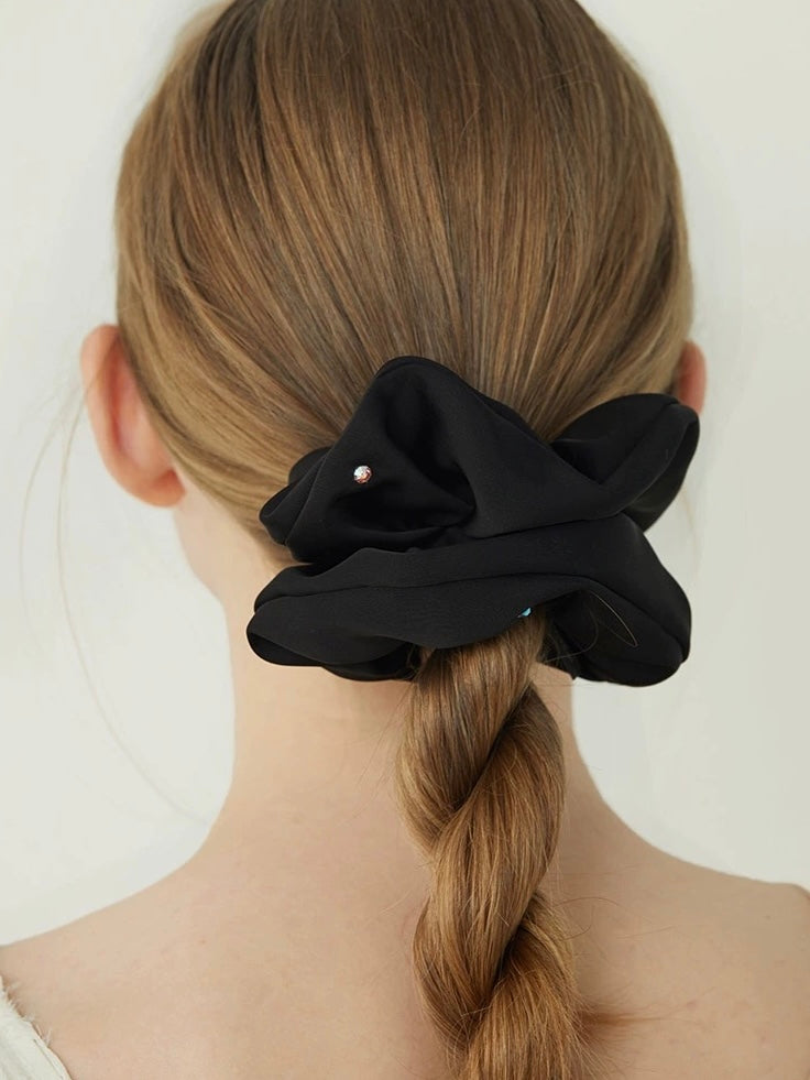 Simple yet charming. This fabric hair tie, adorned with a crystal ball and small accessories, exudes a playful and lively vibe. The subtle details add a touch of vibrancy and dynamism to your look. Make your hairstyle more lively and fun, letting the playful spirit float freely.