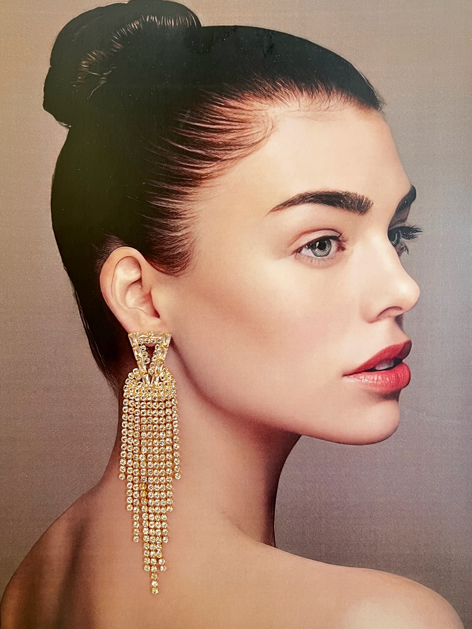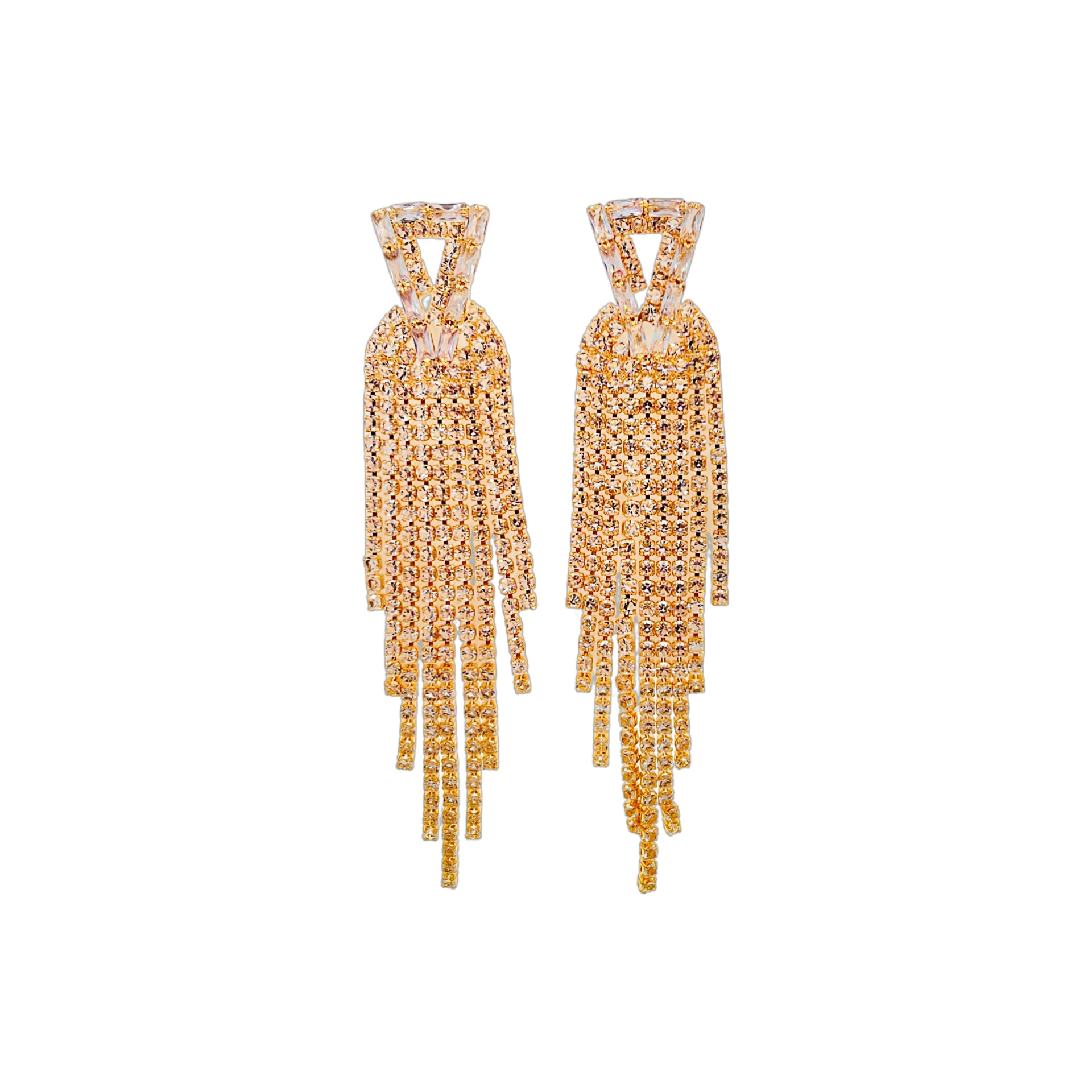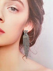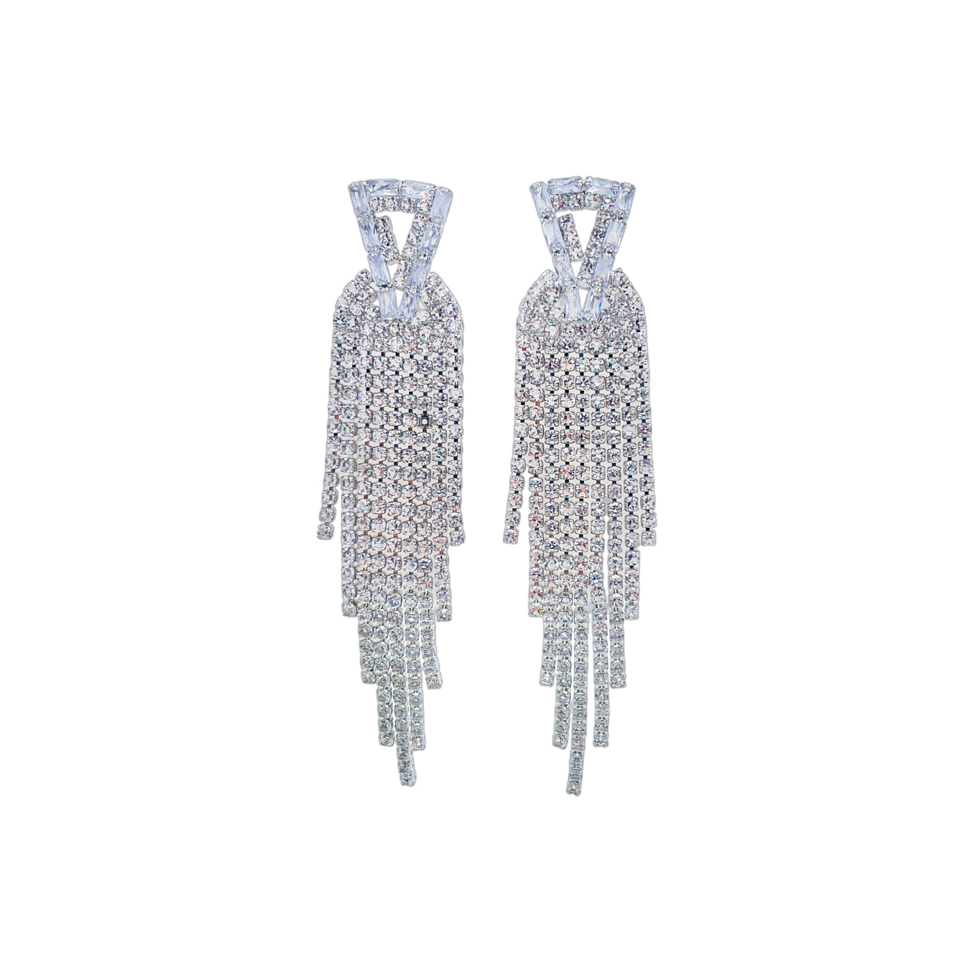 These earrings feature a distinctive openwork geometric top adorned with a crystal-clear centerpiece, adding a touch of refined elegance. Below, fully encrusted rhinestone fringe chains cascade in varied lengths, swaying gracefully with movement and catching the light from every angle.