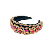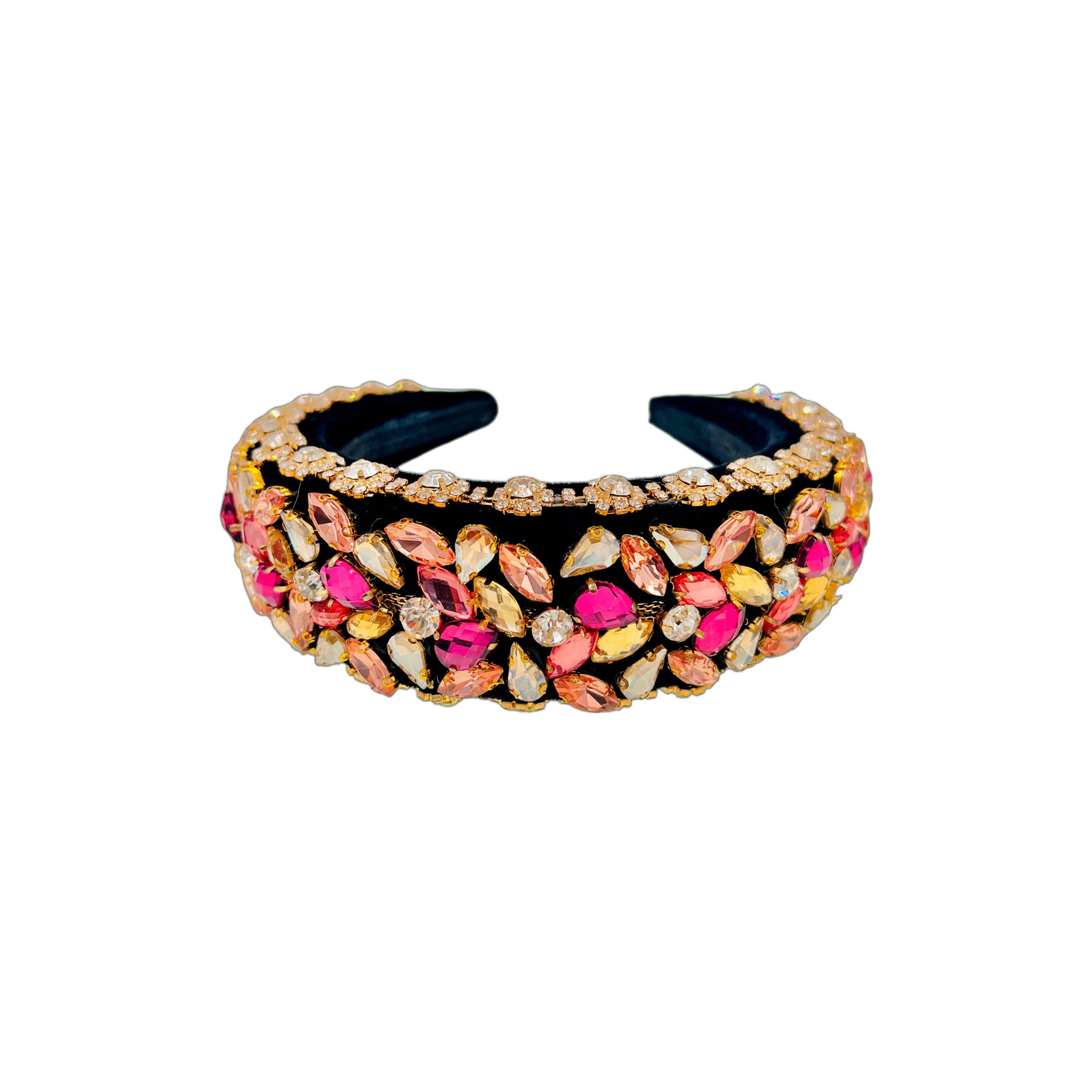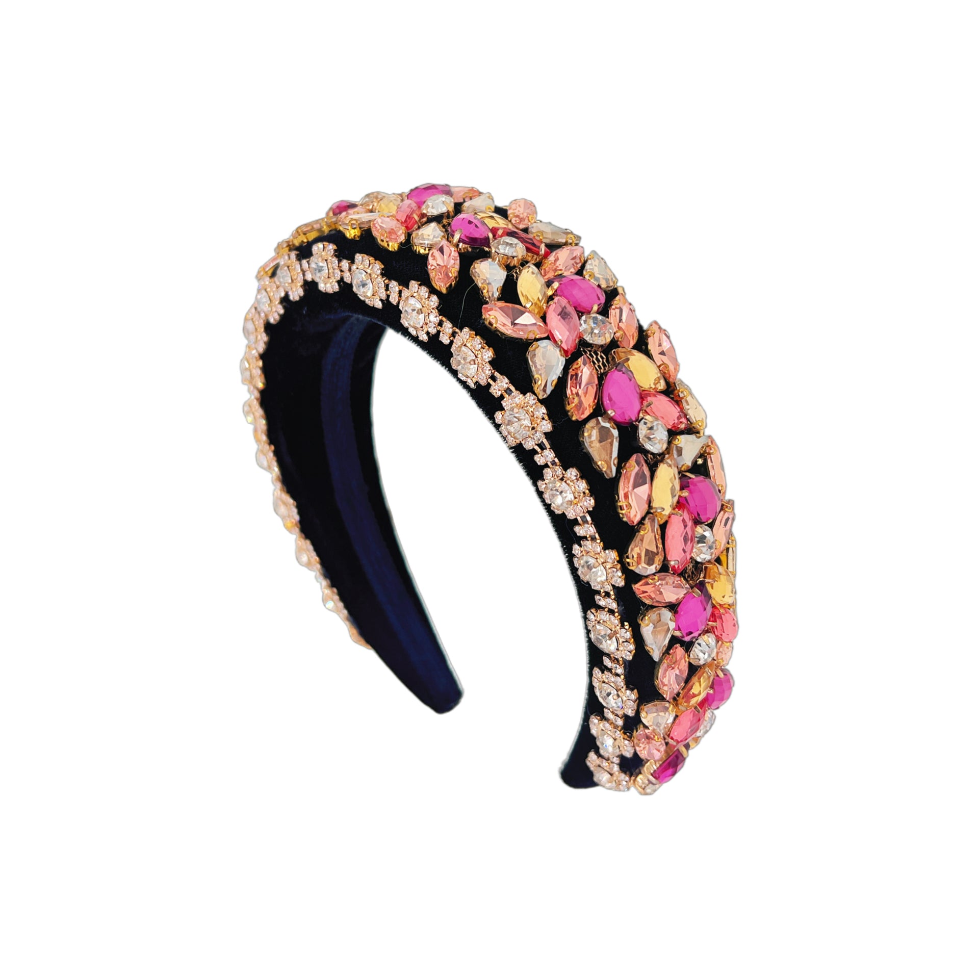 Set on a wide velvet base, this headband features an opulent array of teardrop, round, and other uniquely cut crystals, forming a kaleidoscopic mosaic of color and light. Like a royal stained-glass window, its structured layout is softened by a free-spirited palette—creating a look that feels both rich and airy, steeped in old-world charm with a touch of modern flair.