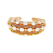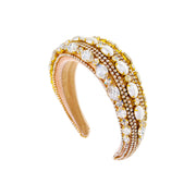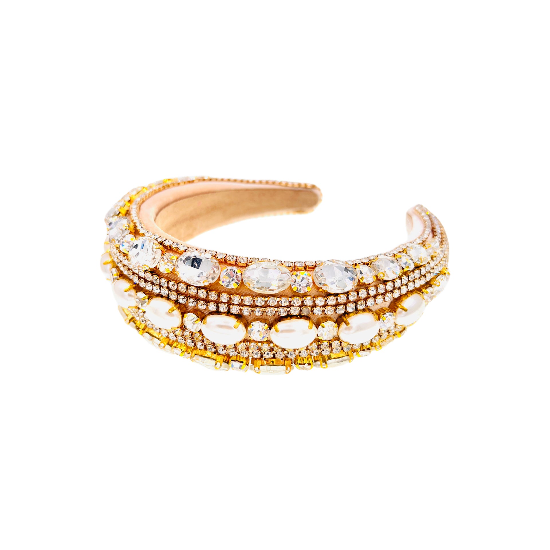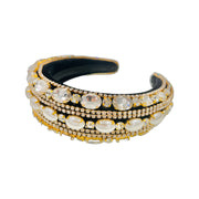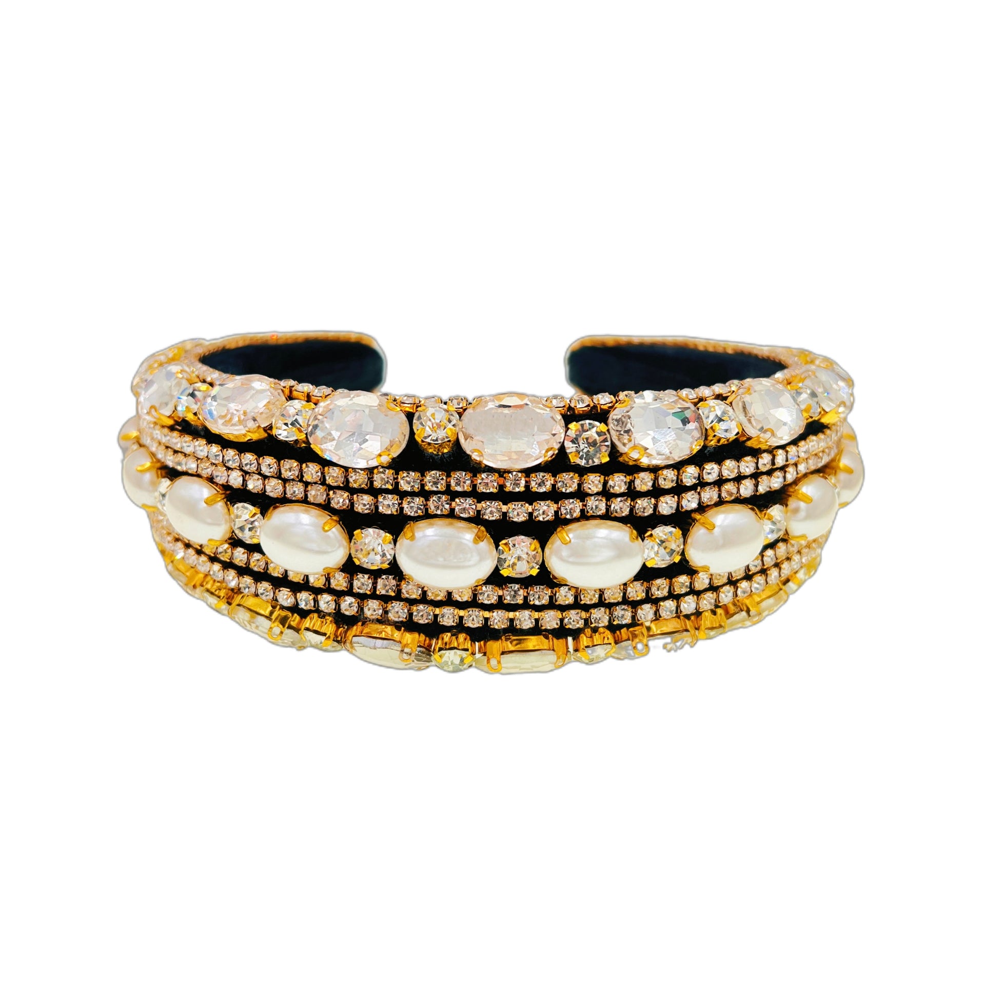 Along the arch of the band, oversized rhinestones are arranged in graceful curves, seamlessly blended with petite fillers to enhance dimension. The centerline is adorned with a striking ring of oval pearls and round-cut crystals, creating a visual rhythm rich in depth and refinement.