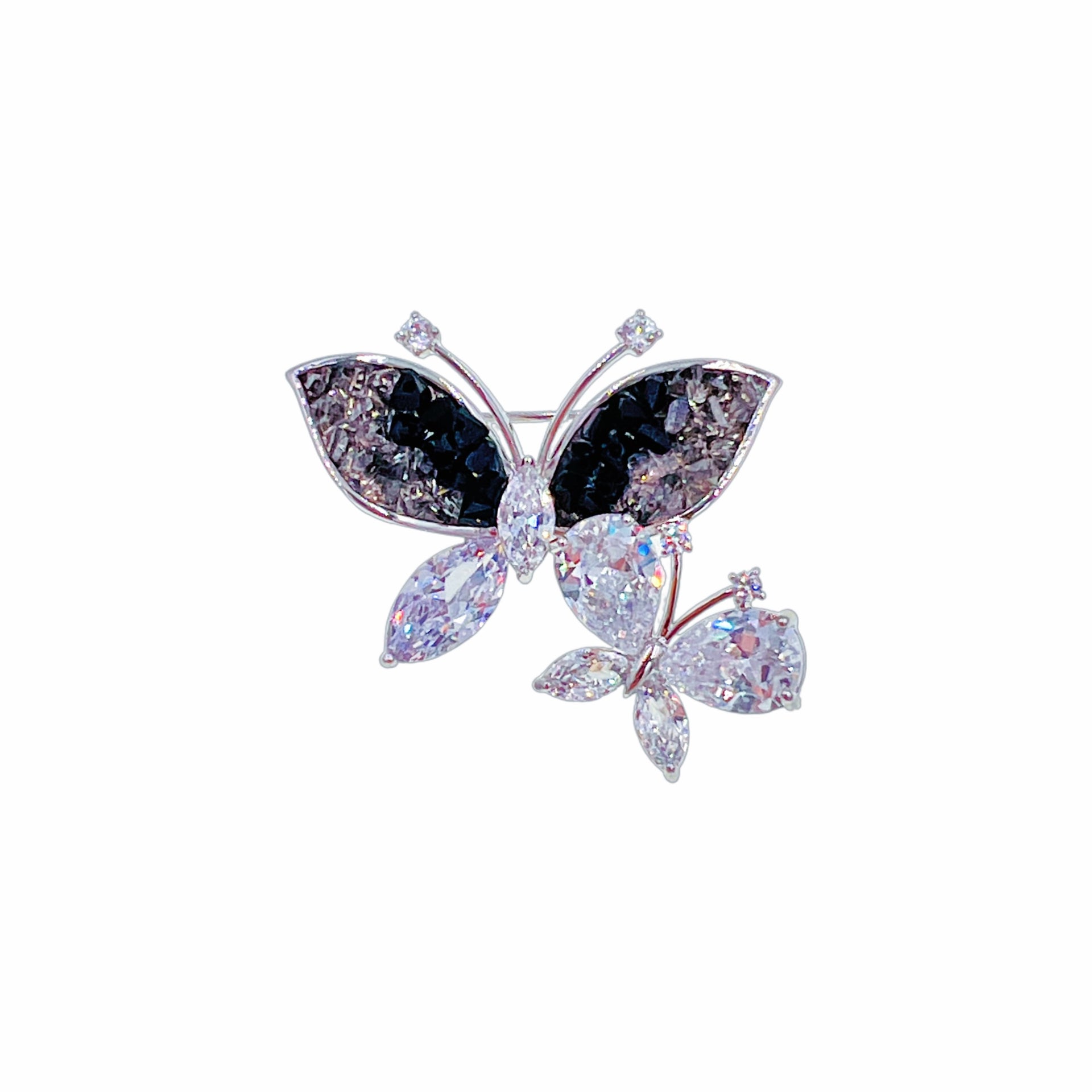 The larger butterfly’s wings are set with black and light-toned crushed crystals, creating a unique texture and depth. In contrast, the smaller butterfly is delicately outlined in clear zirconia, radiating a pure and ethereal glow—like a flickering reflection.