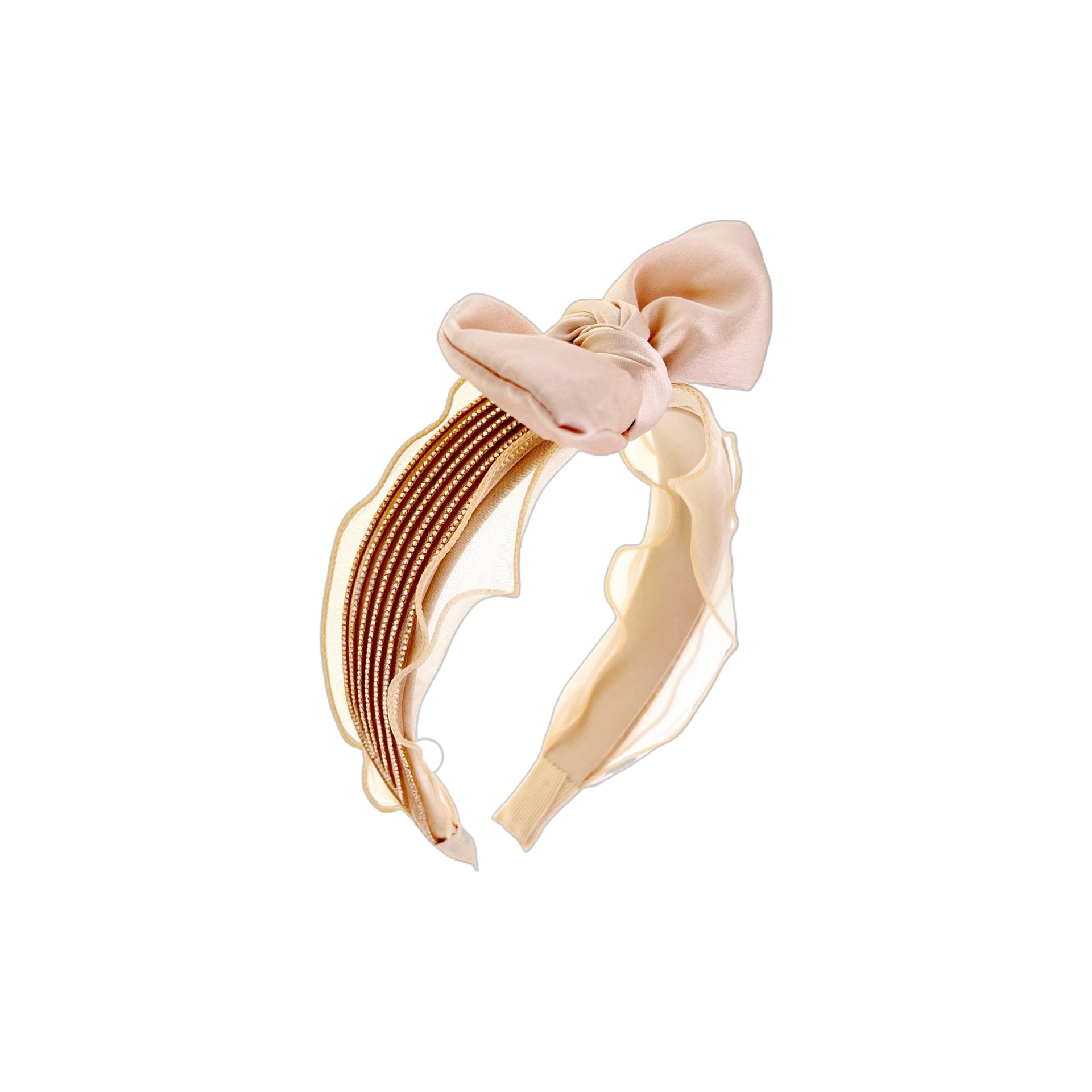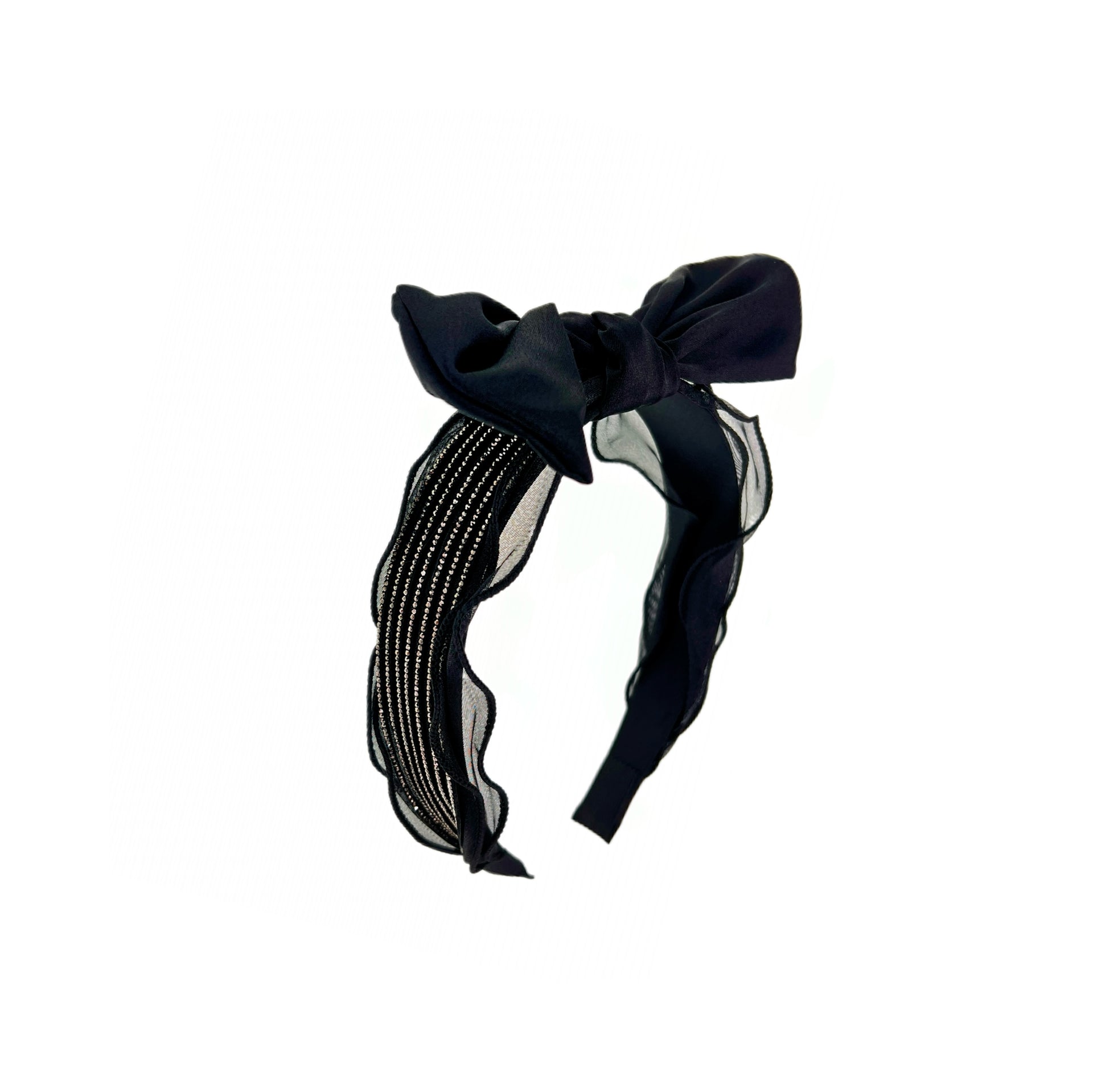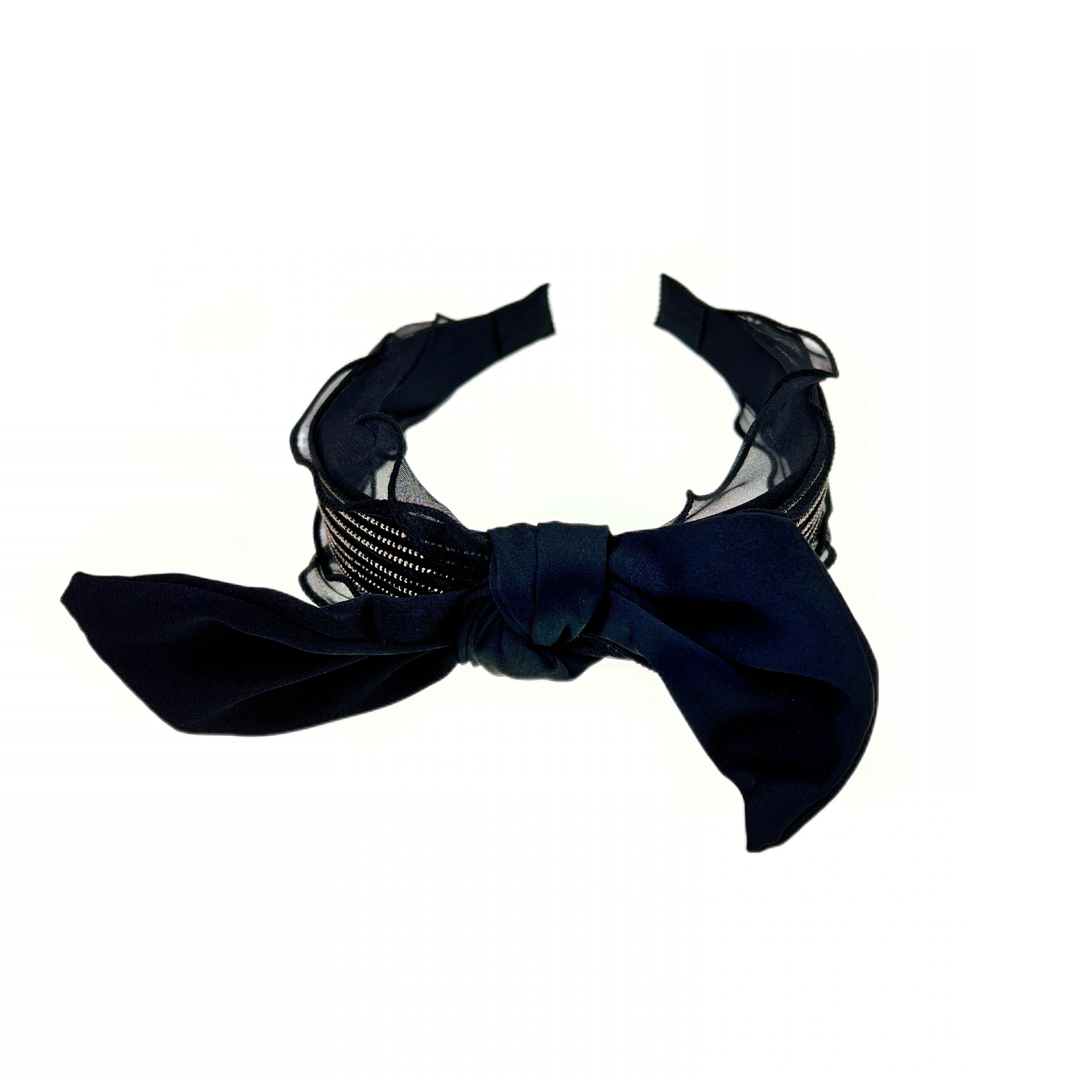 At the center sits an oversized, hand-tied bow—movable and fully detachable—allowing you to transform your look with ease. One headband, two refined styles: wear it with the bow for a statement, or without for subtle sophistication.