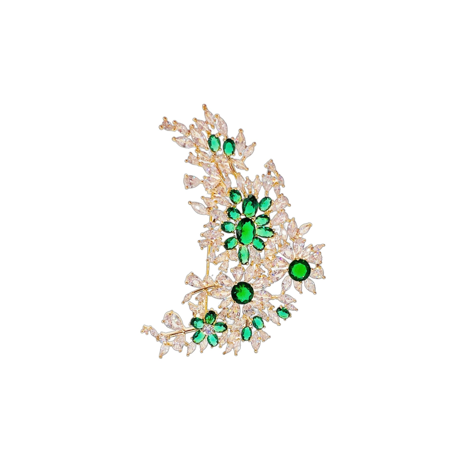 Graceful golden stems flow in a gentle curve, adorned with delicately carved transparent cubic zirconia leaves and petals.