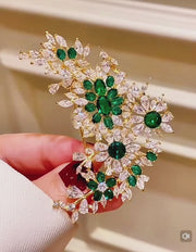 At the heart of the piece, blossoms and buds of vivid green are rendered in brilliant lab-created emeralds, scattered organically like nature’s most radiant moments of green.