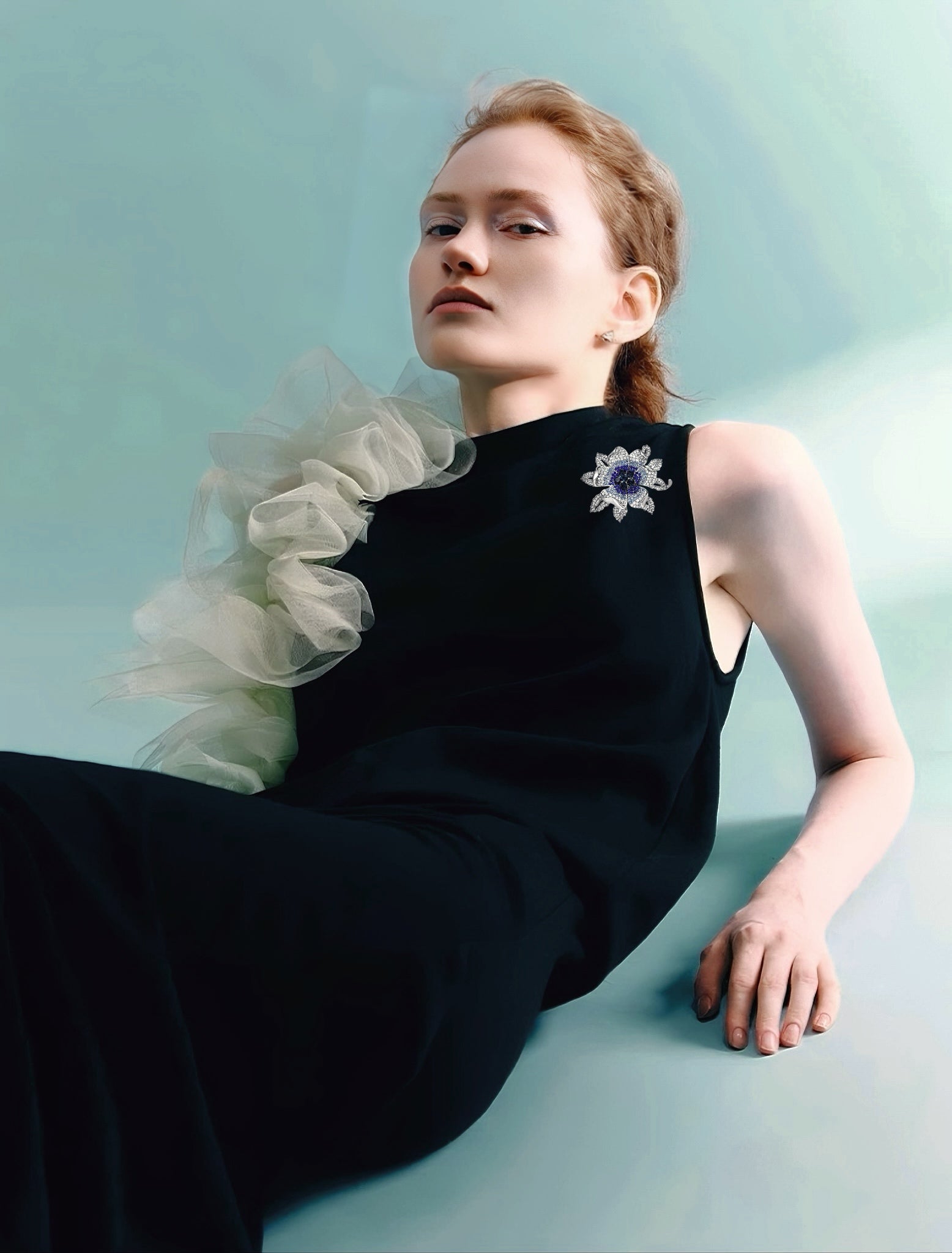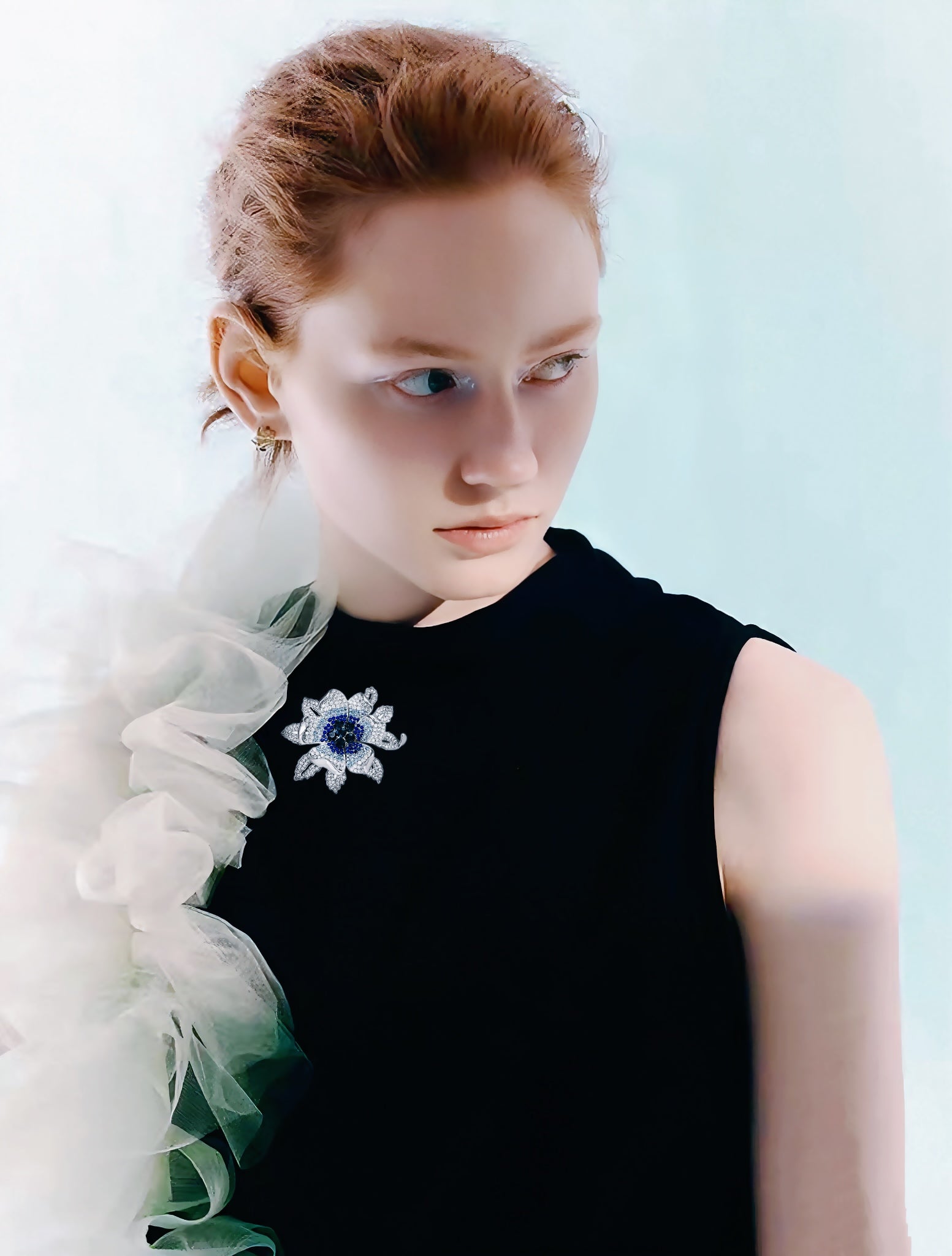 Unlike conventional flat silhouettes, this brooch features a fully dimensional floral form created through precise metal shaping and gemstone layering. Each petal appears naturally curled and asymmetrically layered, capturing the delicate trembling of a blossom stirred by a gentle breeze—imbuing the piece with graceful motion and sculptural tension. -