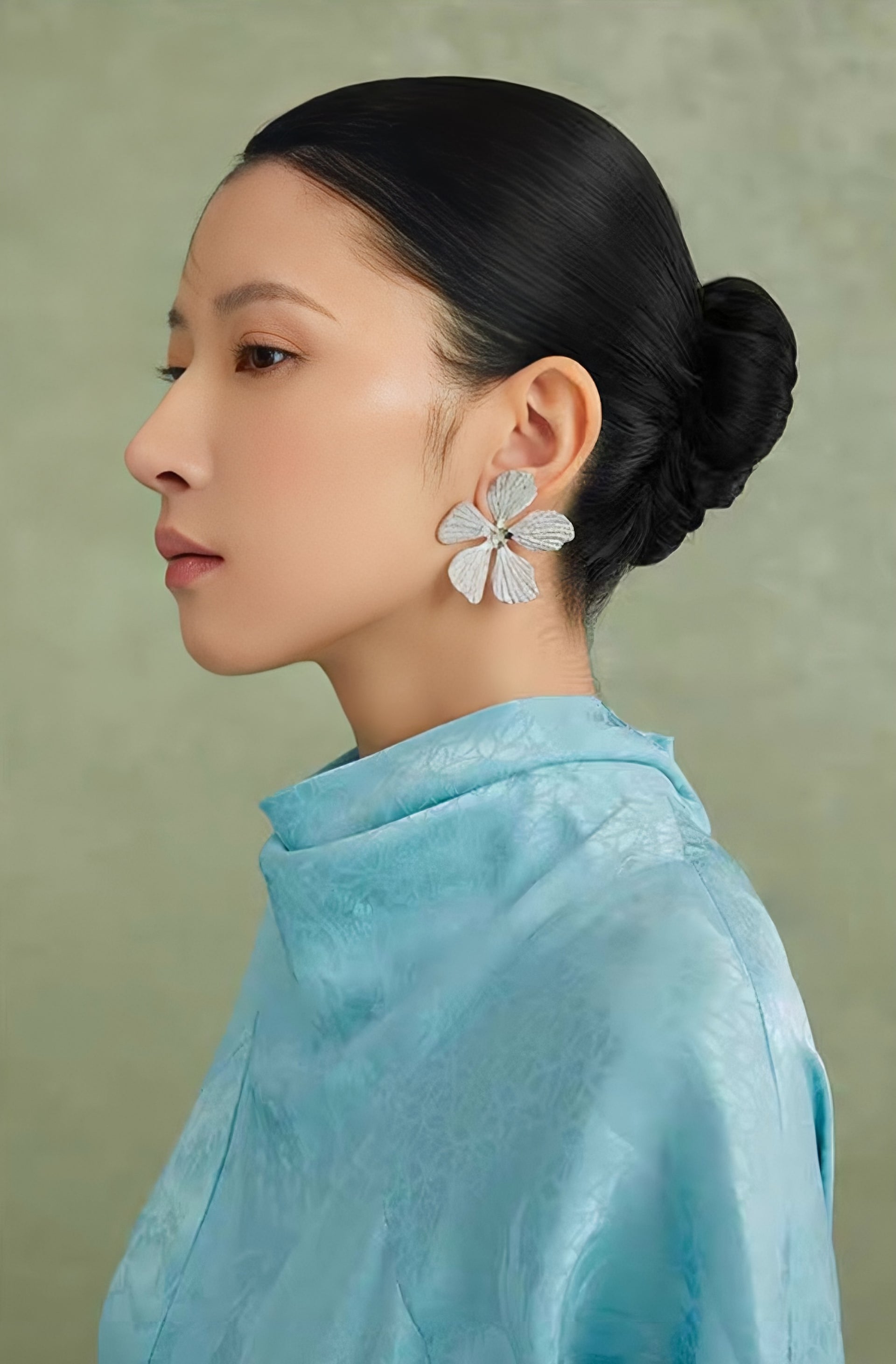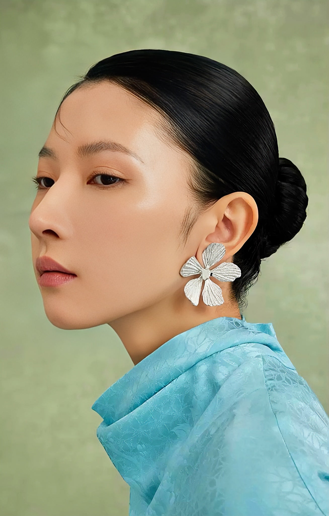 Inspired by delicate petals, each piece features a brushed finish that reveals soft matte textures under light, gracefully contrasted by a high-polish center that gleams like moonlight. Available in gold and silver tones, this design captures the quiet poetry of evening light—serene, sophisticated, and timeless.