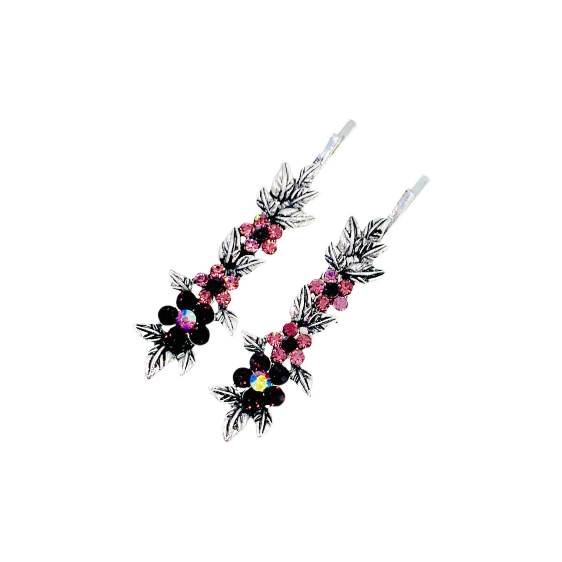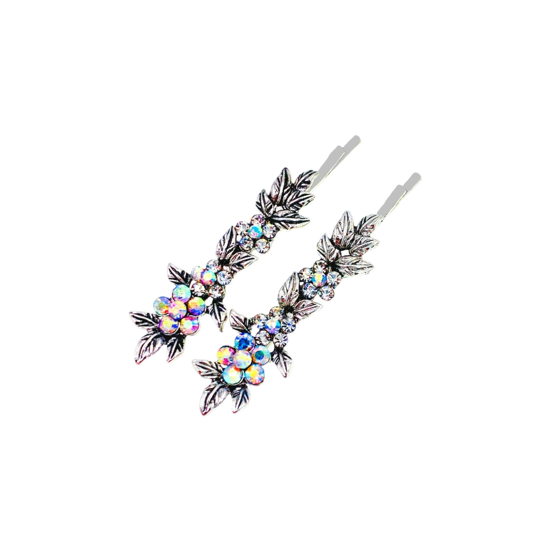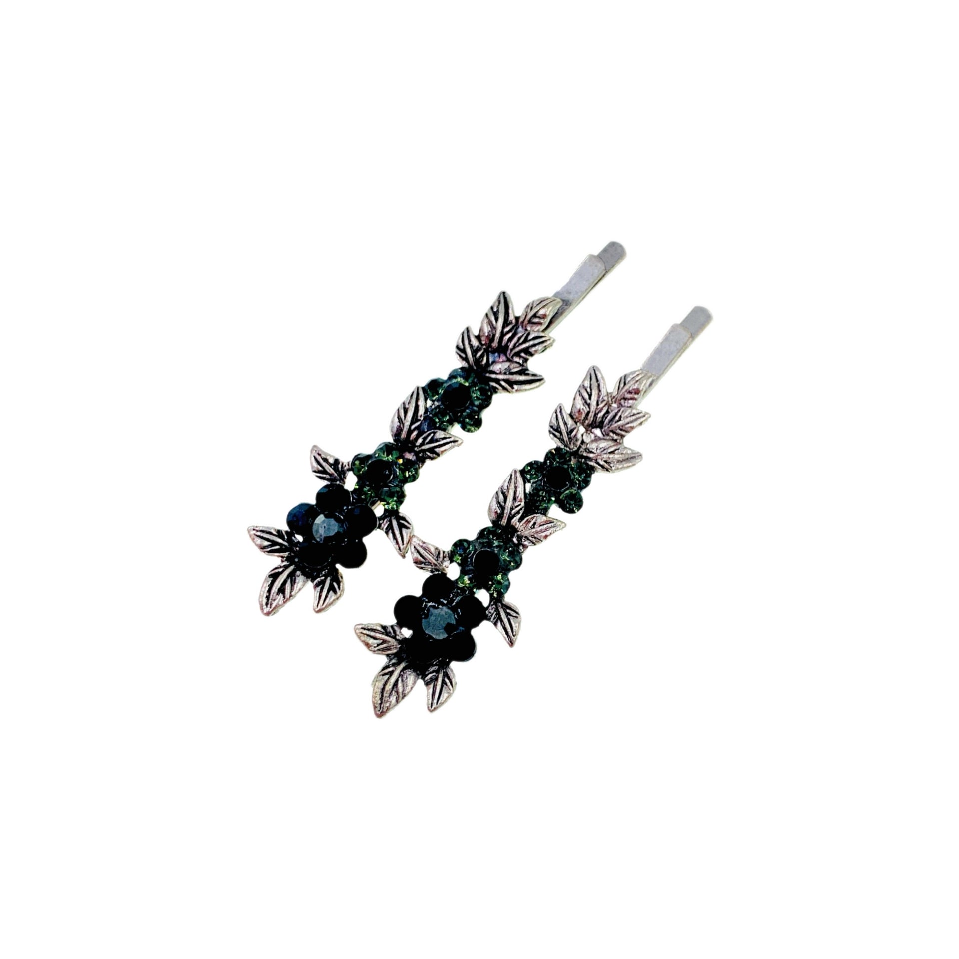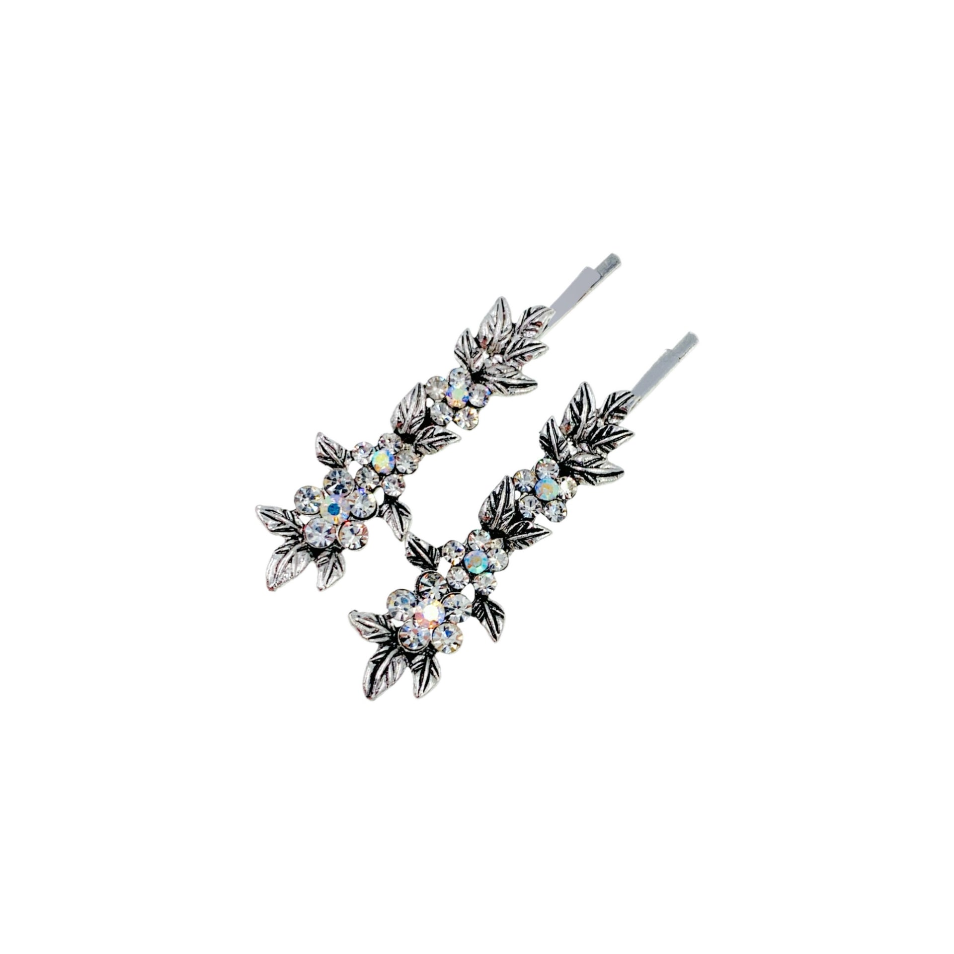 Part of the Secret Garden Series, this vintage-style bobby pin features a slender frame adorned with delicately crafted metal leaves, each etched with fine vein patterns and finished with an antique patina. The weathered surface evokes a sense of timeworn beauty and natural grace. Scattered along the design are petite rhinestone blossoms in varying colors, blooming softly between the leaves like wildflowers in a shaded glade. The result is a piece that blends the structure of metal with the gentle fluidity of nature.