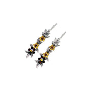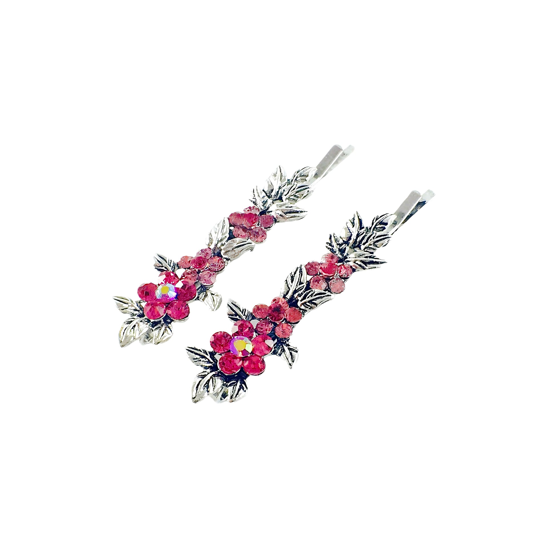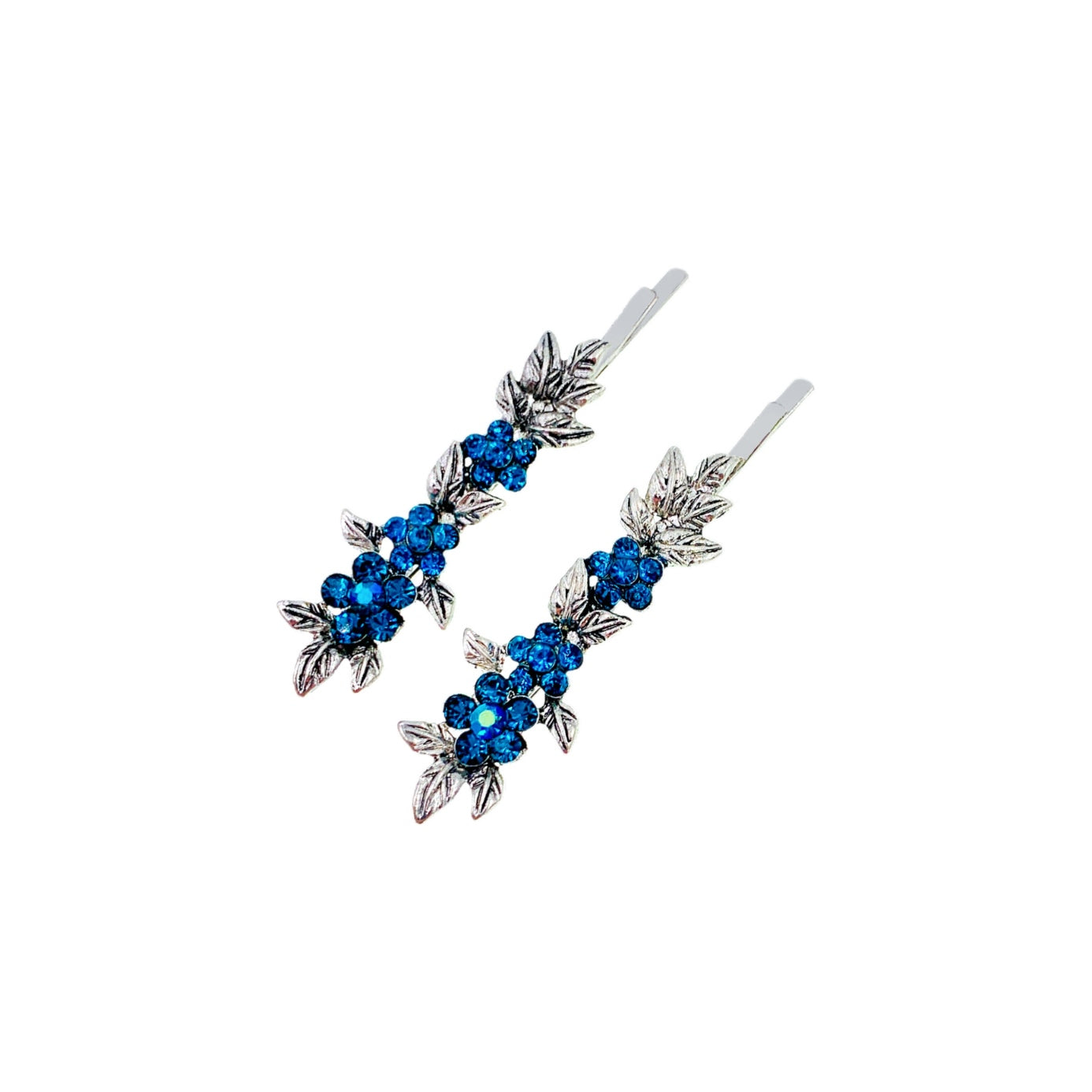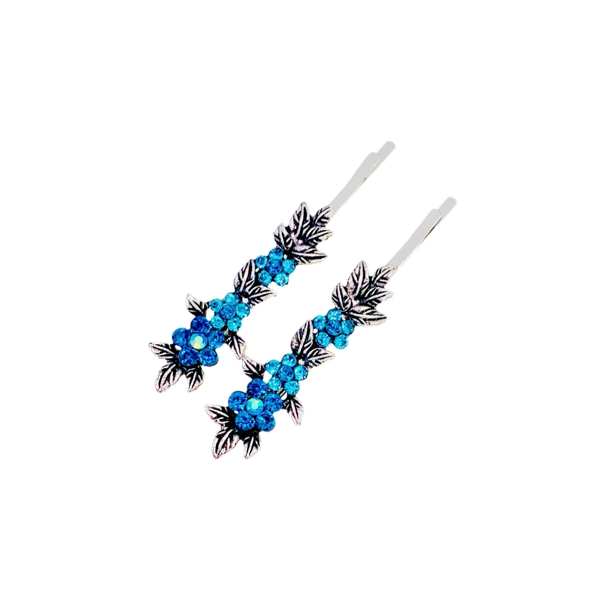 Part of the Secret Garden Series, this vintage-style bobby pin features a slender frame adorned with delicately crafted metal leaves, each etched with fine vein patterns and finished with an antique patina. The weathered surface evokes a sense of timeworn beauty and natural grace. Scattered along the design are petite rhinestone blossoms in varying colors, blooming softly between the leaves like wildflowers in a shaded glade. The result is a piece that blends the structure of metal with the gentle fluidity of nature.