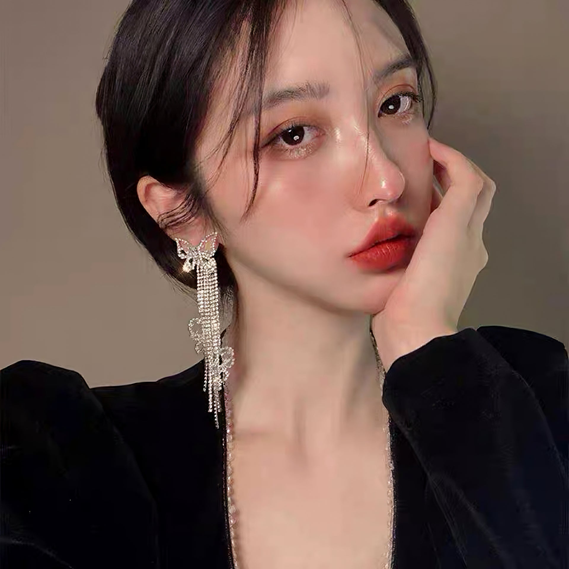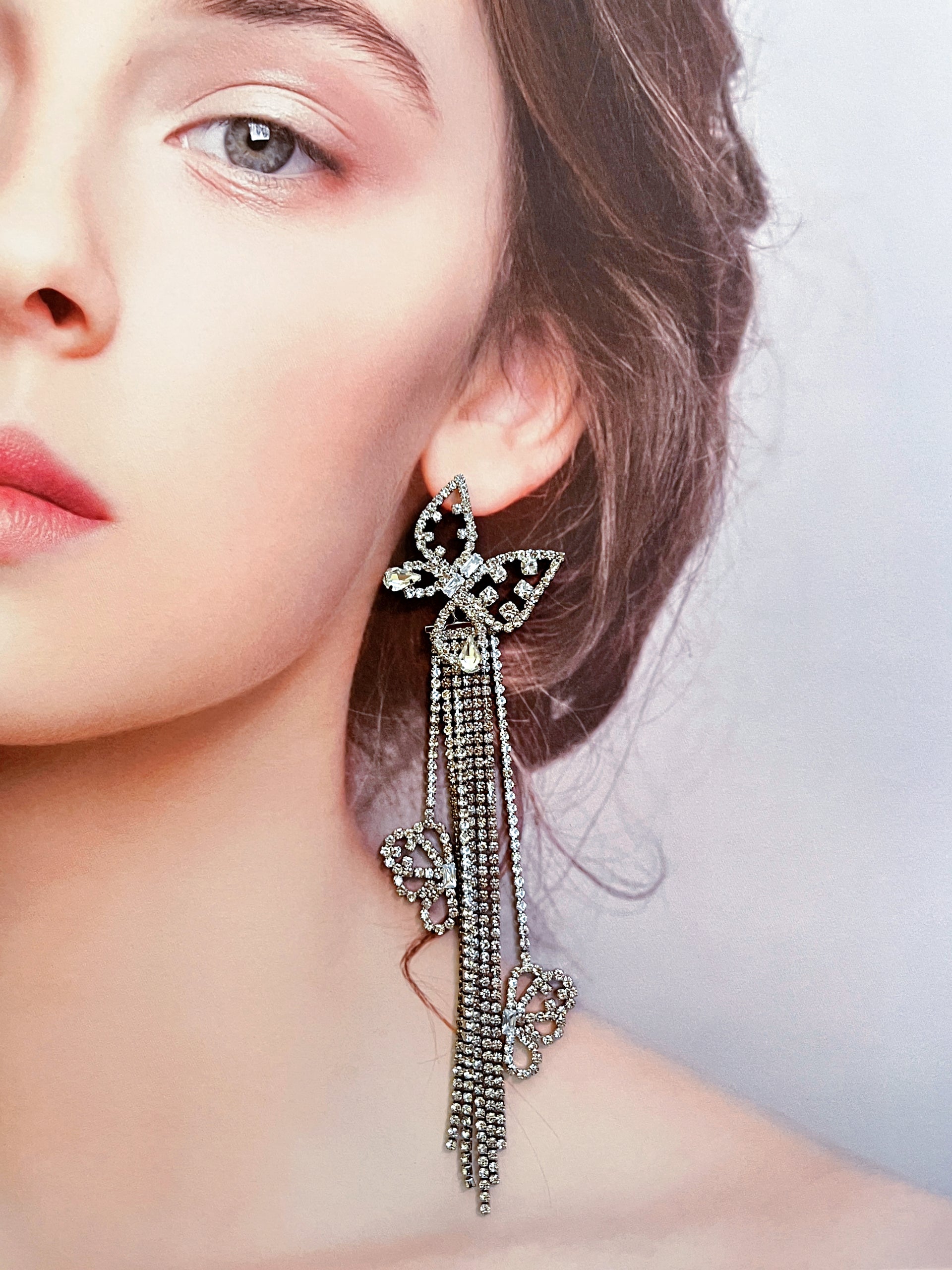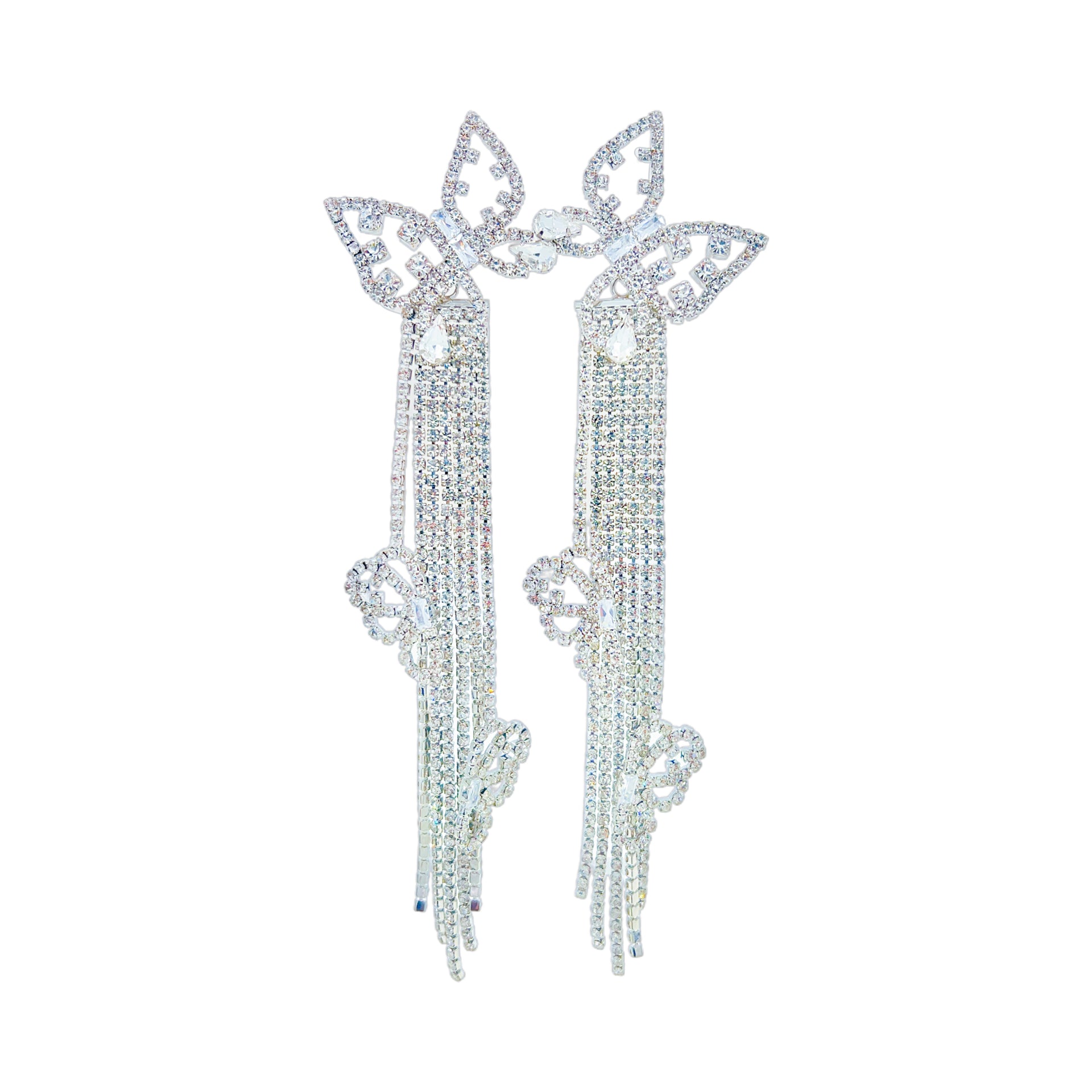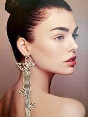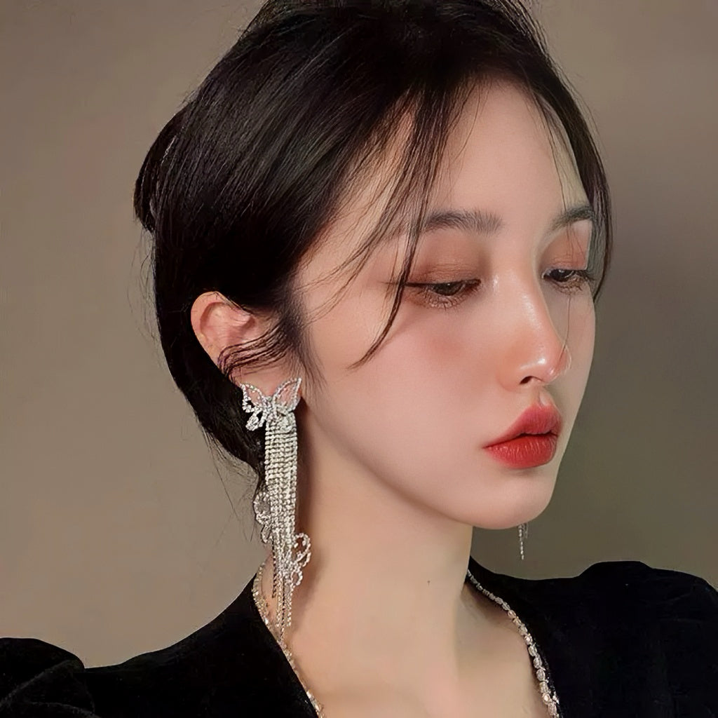 Inspired by the graceful lightness of butterflies, these earrings feature a delicate openwork butterfly design in platinum tones, intricately micro-paved with zircon stones for a refined sparkle. Cascading tassels hang below, adorned with dainty floral accents—elegant, luminous, and full of dimension.