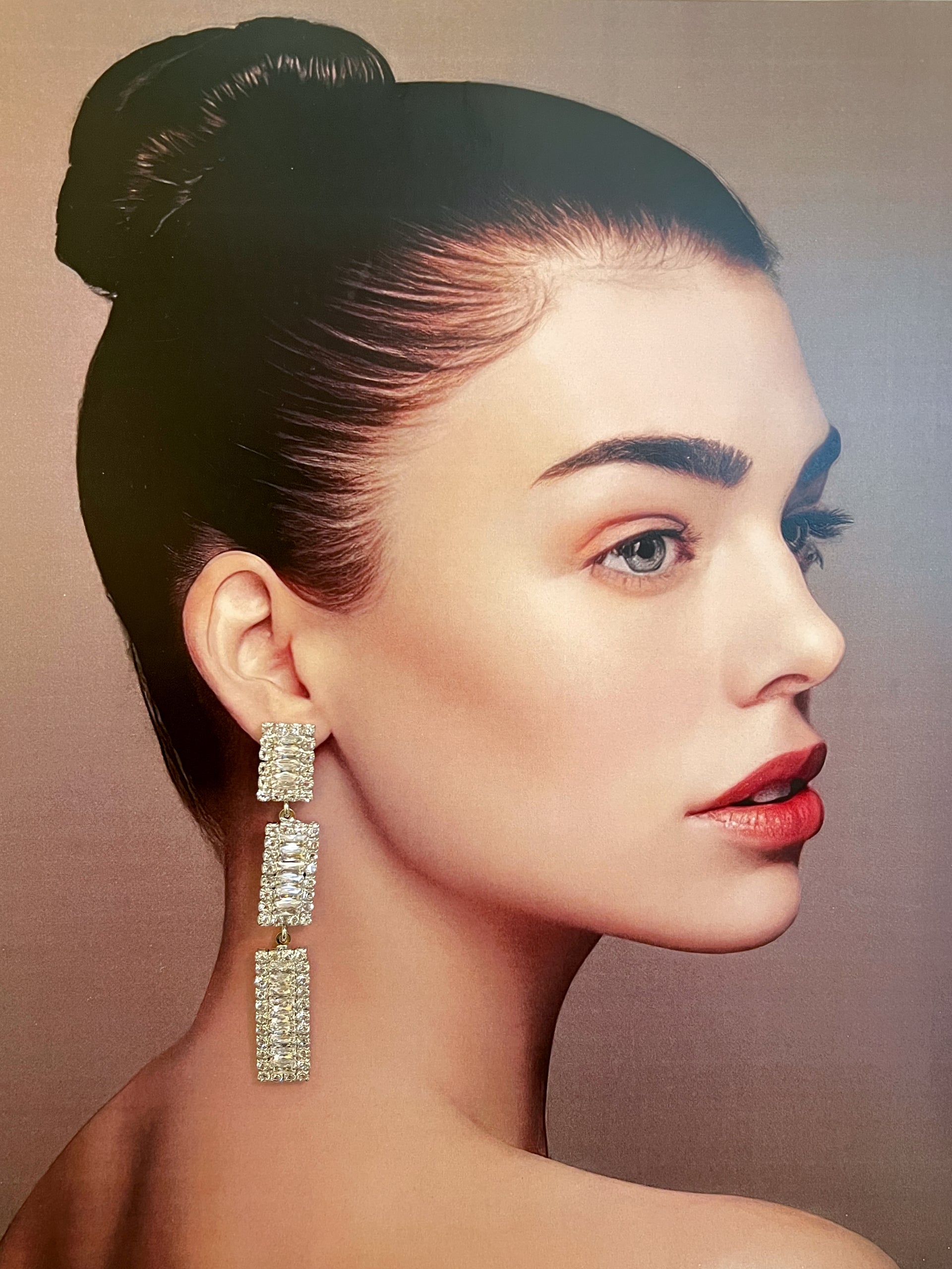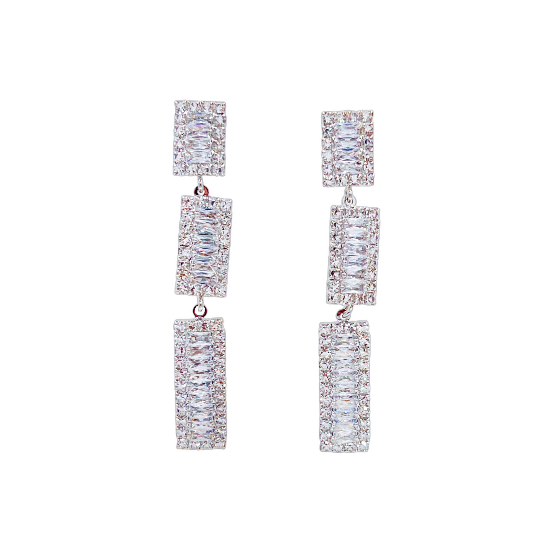 A striking interplay of geometry and light. These earrings feature a cascading trio of rectangular frames, each edged with pavé stones and centered with baguette-cut gems—creating a sculptural sense of depth and dimension.
