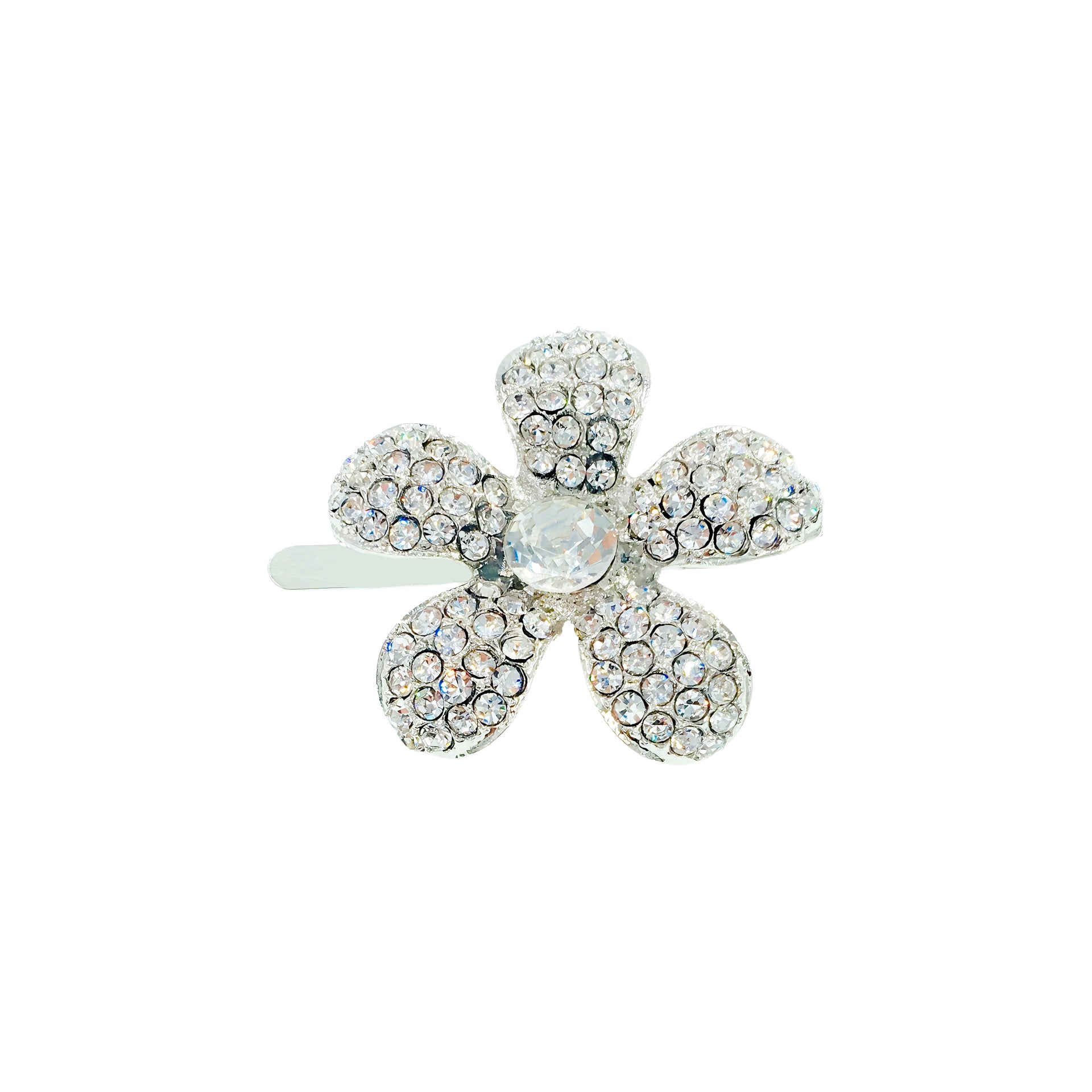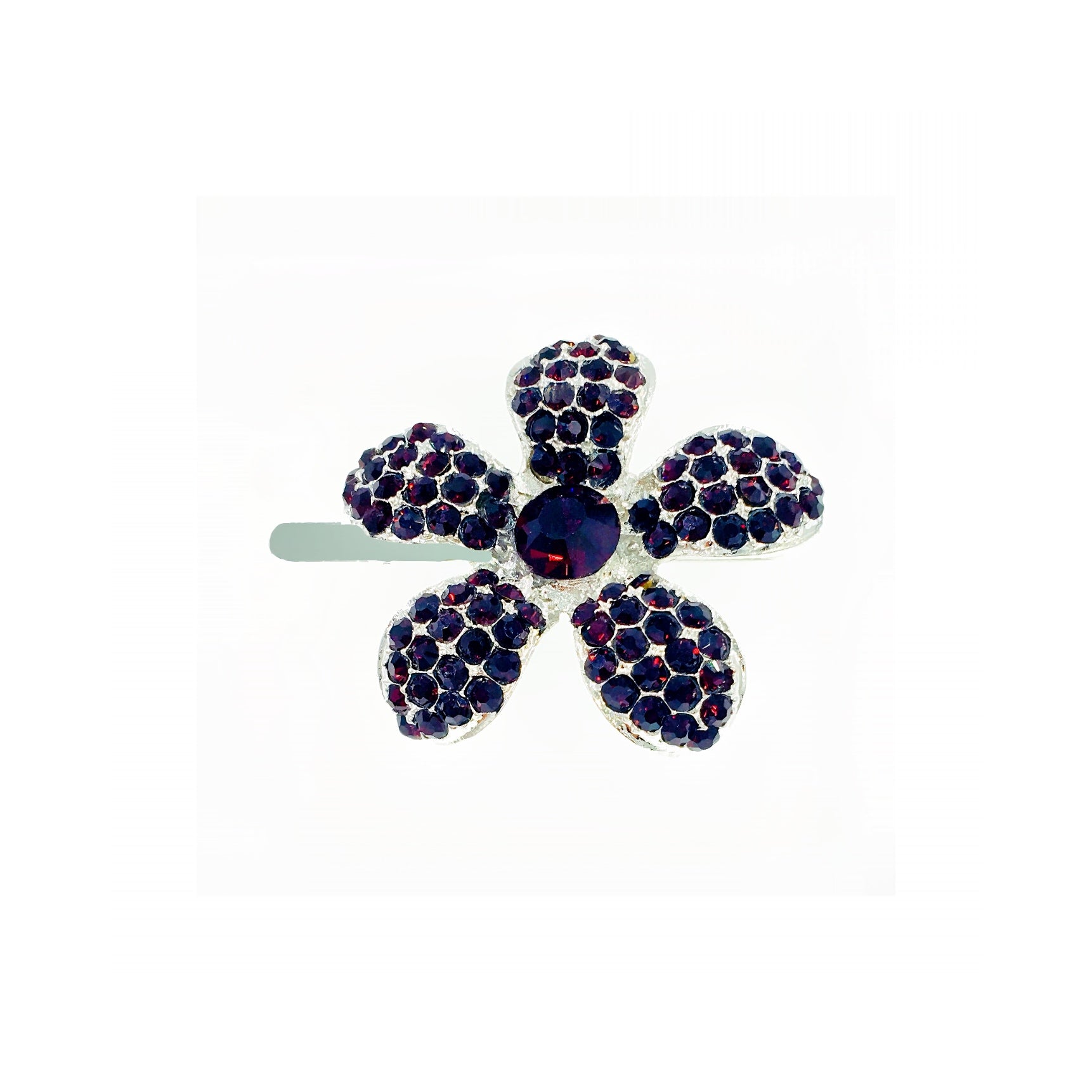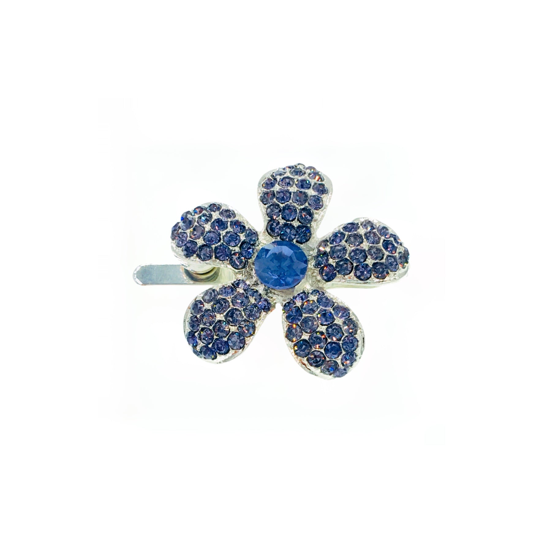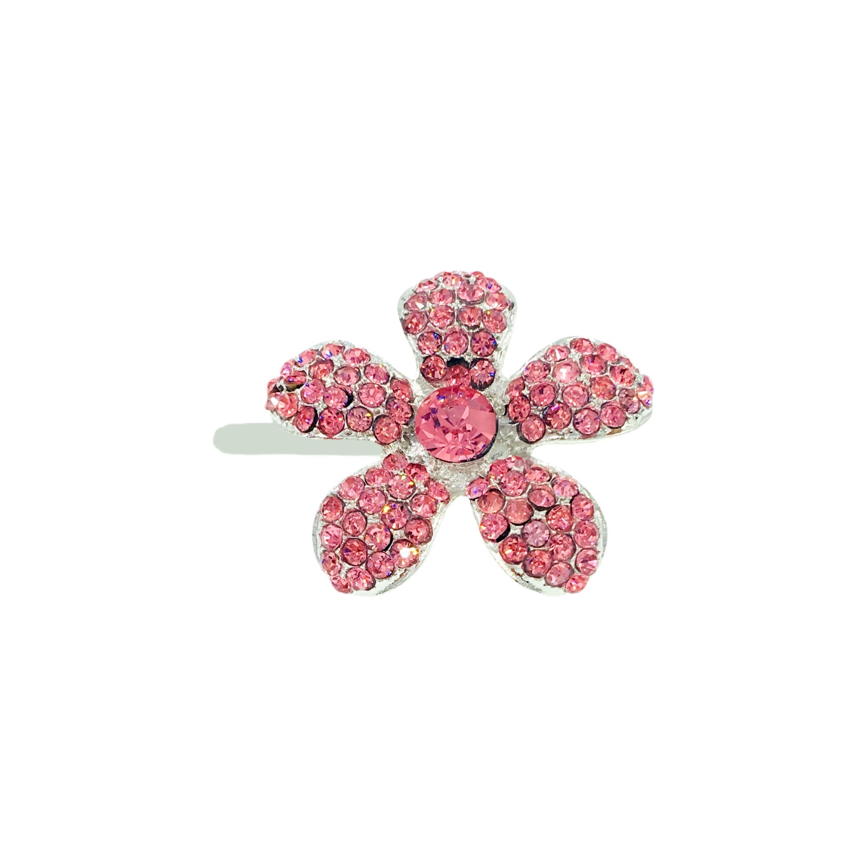 Shaped like a five-petal periwinkle bloom, each piece is meticulously handcrafted and set with high-sparkle rhinestones. The center stone complements the surrounding petals, creating a radiant yet refined finish.