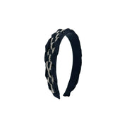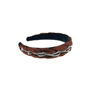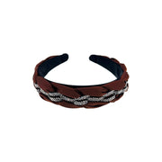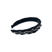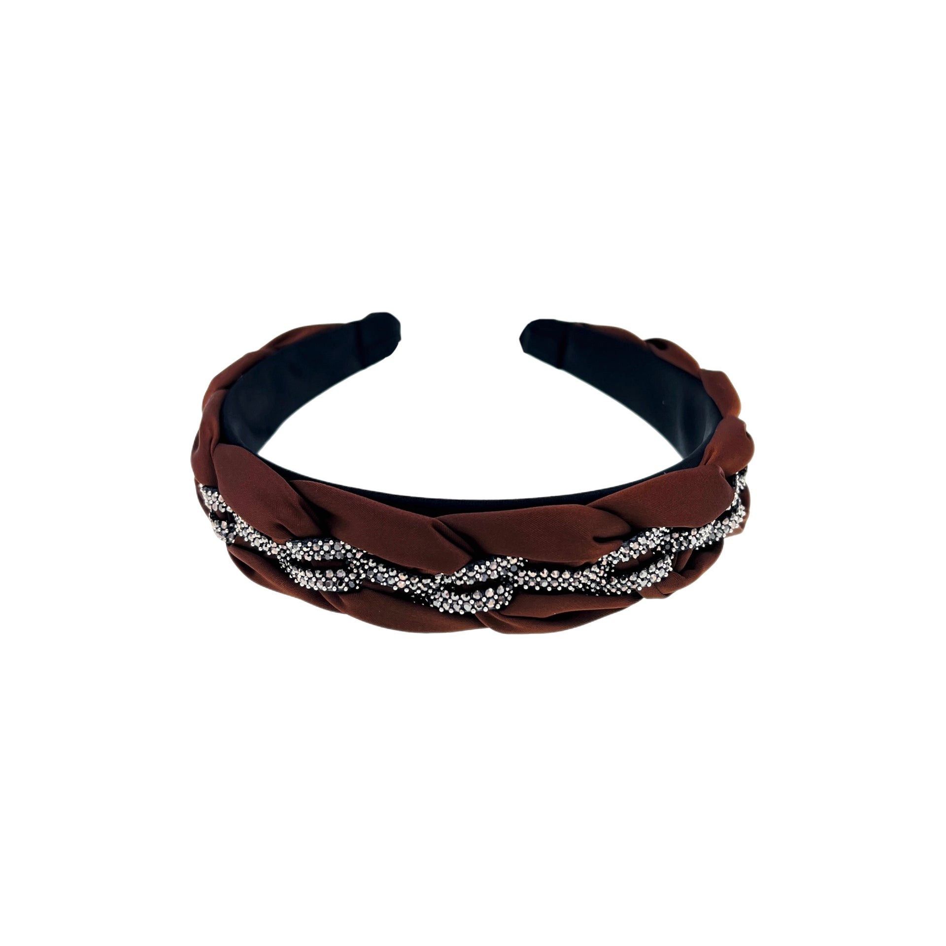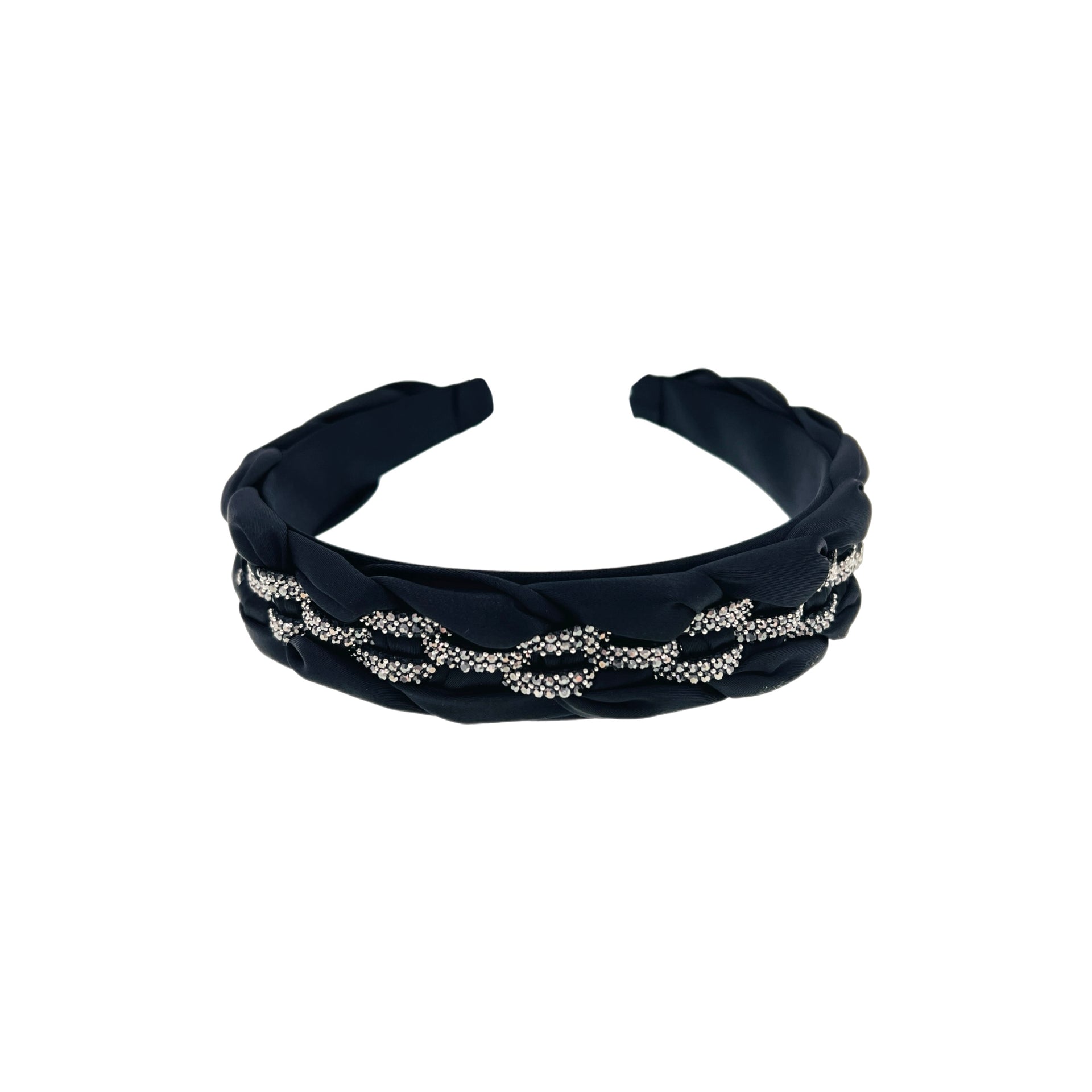 Crafted with a softly lustrous acetate fabric, this headband features a braided base that embodies the elegance of French craftsmanship. A delicate chain of shimmering rhinestones graces the center, catching the light with refined brilliance. The overall structure is full and dimensional, offering a comfortable and secure fit.