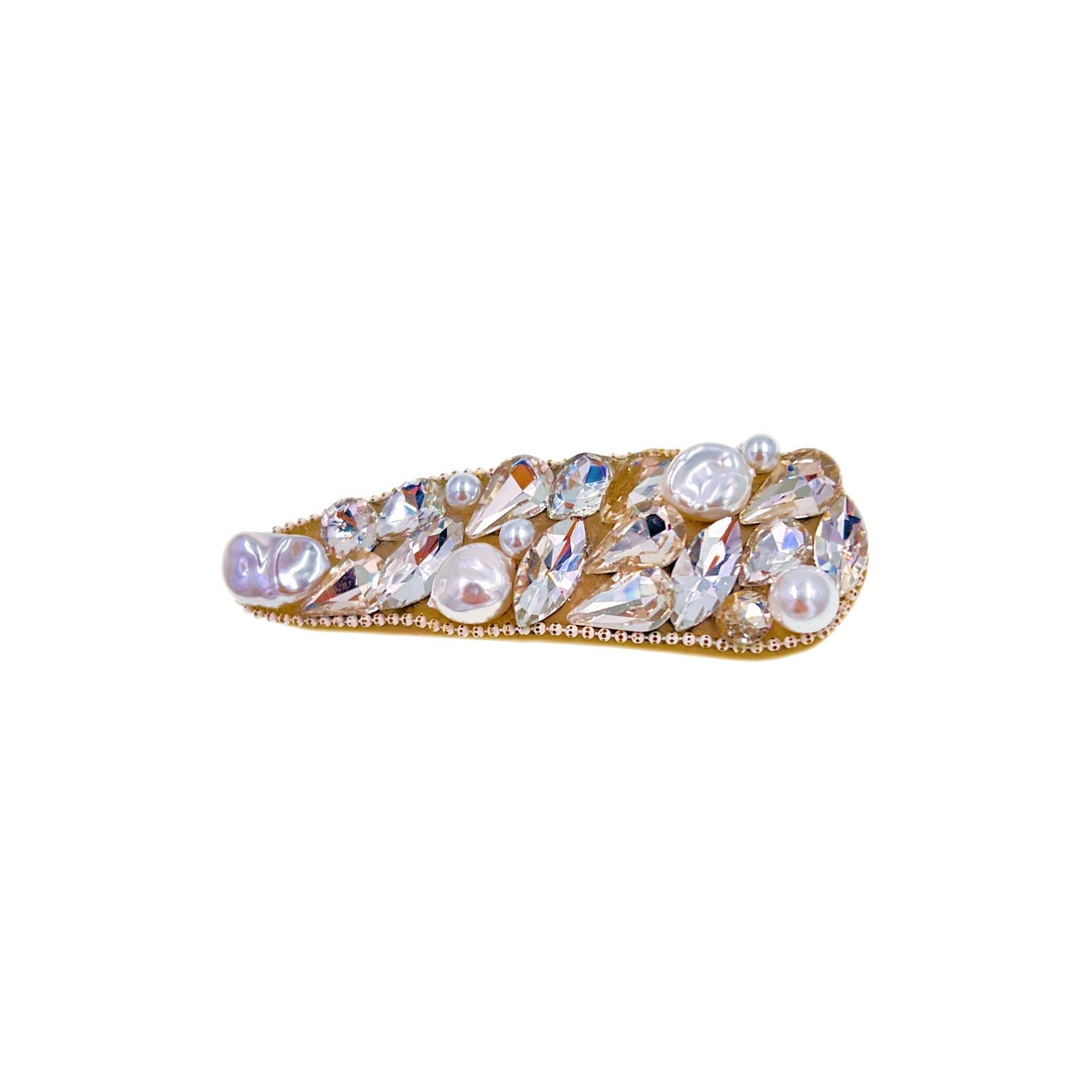 Elevate your look with a touch of artful elegance. The Éclat de Perle clip features a soft leather base adorned with a refined mix of classic round pearls and uniquely shaped baroque pearls. The asymmetry of the baroque forms creates a rich sense of depth and texture. Scattered throughout are crystal-cut rhinestones—radiant diamonds, glistening teardrops, and other distinctive shapes—each catching the light in dazzling ways. The design captures a striking balance between the rebellious spirit of baroque style, the timeless grace of pearls, and the luxurious sparkle of rhinestones. A perfect accessory for lovers of modern romanticism.