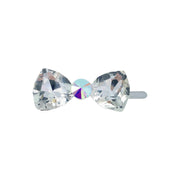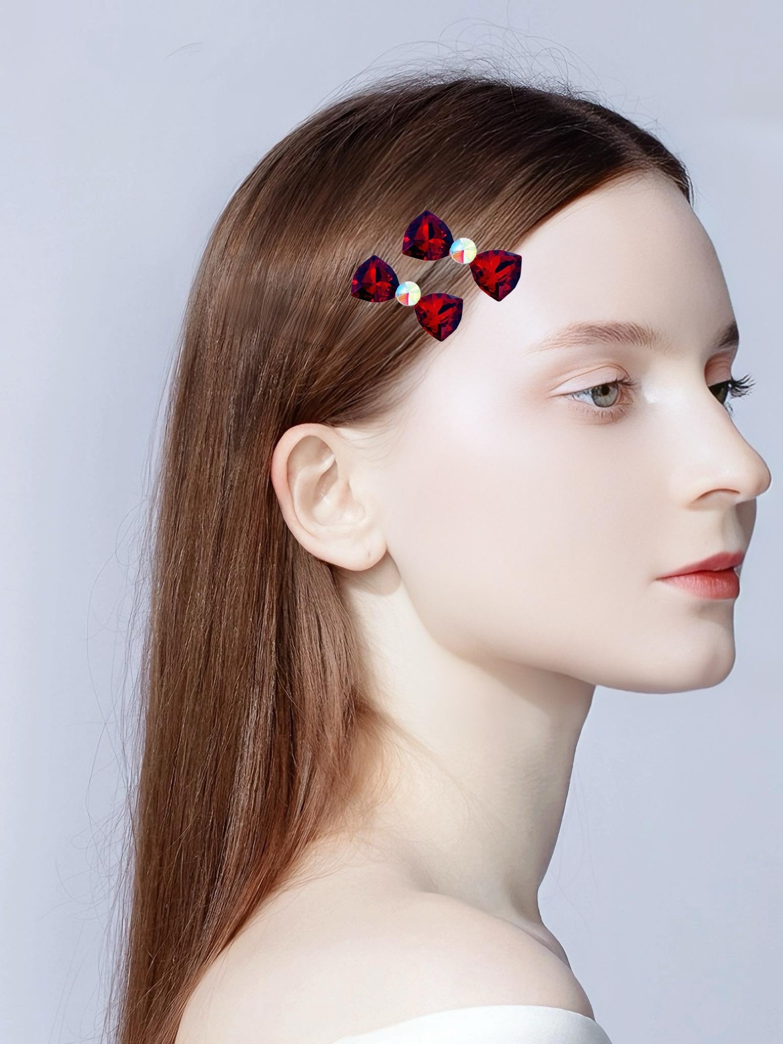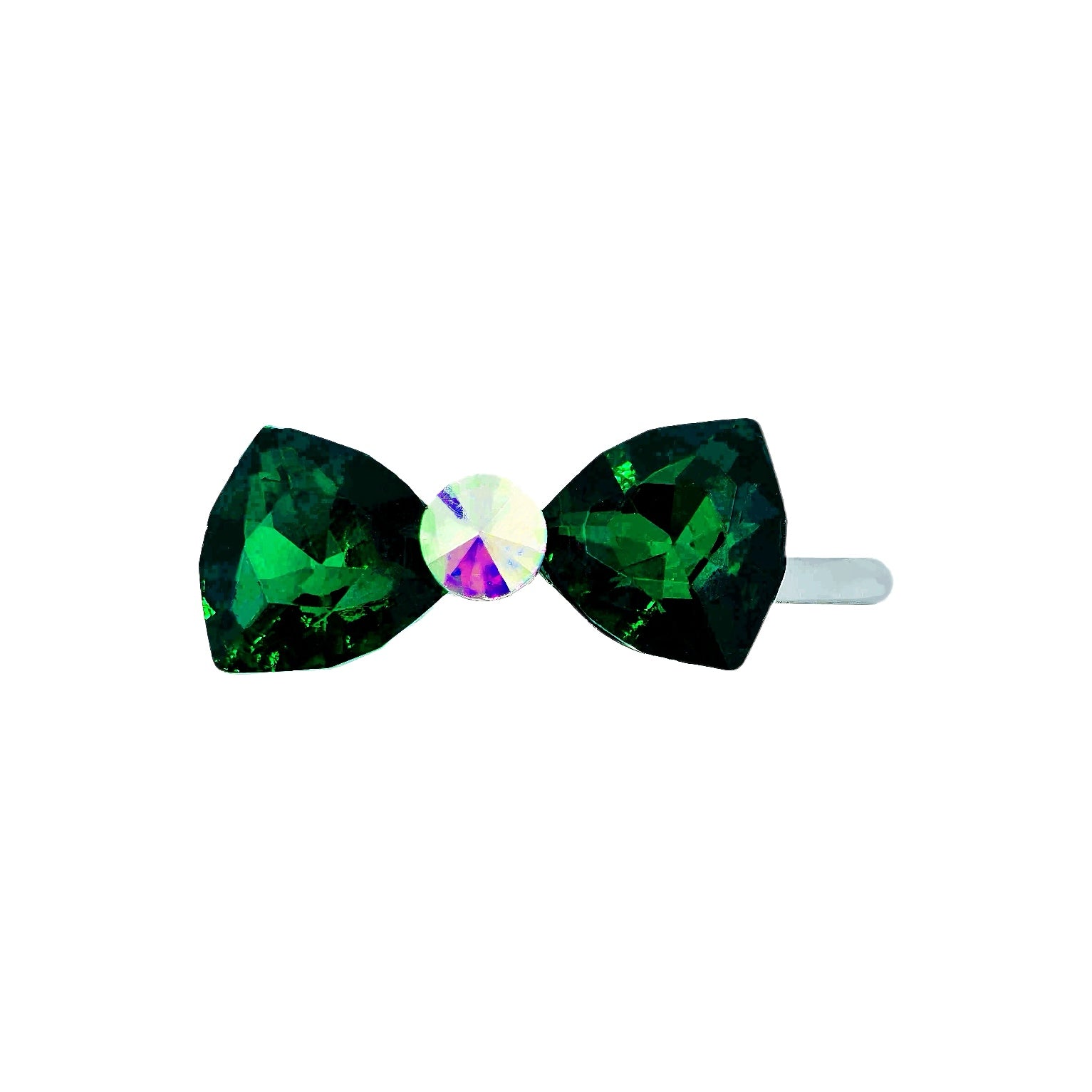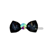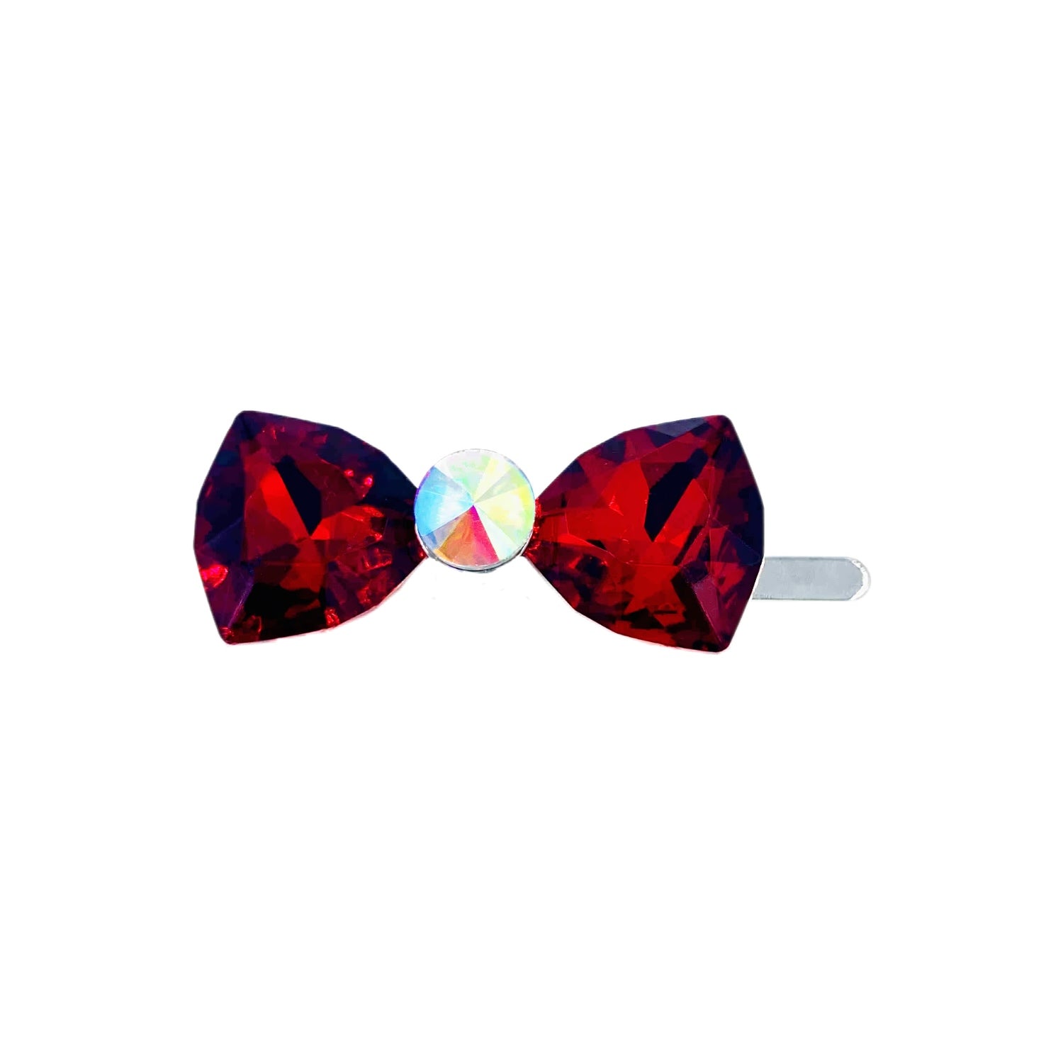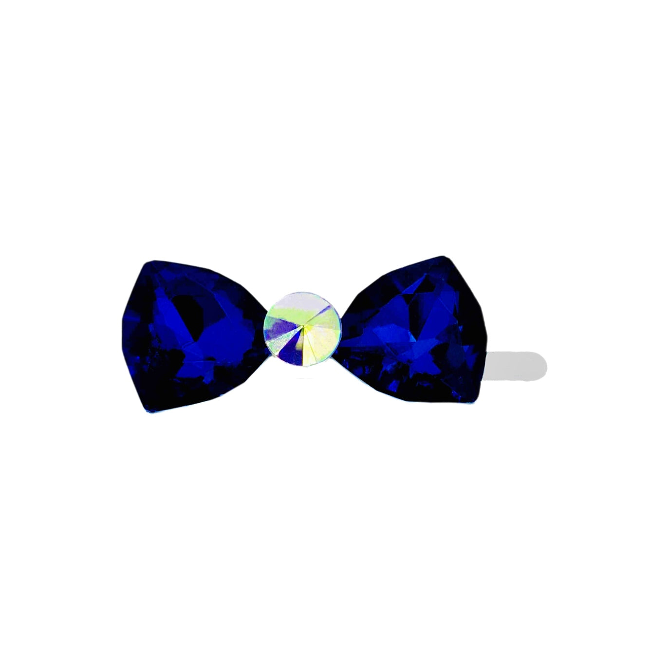 Each side of the bow is set with a large, faceted Czech crystal gemstone — bold yet refined, radiant in color and clarity. A round-cut crystal at the center connects the two sides, creating a seamless silhouette that’s clean, balanced, and subtly feminine.