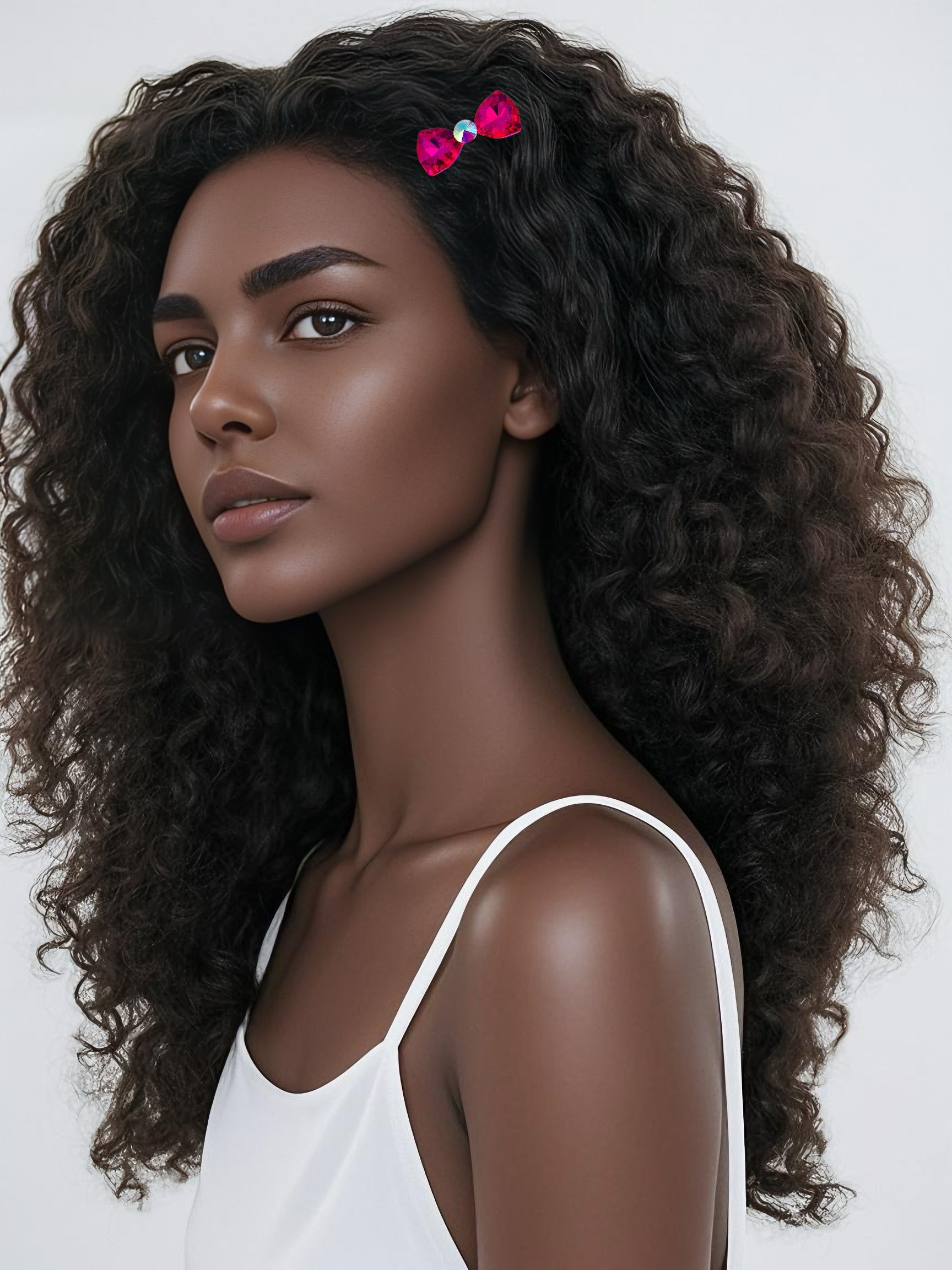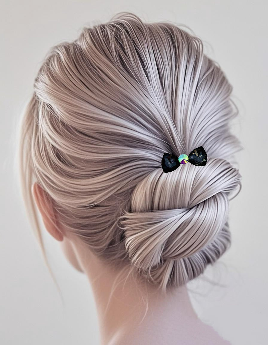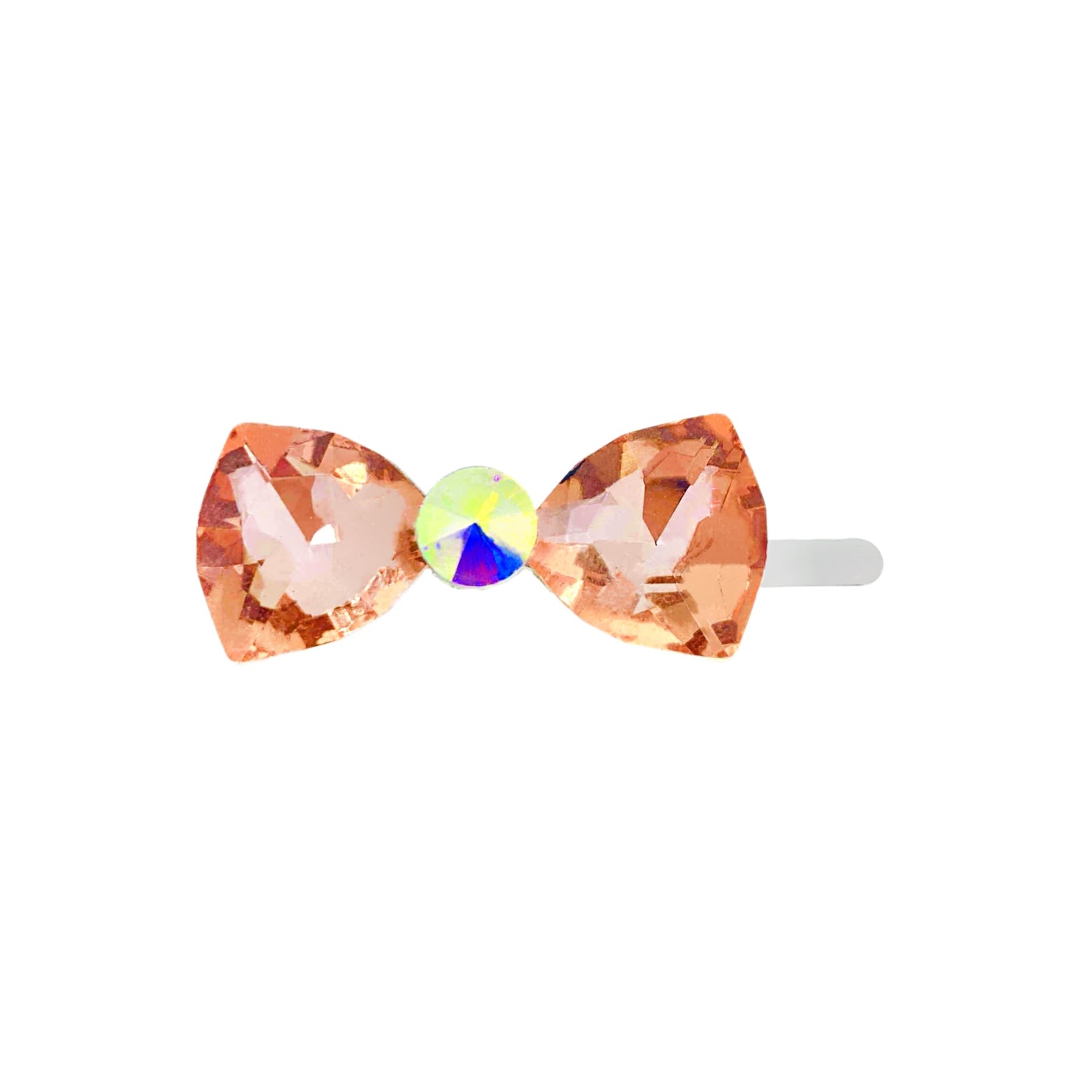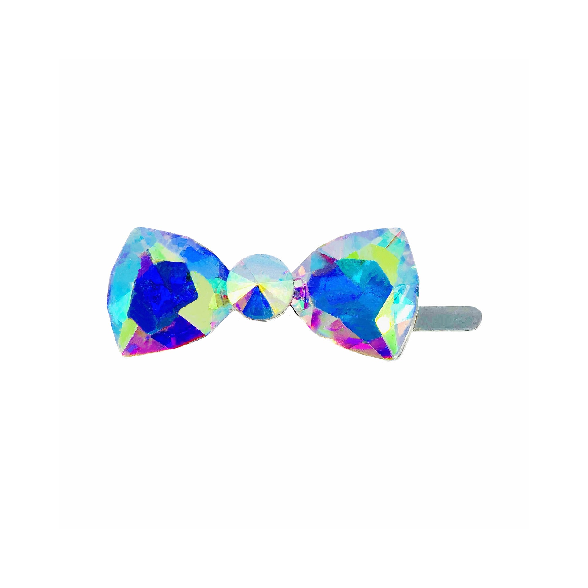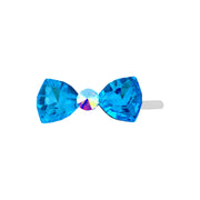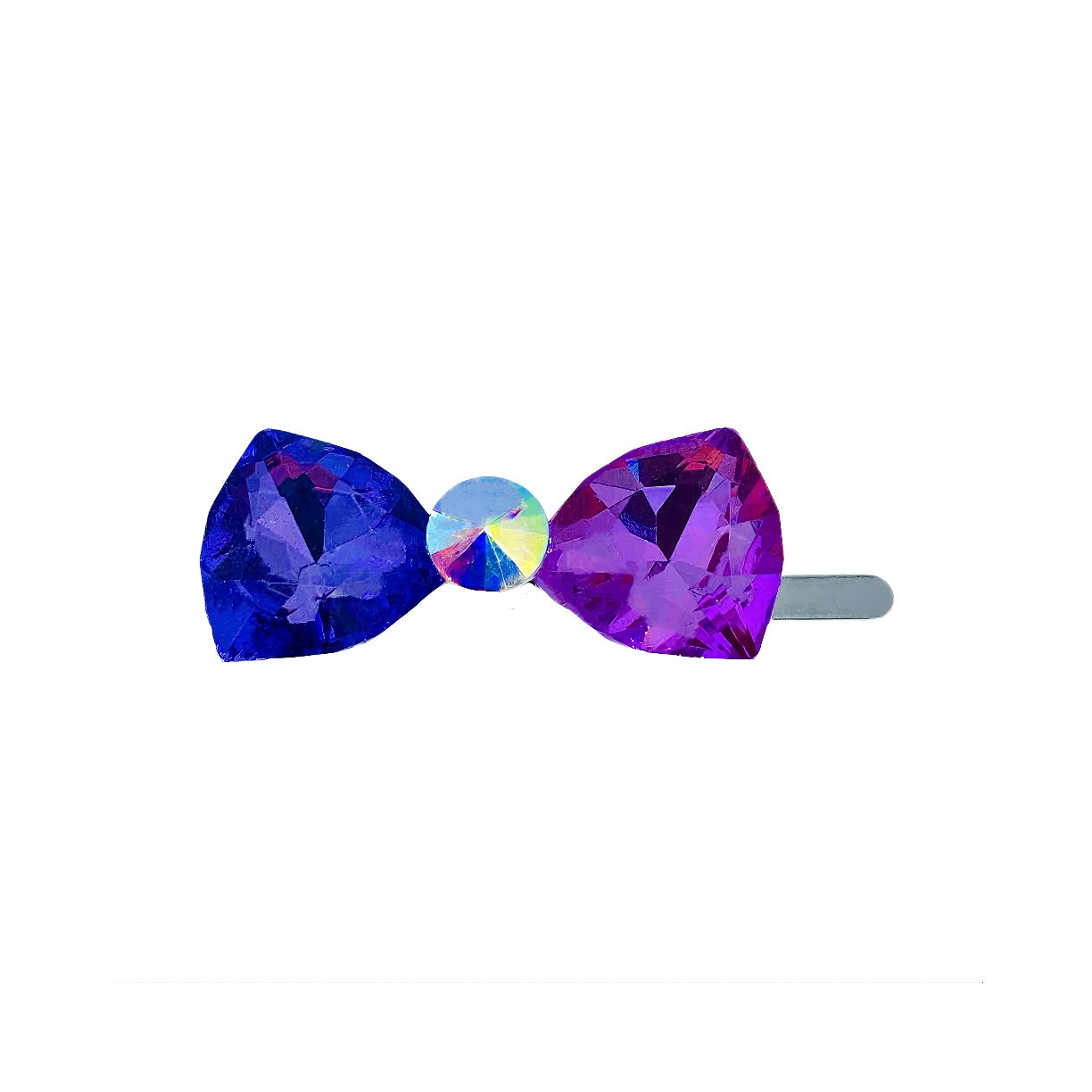 Each side of the bow is set with a large, faceted Czech crystal gemstone — bold yet refined, radiant in color and clarity. A round-cut crystal at the center connects the two sides, creating a seamless silhouette that’s clean, balanced, and subtly feminine.