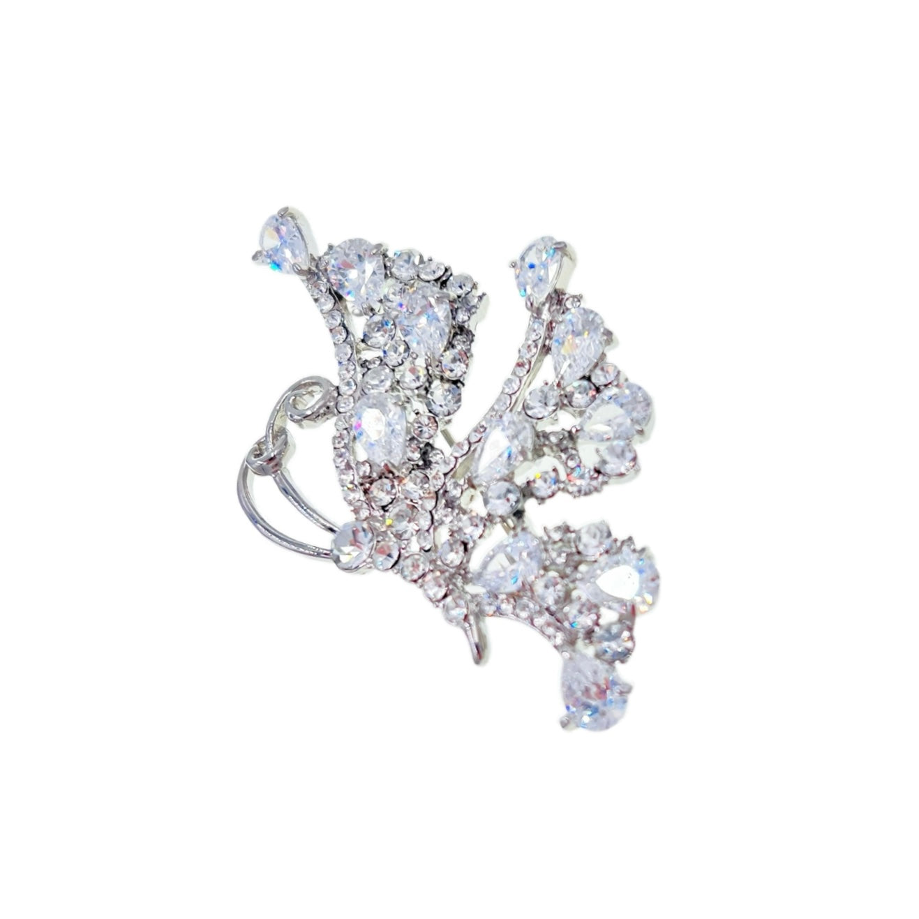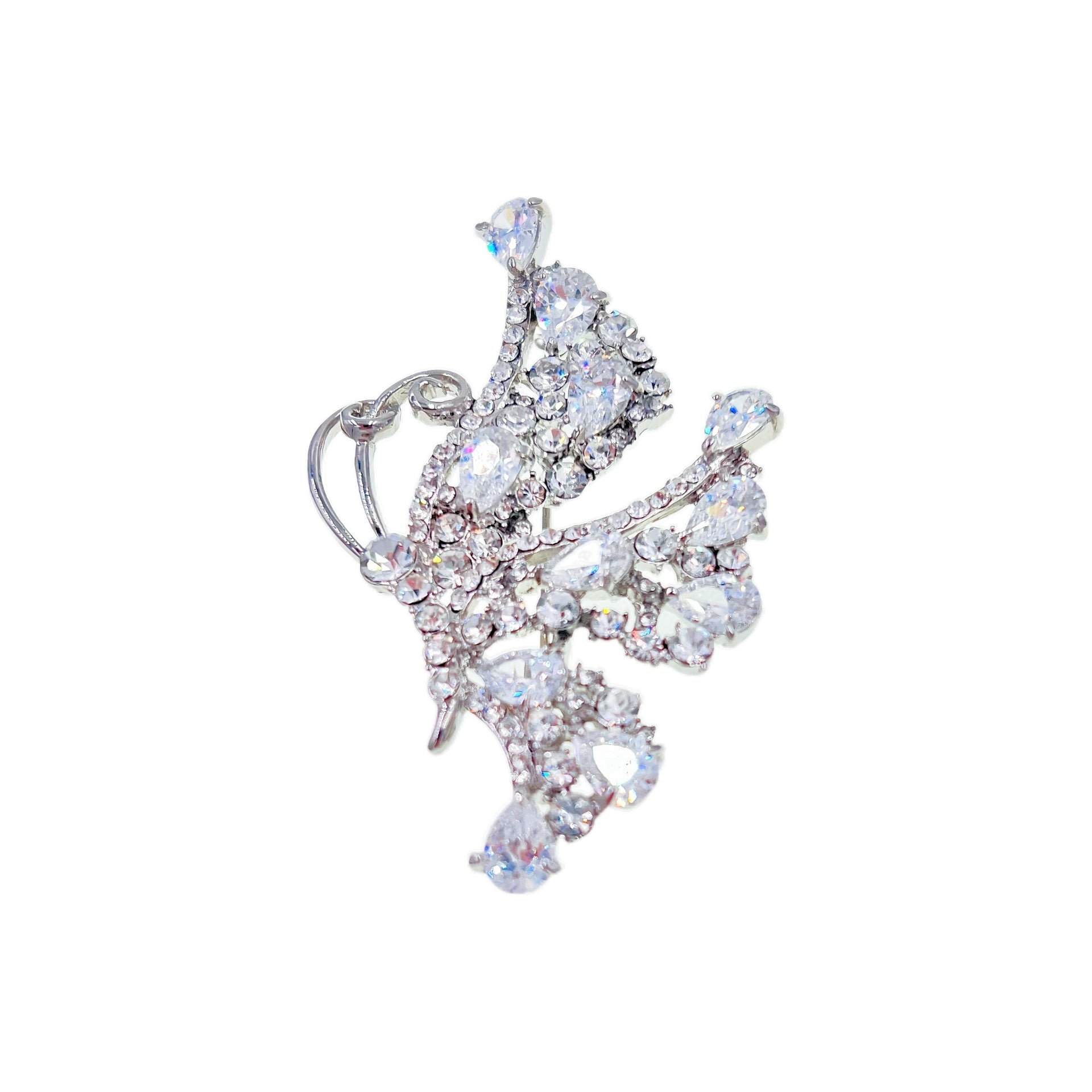Finished in luminous white gold plating, its silhouette is defined by sleek, flowing lines that echo the graceful motion of fluttering wings.