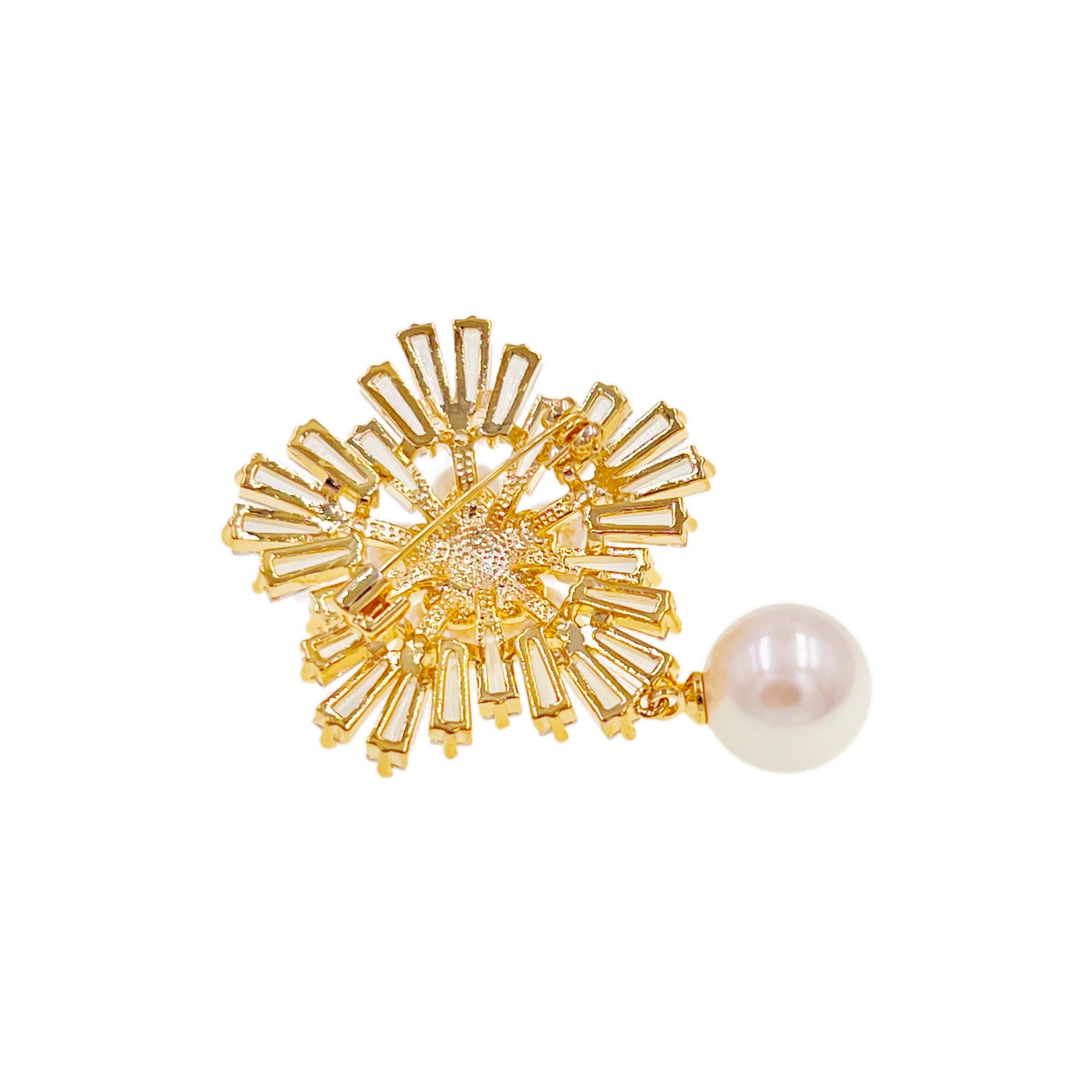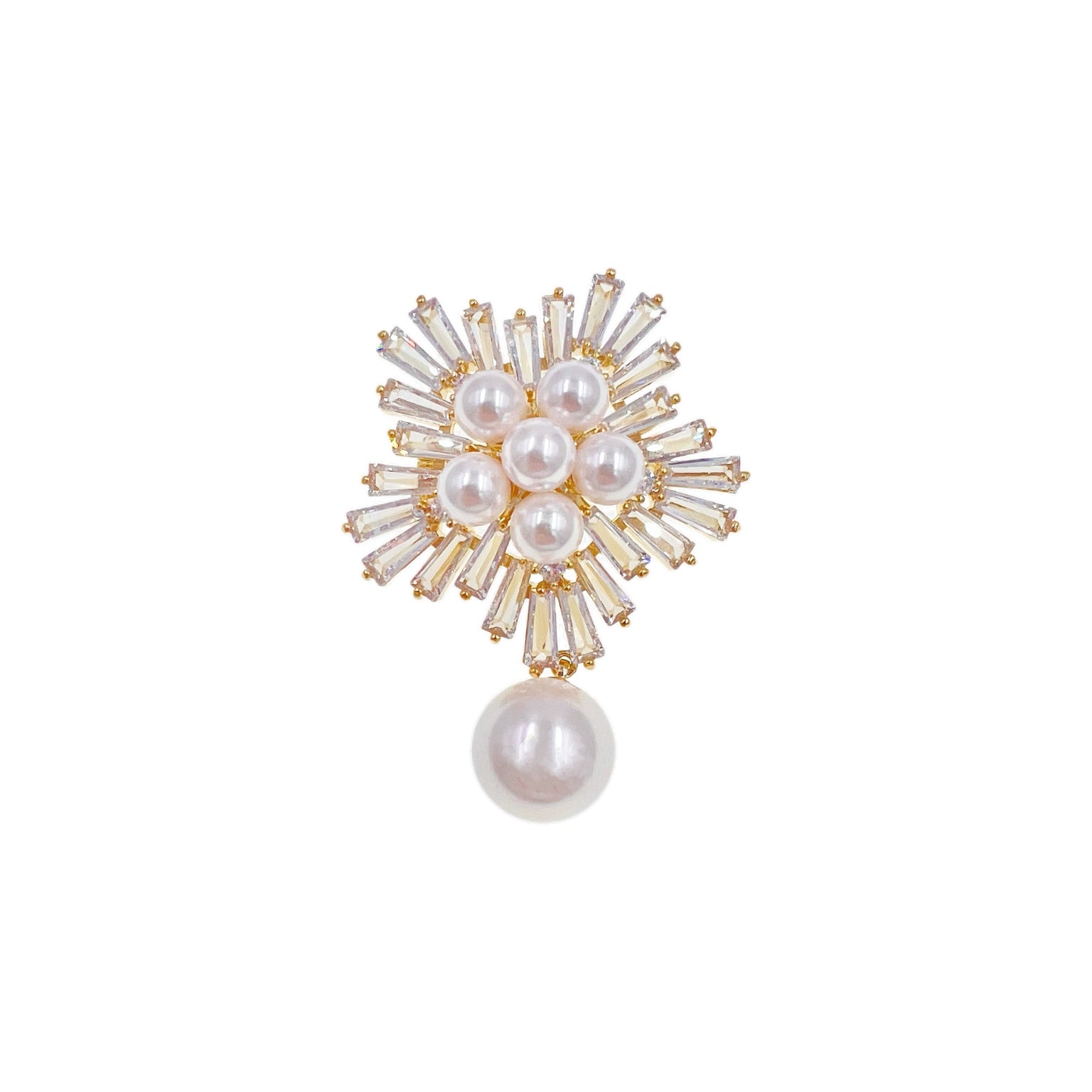 Radiating outward, baguette-cut crystals are arranged in a sunburst pattern on a golden base, mimicking petals unfurling in warm daylight. A single larger pearl dangles gently beneath, echoing the central bloom and adding a sense of refined movement and depth.
