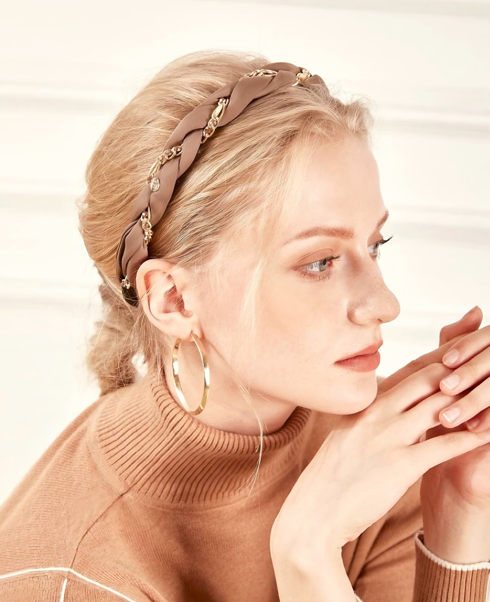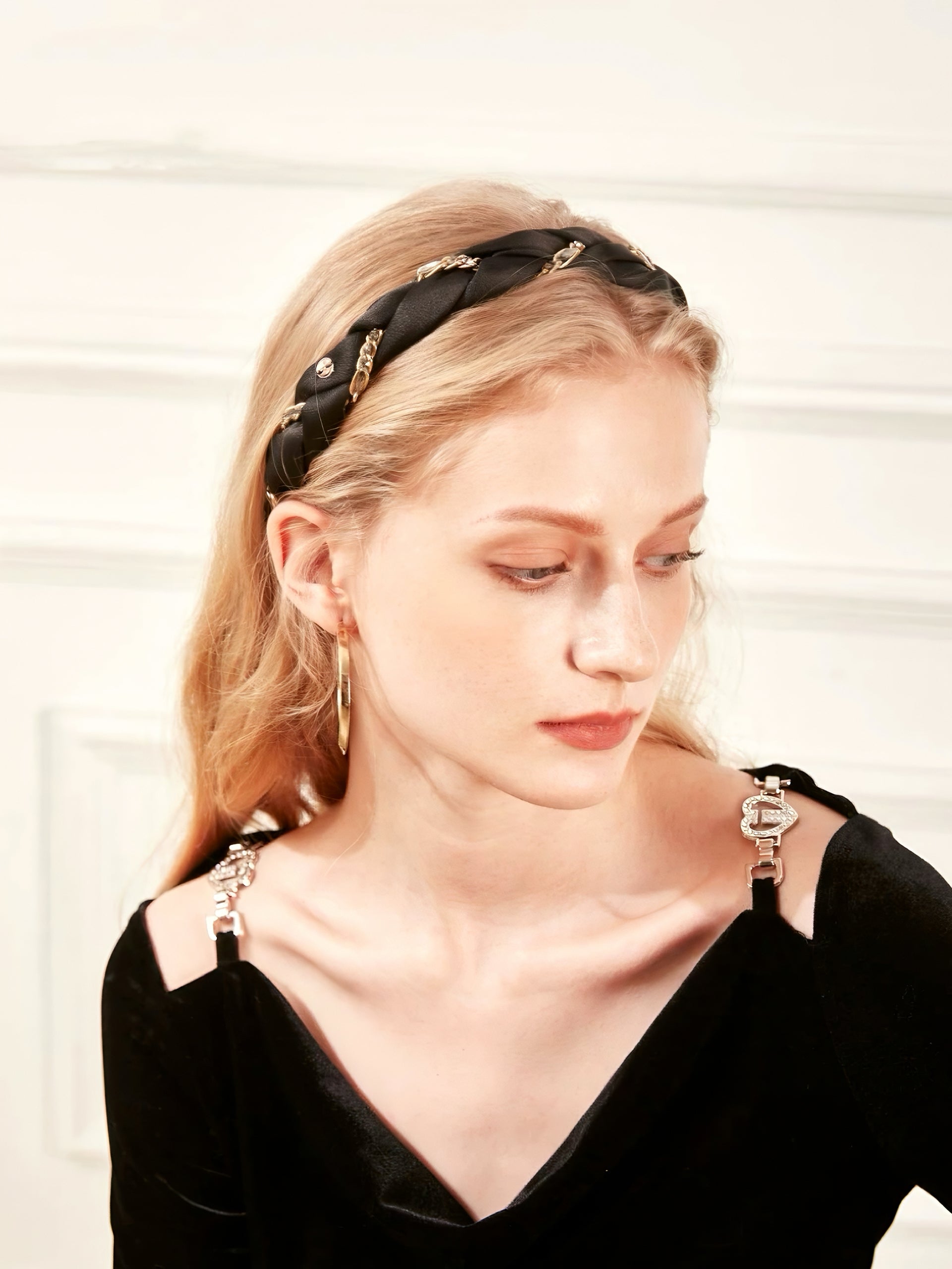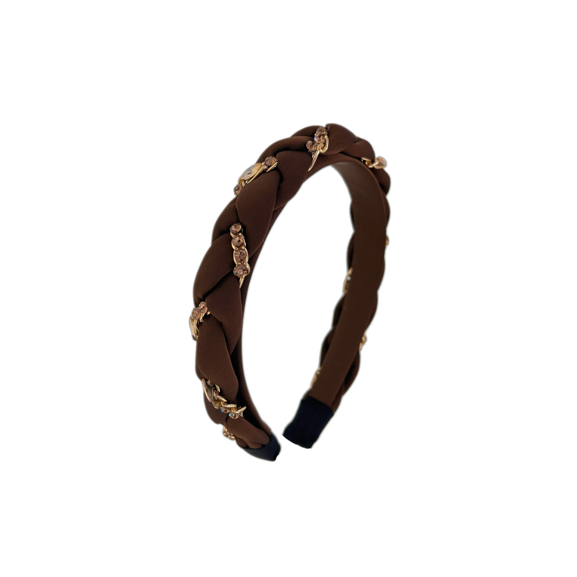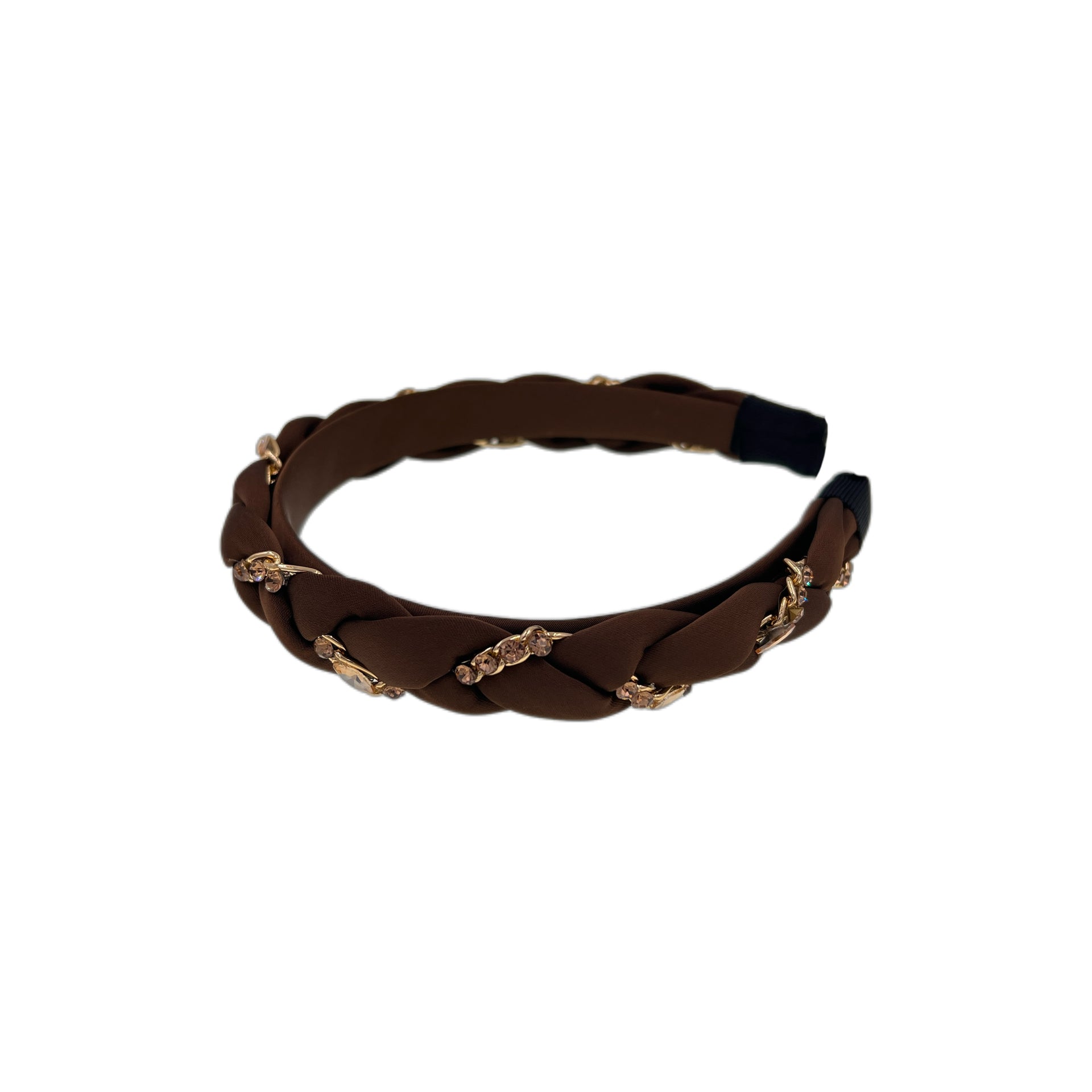Inspired by the quiet brilliance of falling stars, Gemme Tressée weaves together hand-braided fabric with metallic chain details. Sparkling Czech rhinestones are delicately embedded along the chain, creating a cascading constellation effect. Fully wrapped in soft fabric, the design ensures a secure yet gentle fit — no pulling, no pressure, just effortless beauty.