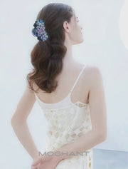 At the heart of the central bloom lies a radiant Czech rhinestone core, surrounded by shimmering Aurora Borealis crystals—as if the flower were quietly blooming under starlight. Finished with a high-quality Korean acrylic claw for secure and elegant wear.