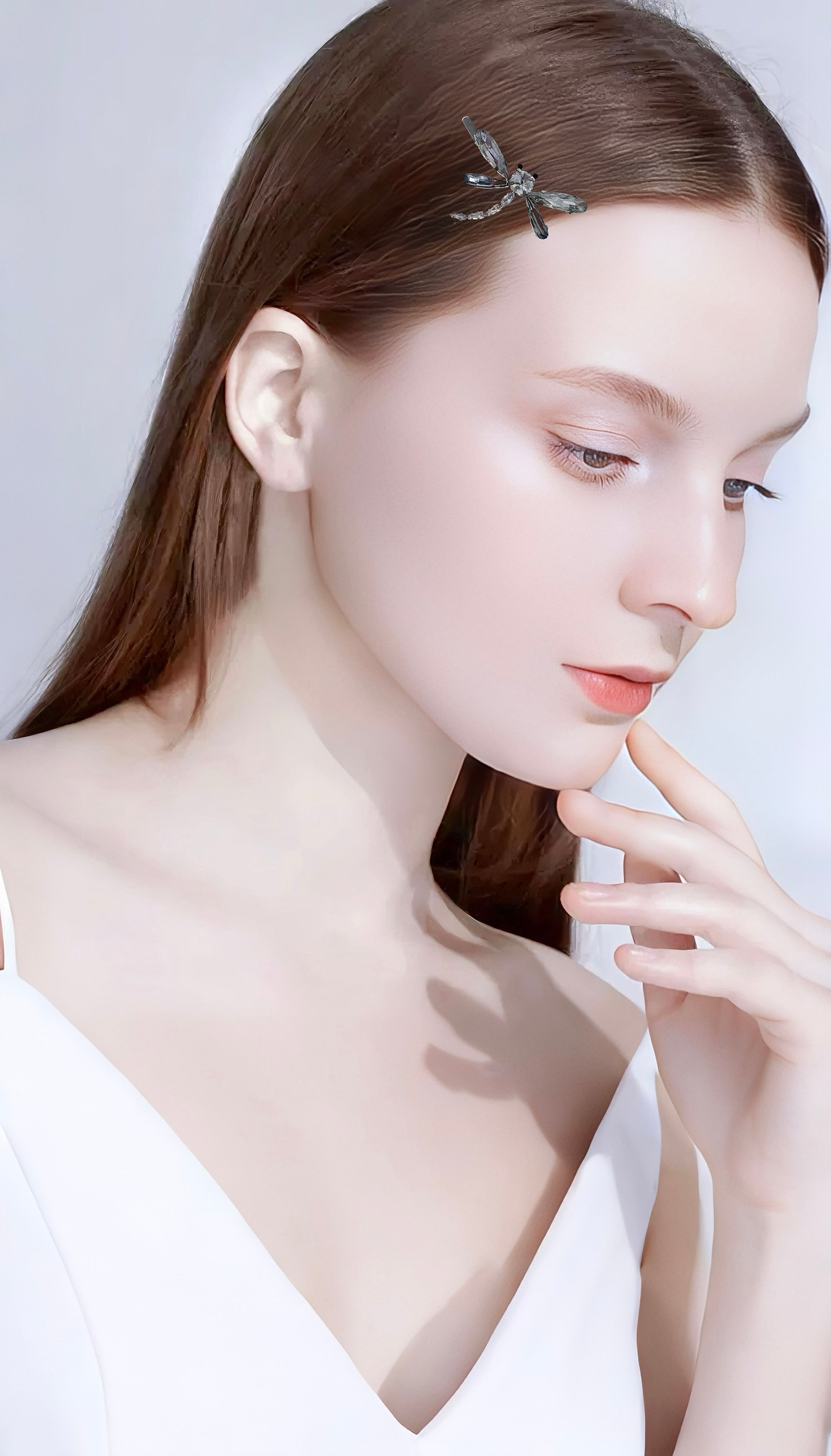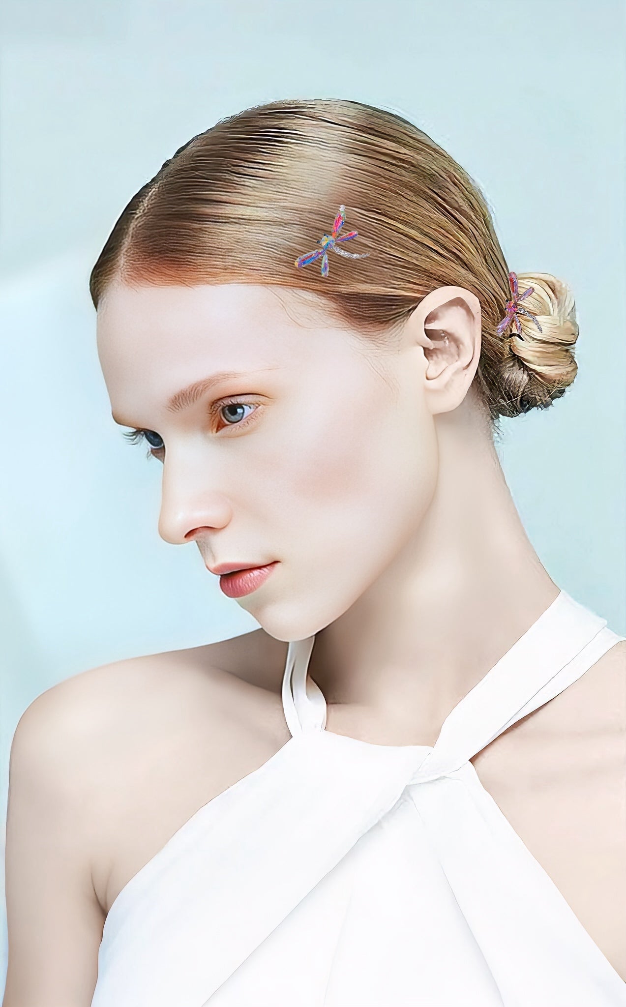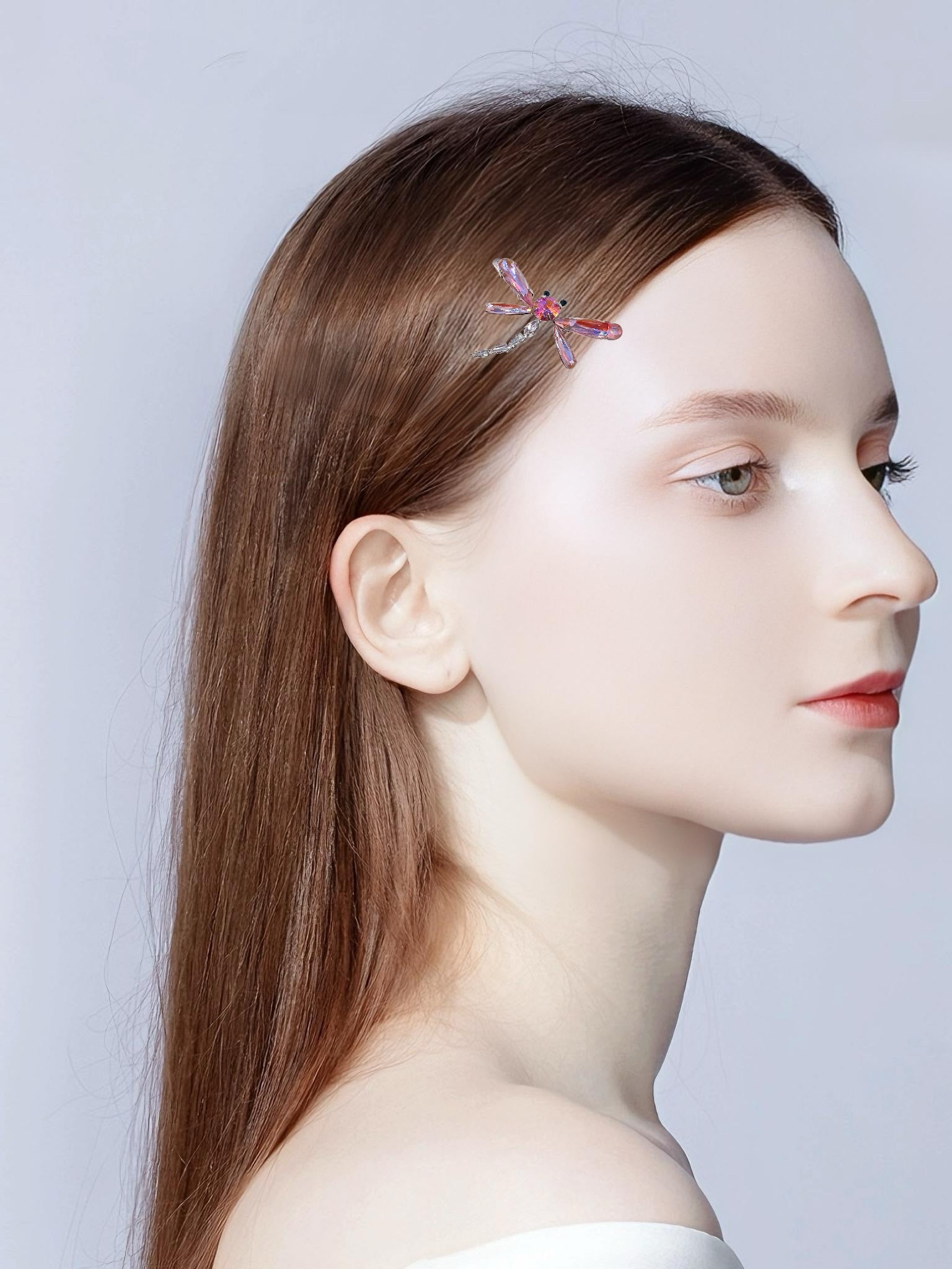 Each LumiLibellule is meticulously handcrafted. The dragonfly’s head features a satellite-cut Czech crystal, its wings adorned with asymmetrically-cut stones, and its body lined with shimmering zircon accents. These radiant elements catch the light with every movement, creating a sparkling dance through your hair.