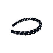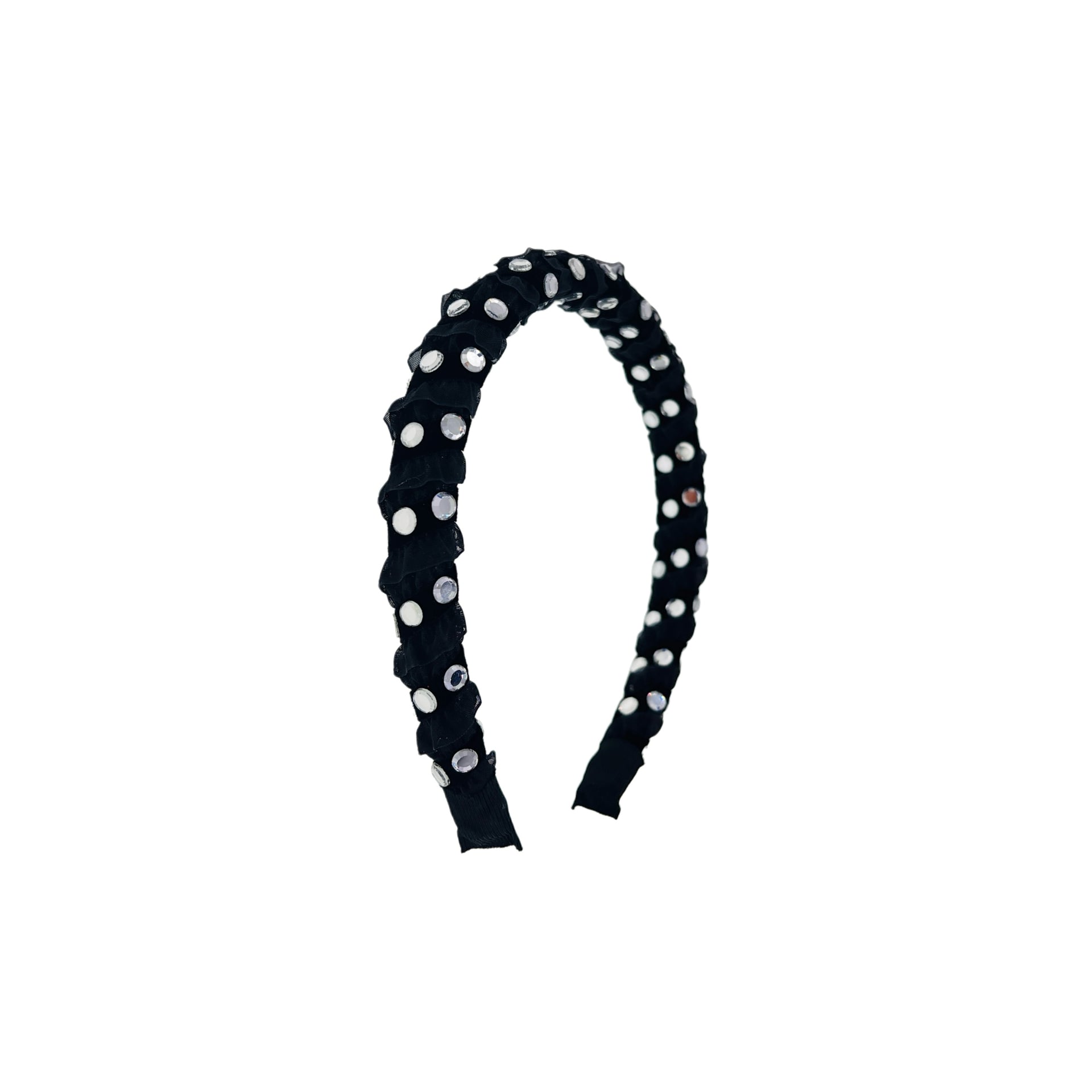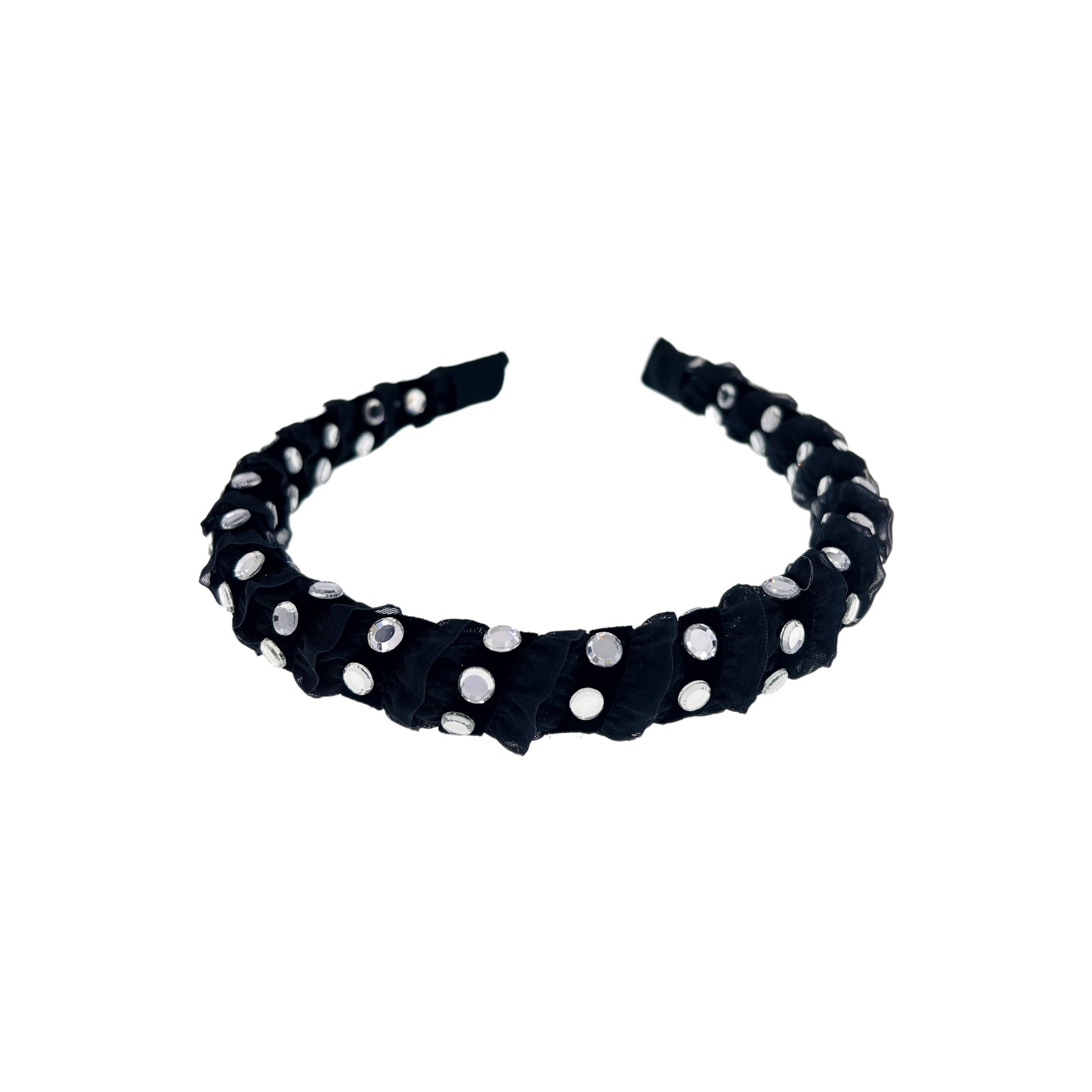 A luminous statement piece designed to catch the light from every angle. This headband features finely pleated acetate fabric, meticulously hand-embellished with an array of flat-cut Czech crystals that shine like tiny silver mirrors. Radiant yet refined, it adds a bold, modern elegance to any look.