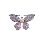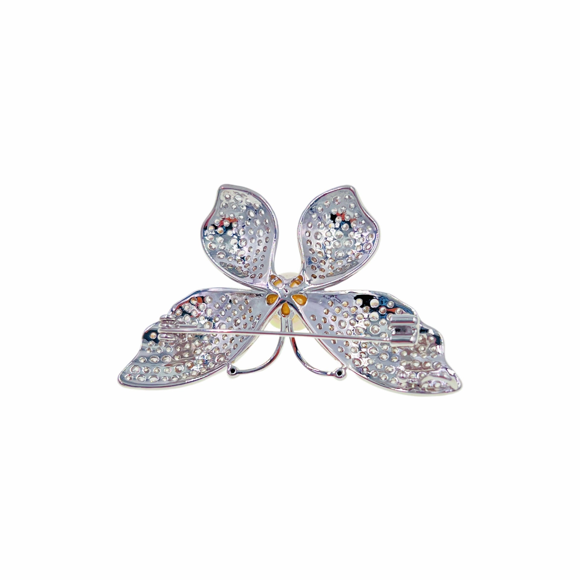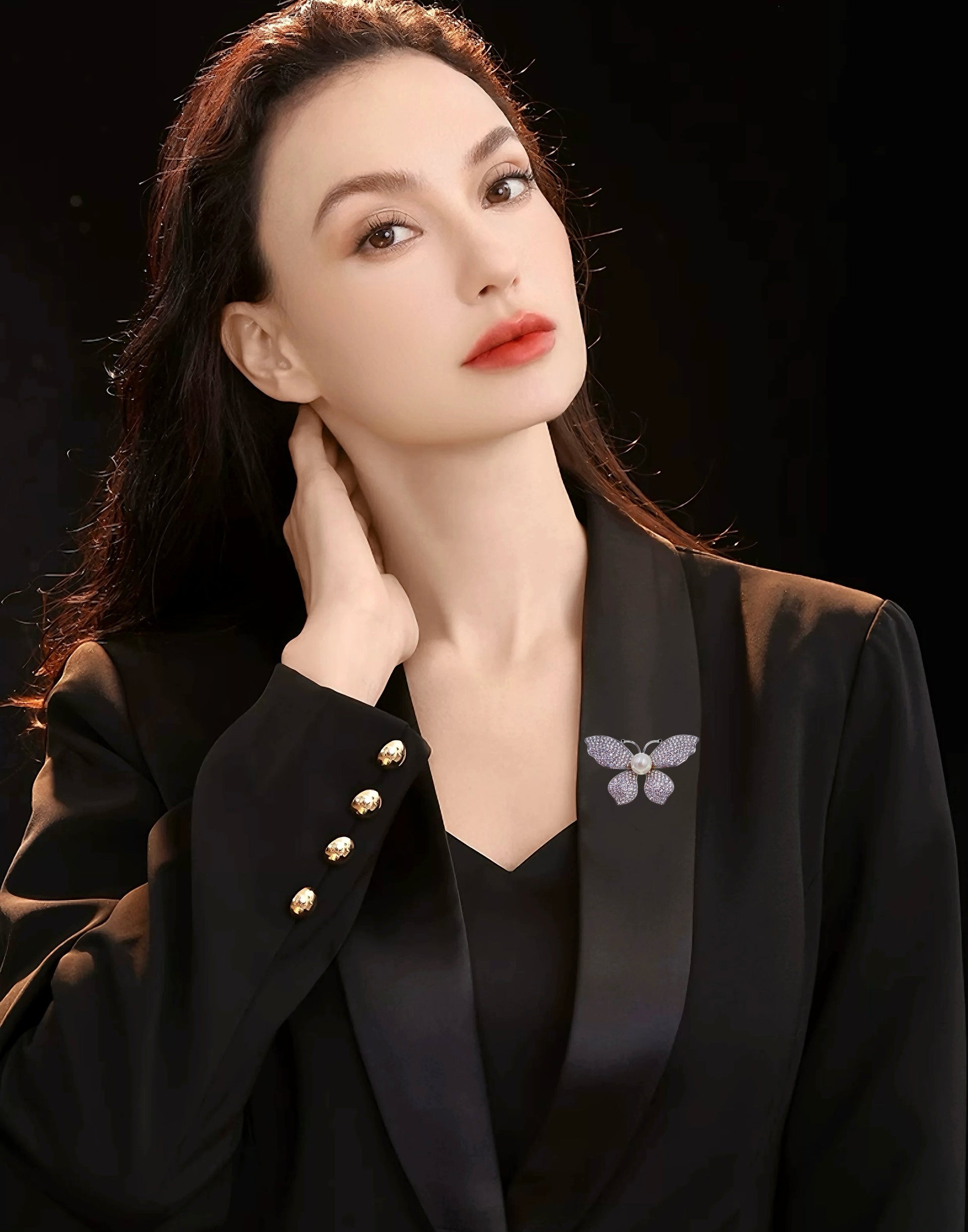 The wings are adorned with countless micro-set 5A cubic zirconia, catching light with every angle, while a smooth, lustrous shell pearl forms the body—creating a striking contrast between radiant sparkle and soft luminescence.