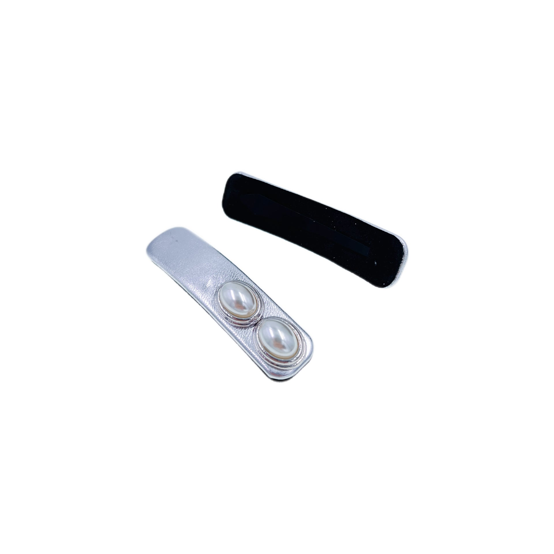 Sleek, modern, and refined, the Perle Métallique BB Clip is crafted from metallic-textured faux leather, radiating a subtle silver sheen. The elongated silhouette adds understated elegance, while a single lustrous faux pearl sits gracefully at the center—framed in eco-friendly gold-toned metal for a touch of vintage French charm.