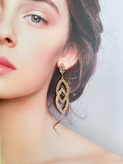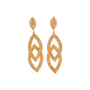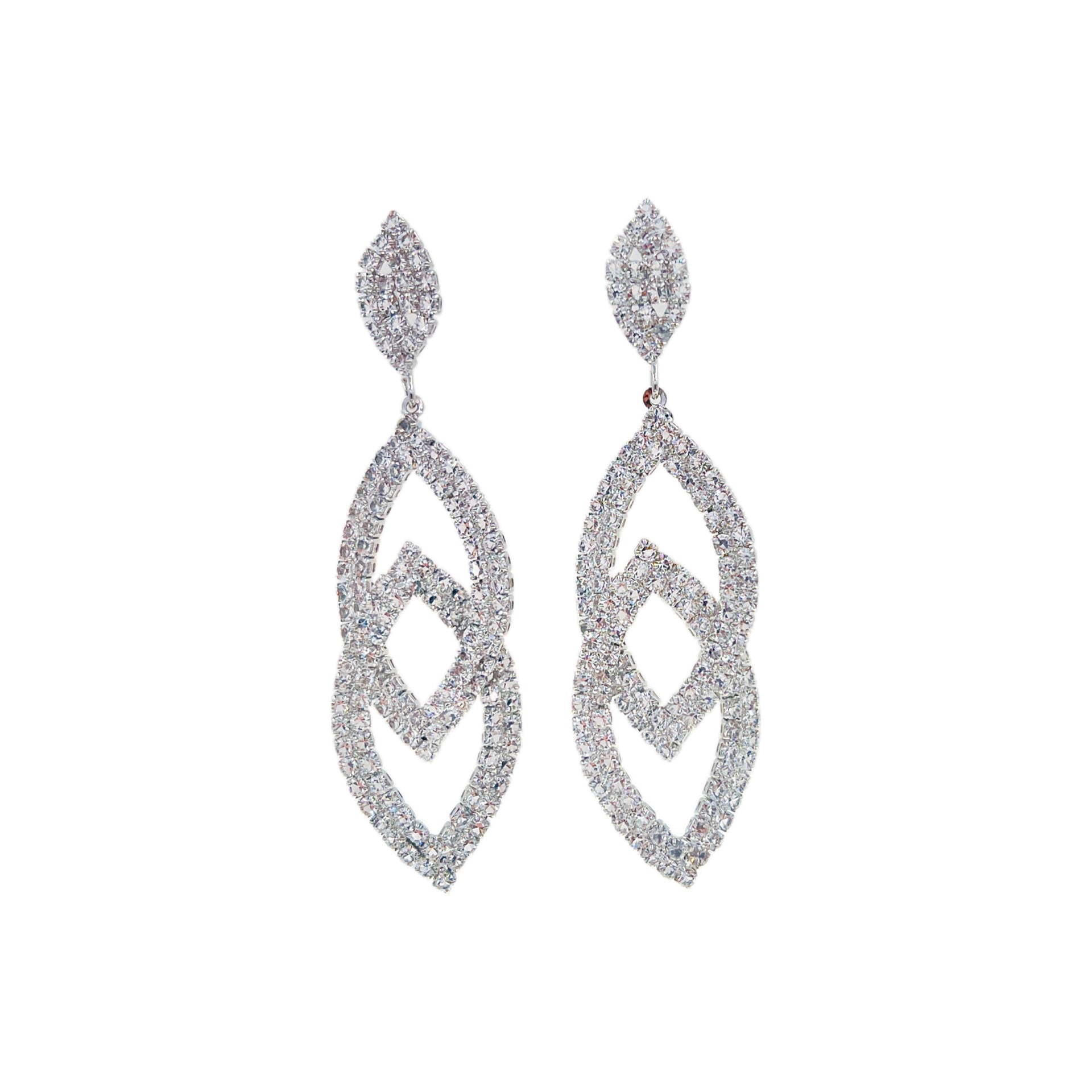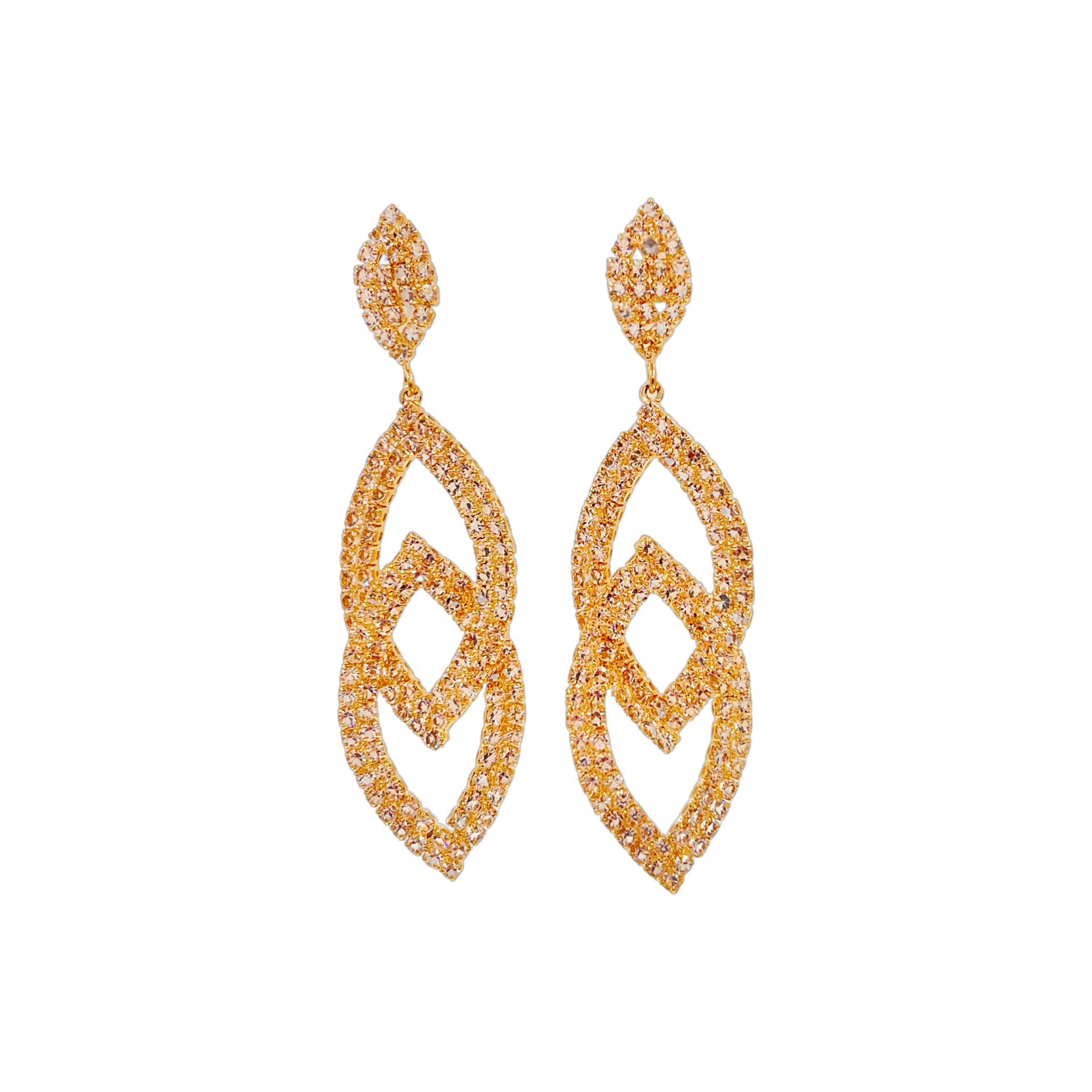 These drop earrings showcase an architectural interplay of geometric forms and luminous pavé work. A micro-set rhombus sits at the top, leading to a cascading structure of interwoven diamond shapes, each rimmed with densely set zirconia. Available in both gold and silver tones, the design balances precision and radiance—whether you prefer the warm glow of gold or the sleek shimmer of silver.