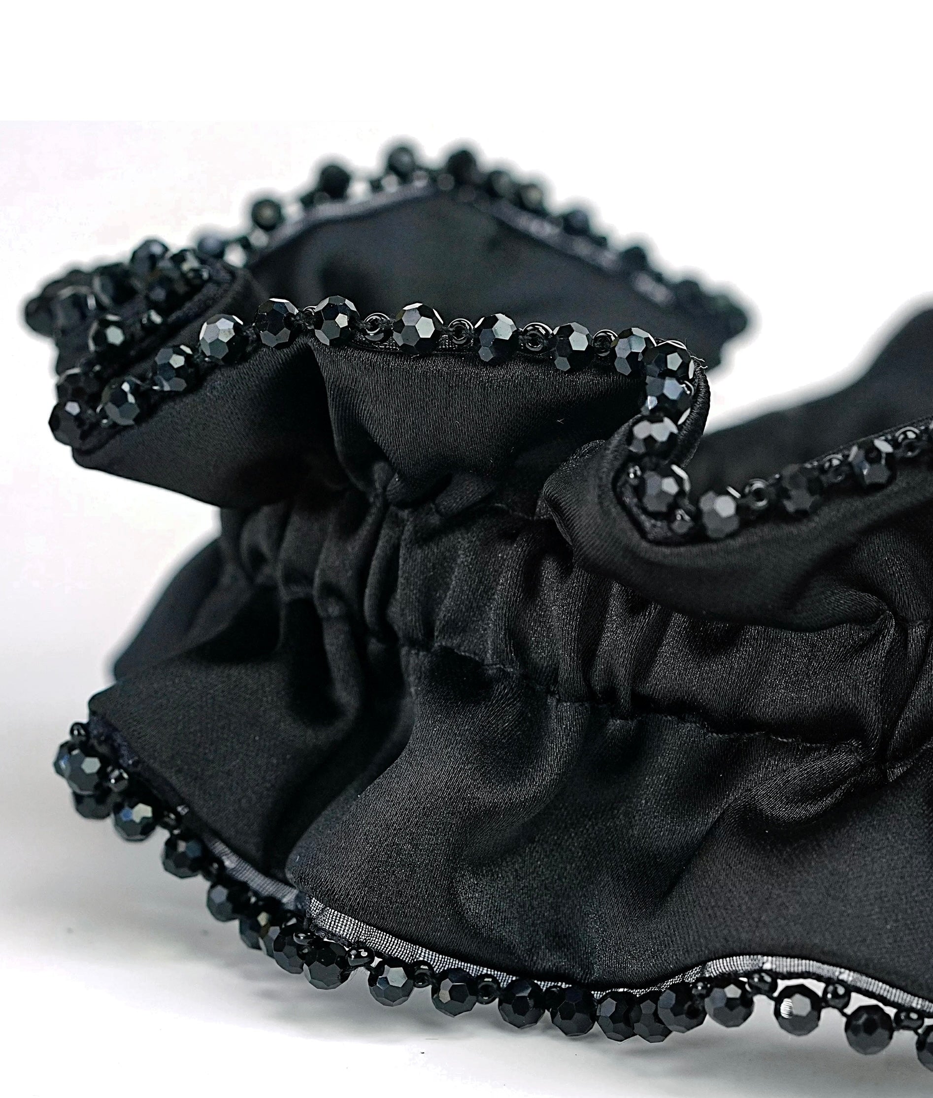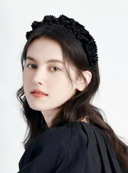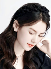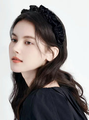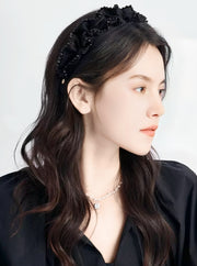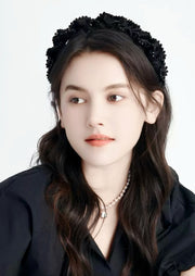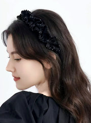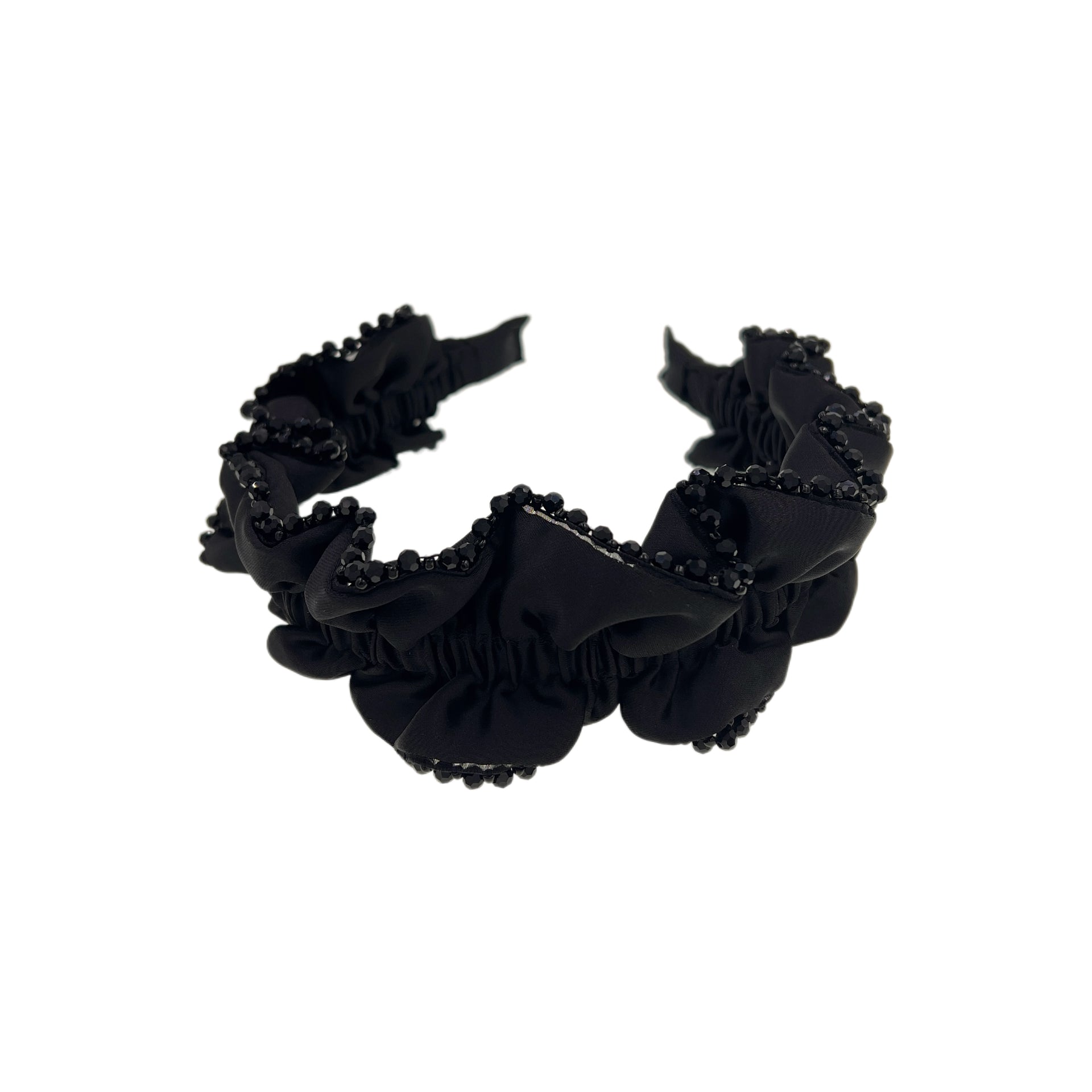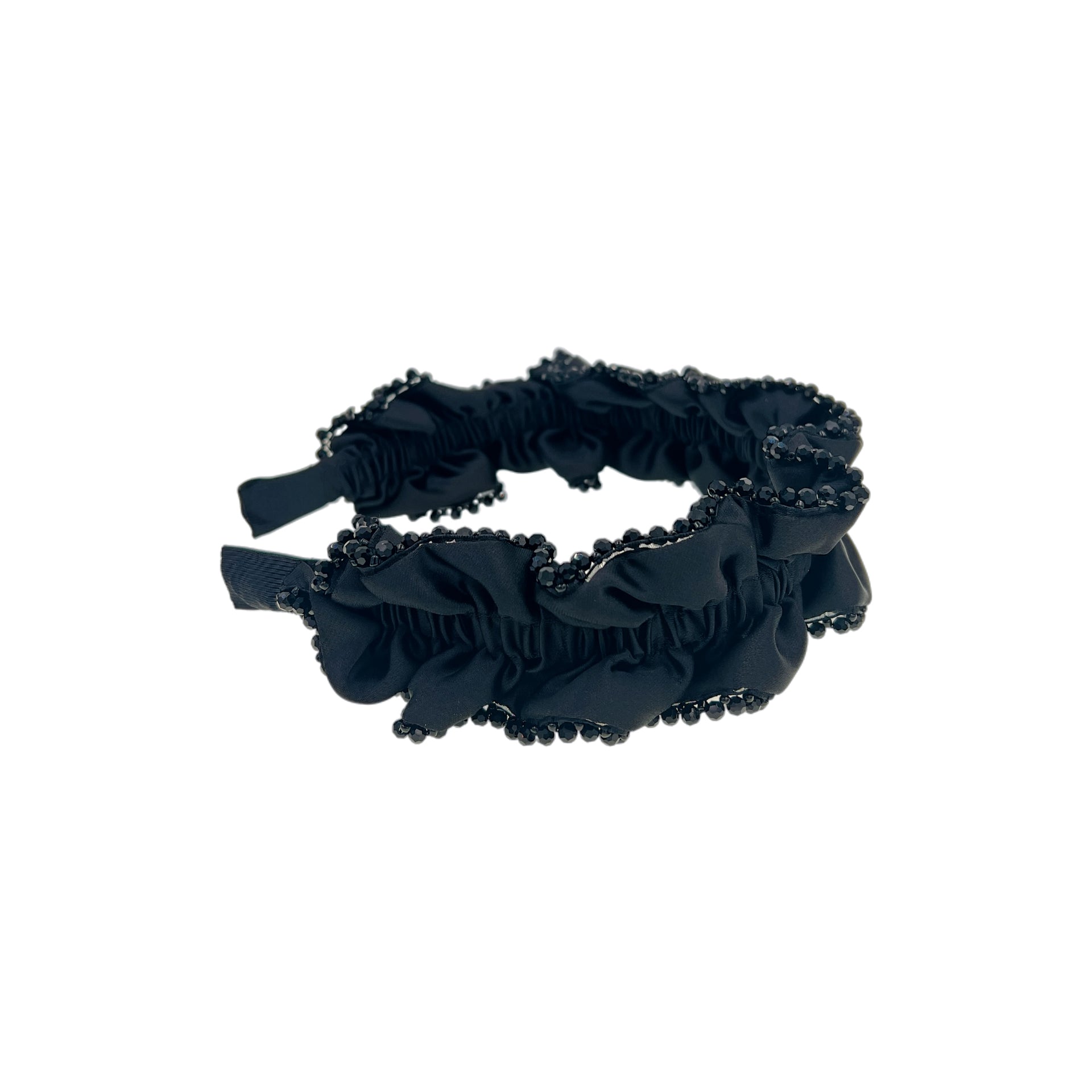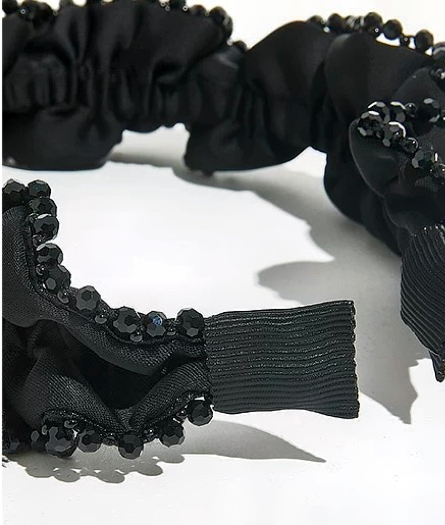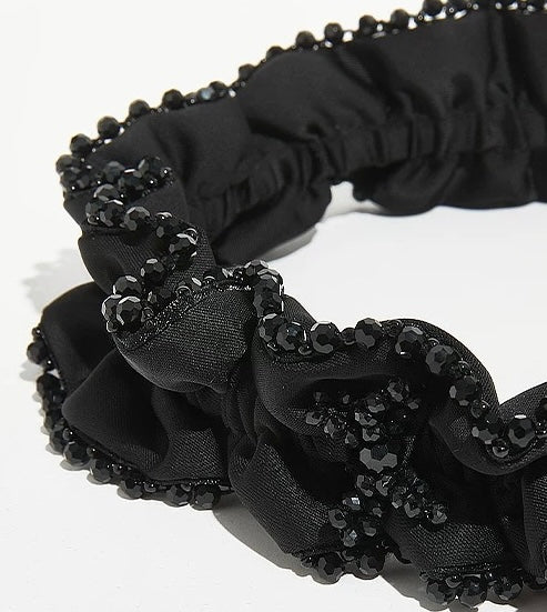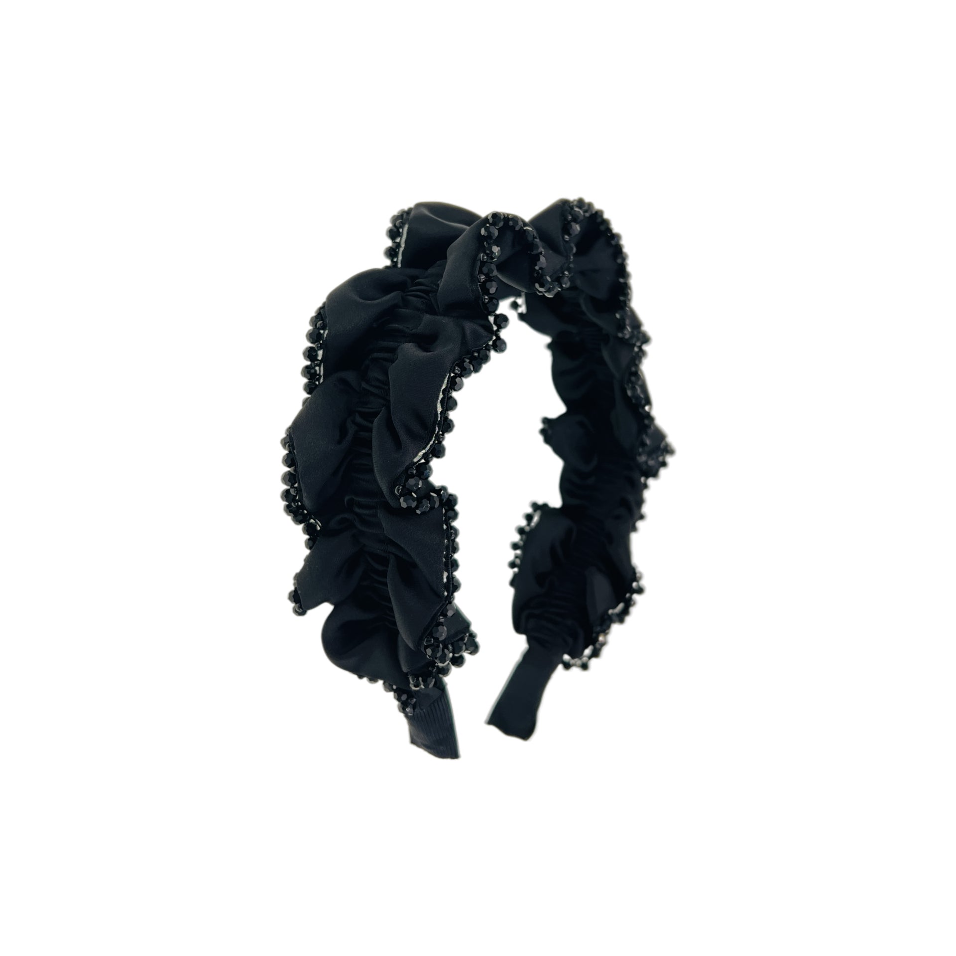 Softly gathered in a ruffled silhouette, this wide headband frames the face with graceful volume and subtle charm. The edges are delicately hand-trimmed with beaded accents that echo the look of pearls — a quiet touch of elegance. Made from acetate fabric with a naturally textured sheen, it brings effortless sophistication to both casual and refined looks.
