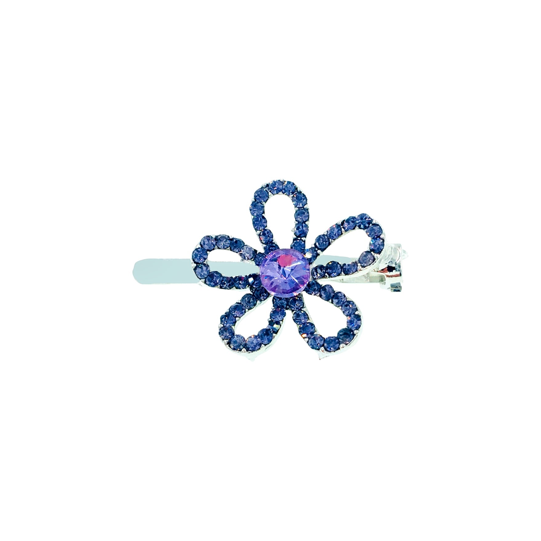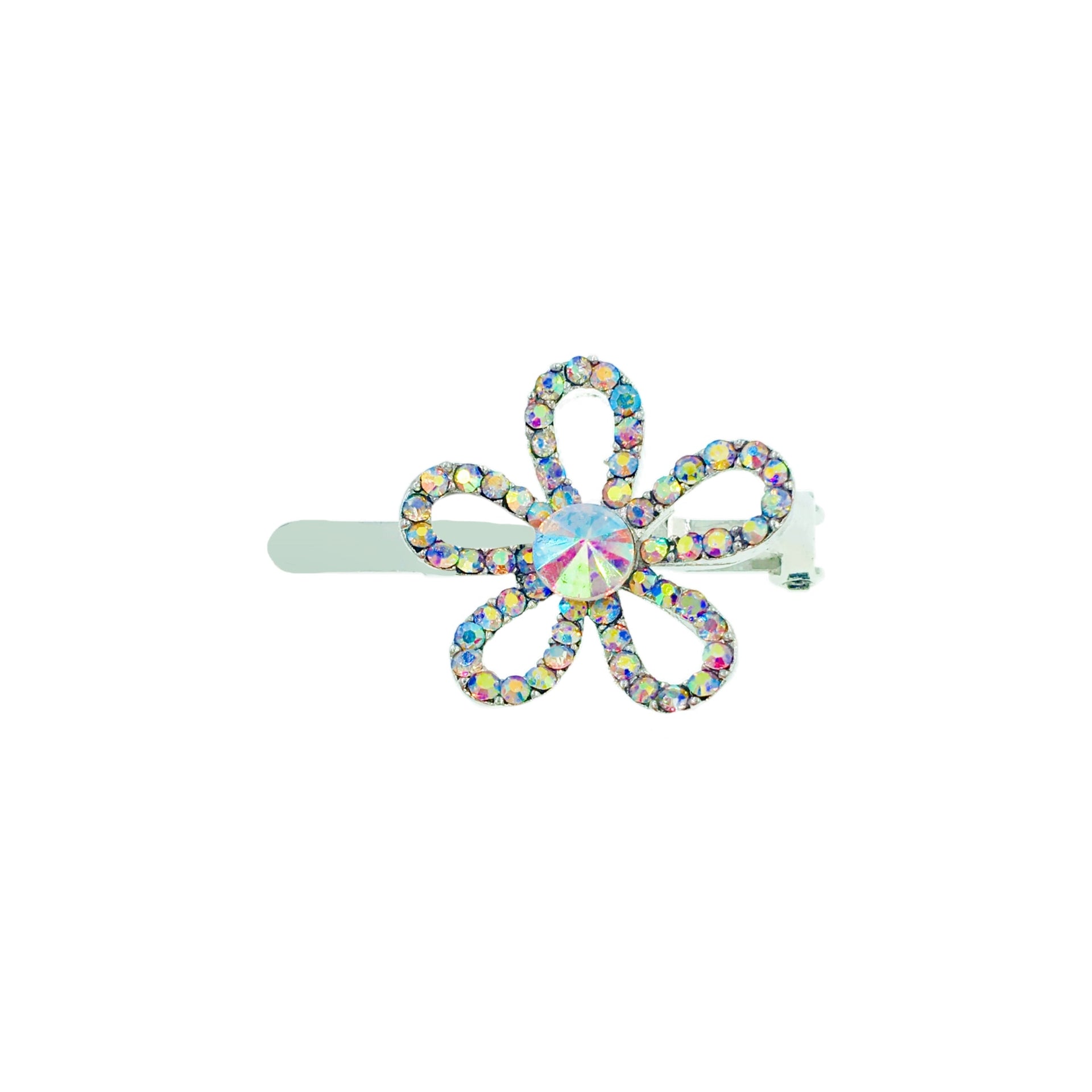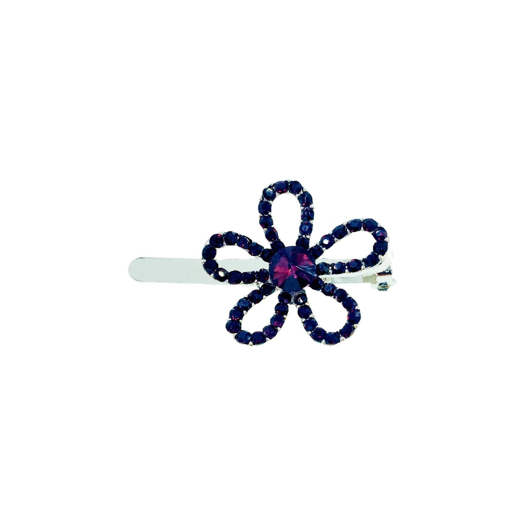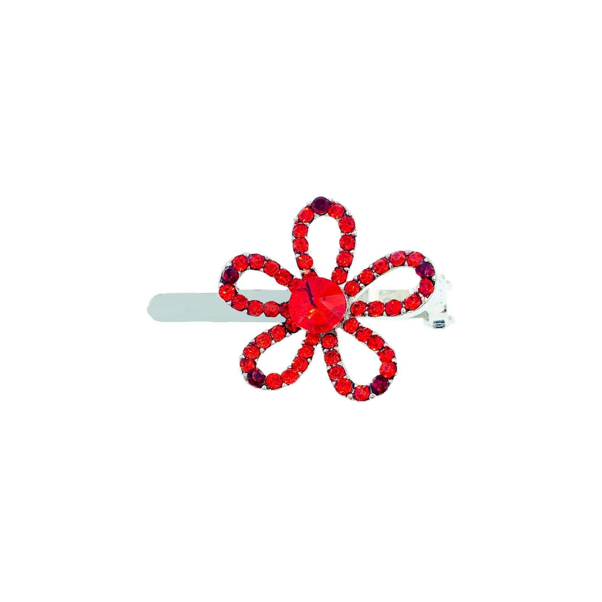 Featuring a minimalist floral silhouette with hollowed-out petals, the edges are delicately hand-set with high-shine rhinestones, while the center is adorned with a large rhinestone in a matching hue.