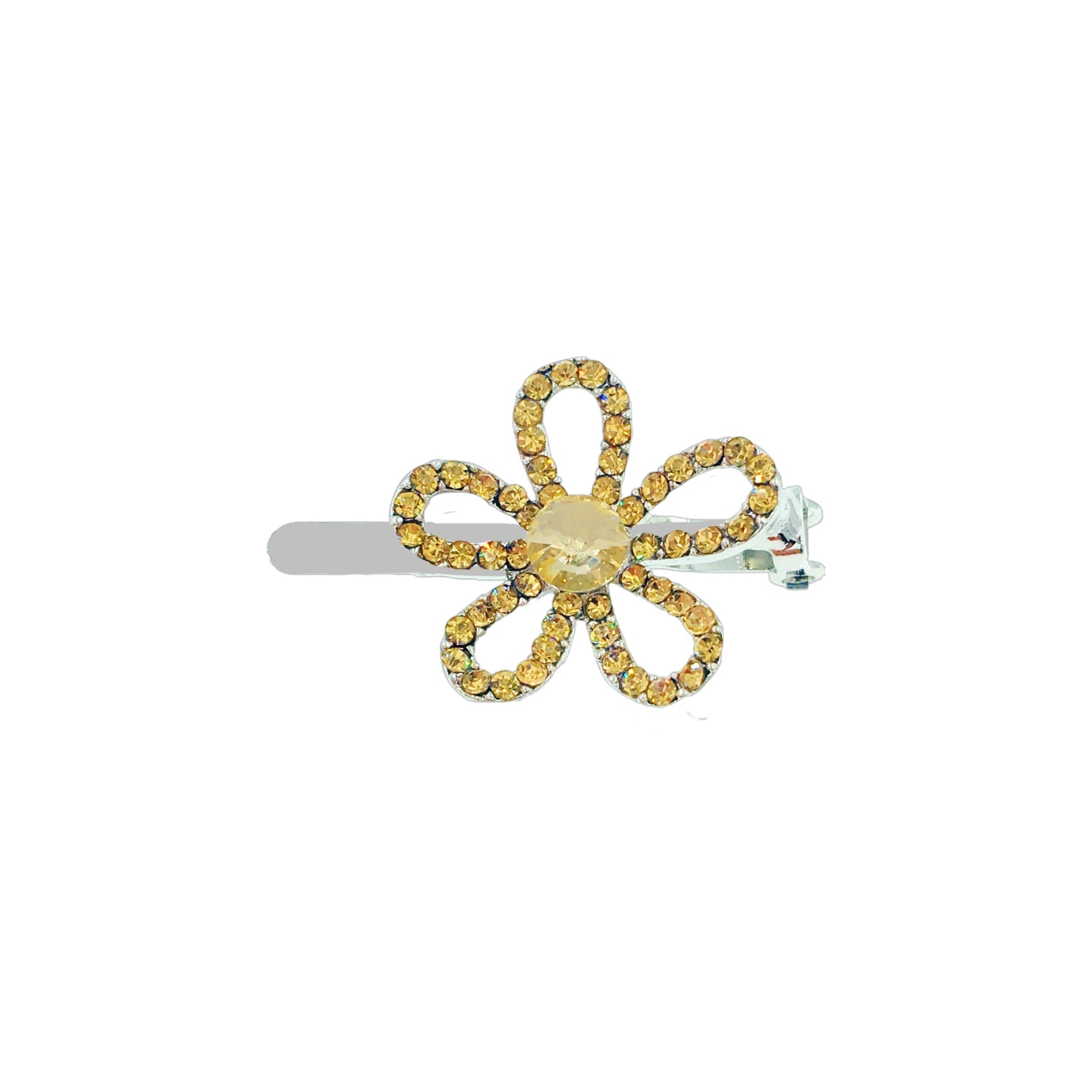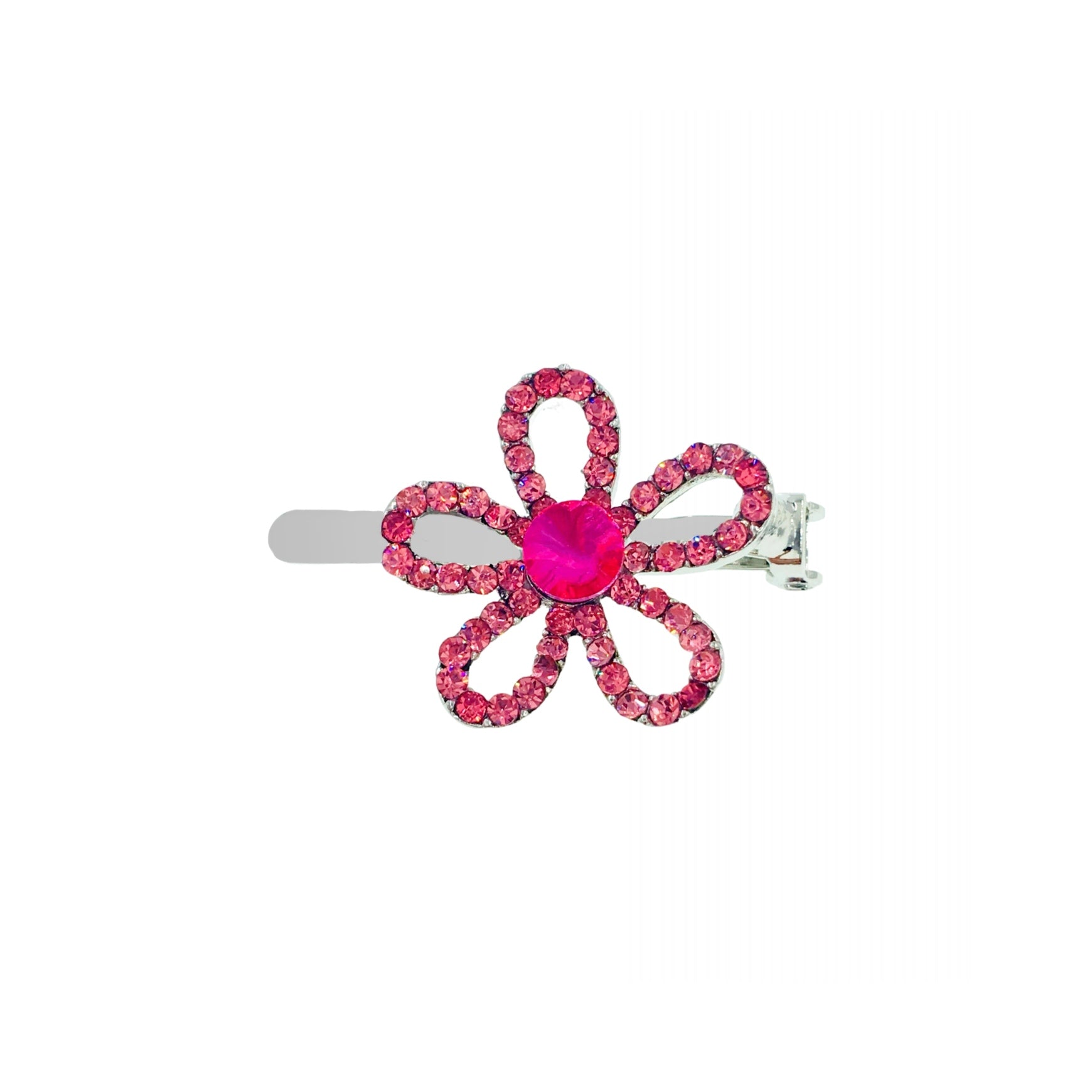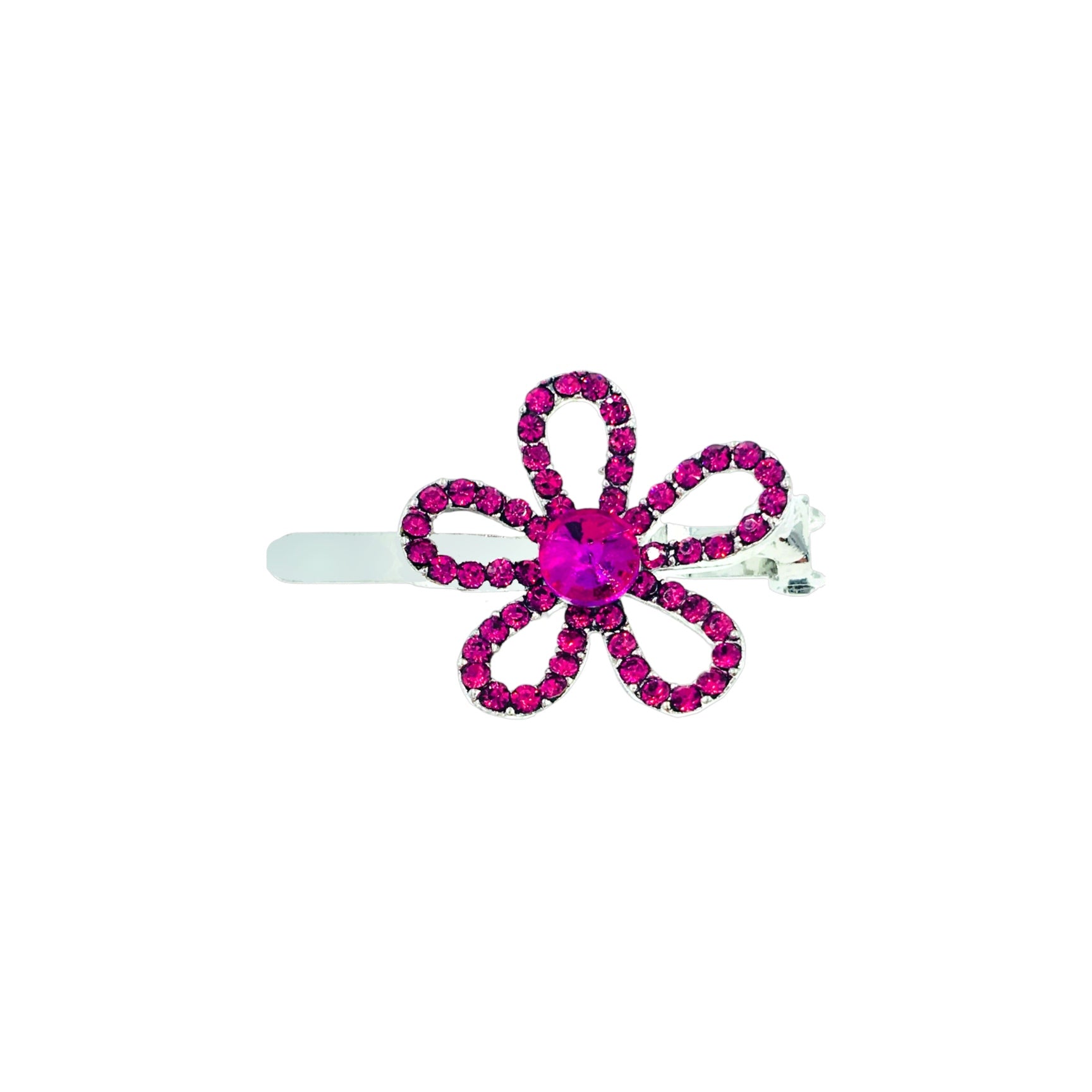 Featuring a minimalist floral silhouette with hollowed-out petals, the edges are delicately hand-set with high-shine rhinestones, while the center is adorned with a large rhinestone in a matching hue.