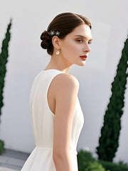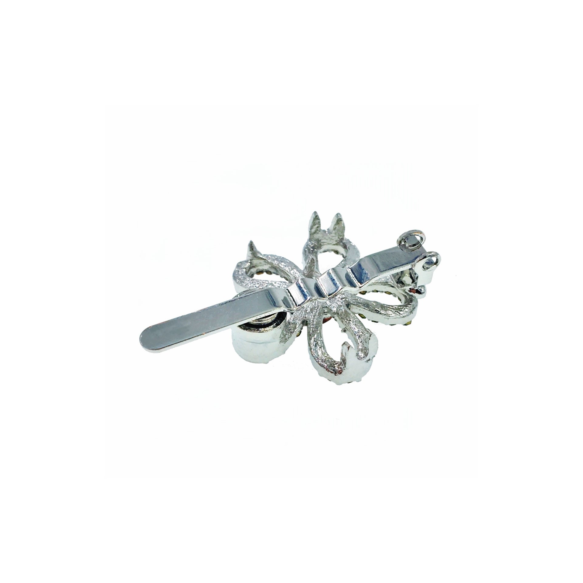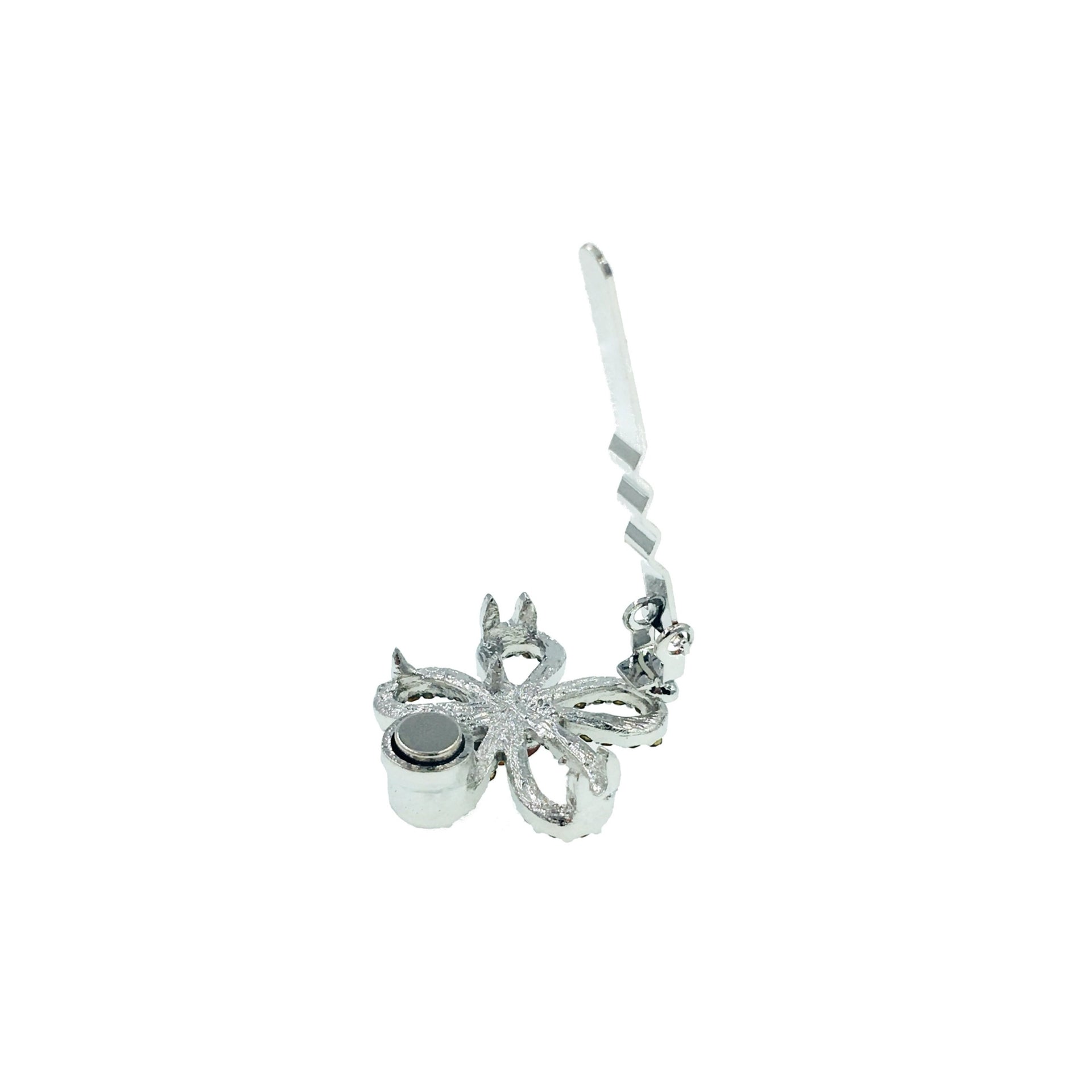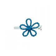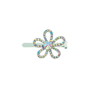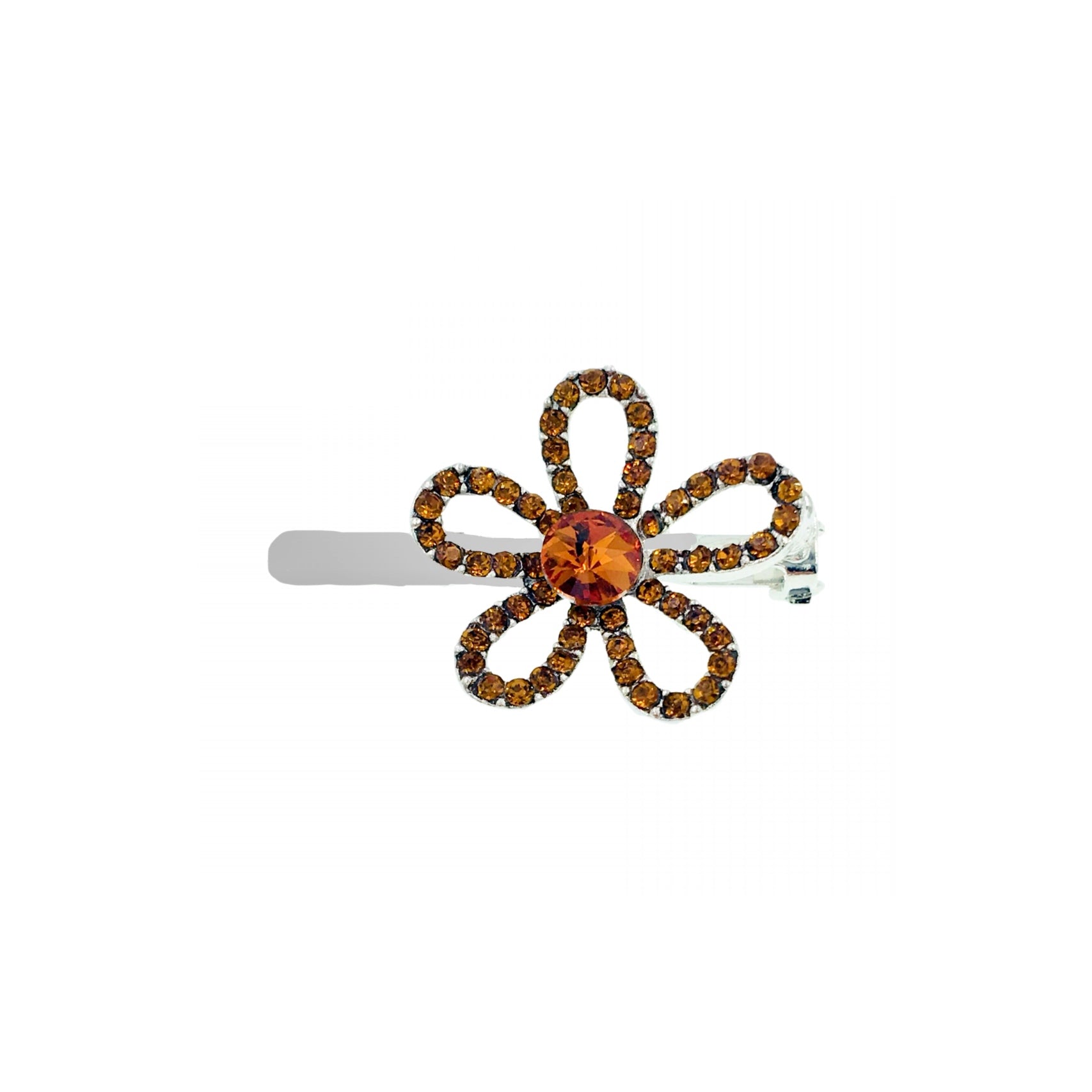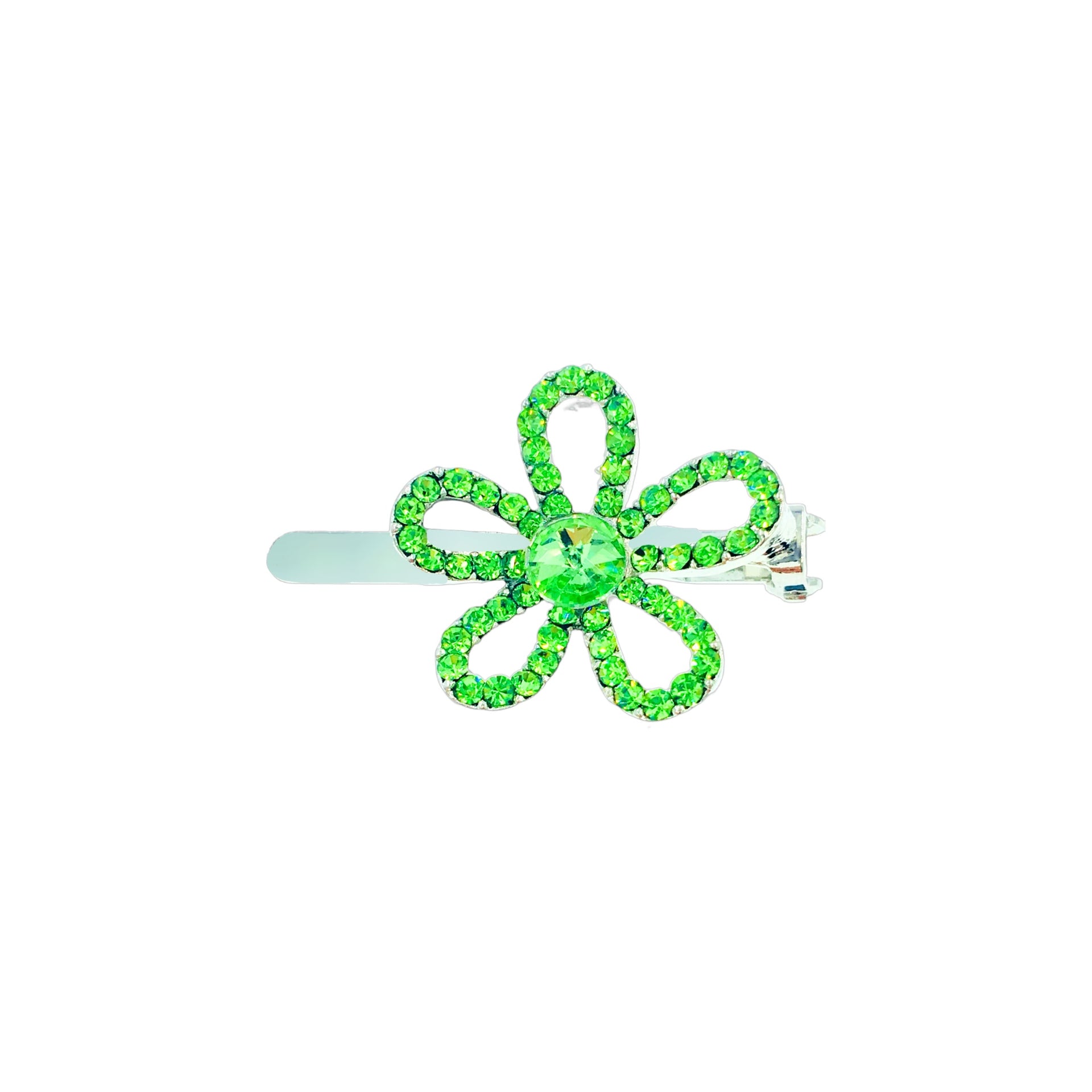 Featuring a minimalist floral silhouette with hollowed-out petals, the edges are delicately hand-set with high-shine rhinestones, while the center is adorned with a large rhinestone in a matching hue.