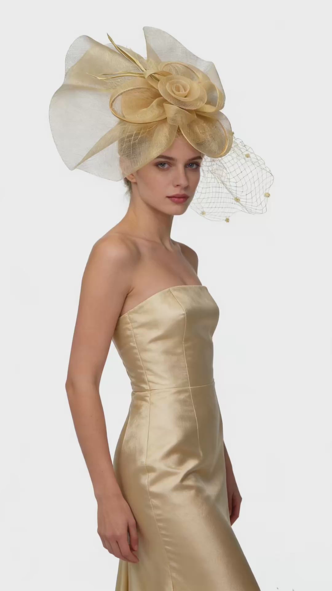 - Design Style: A modern British–inspired asymmetrical oversized floral fascinator, emphasizing fluid movement, airy lightness, and dynamic tension. Refined yet highly expressive in overall presence.