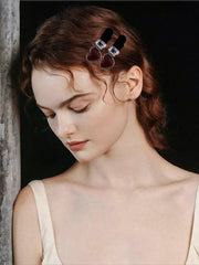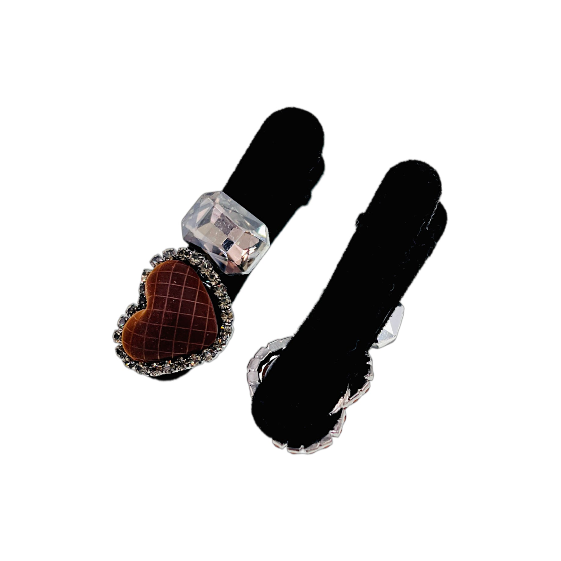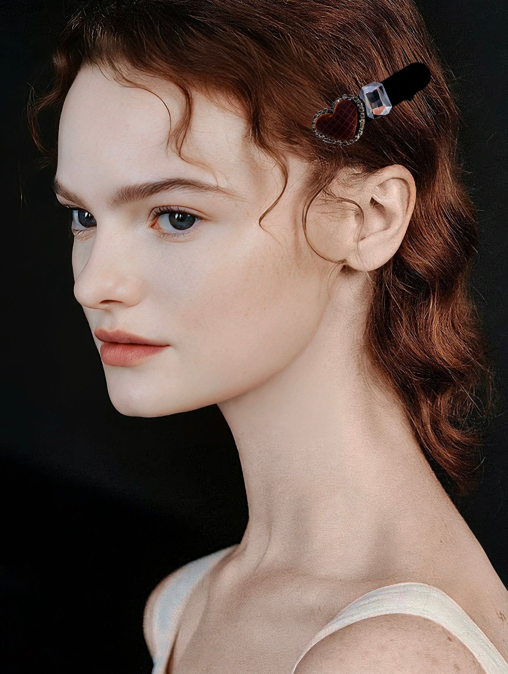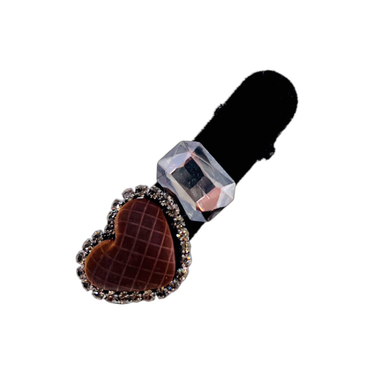 Handcrafted and petite, this alligator clip is wrapped in black velvet flocking for a soft, refined matte finish. A brown velvet heart sits at the center, veiled with a delicate layer of mesh for a sweet, airy texture, while a ring of tiny grey crystals sparkles gently around it. Finished with a grey Austrian crystal on the side, this little clip is full of charm and thoughtful detail.