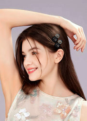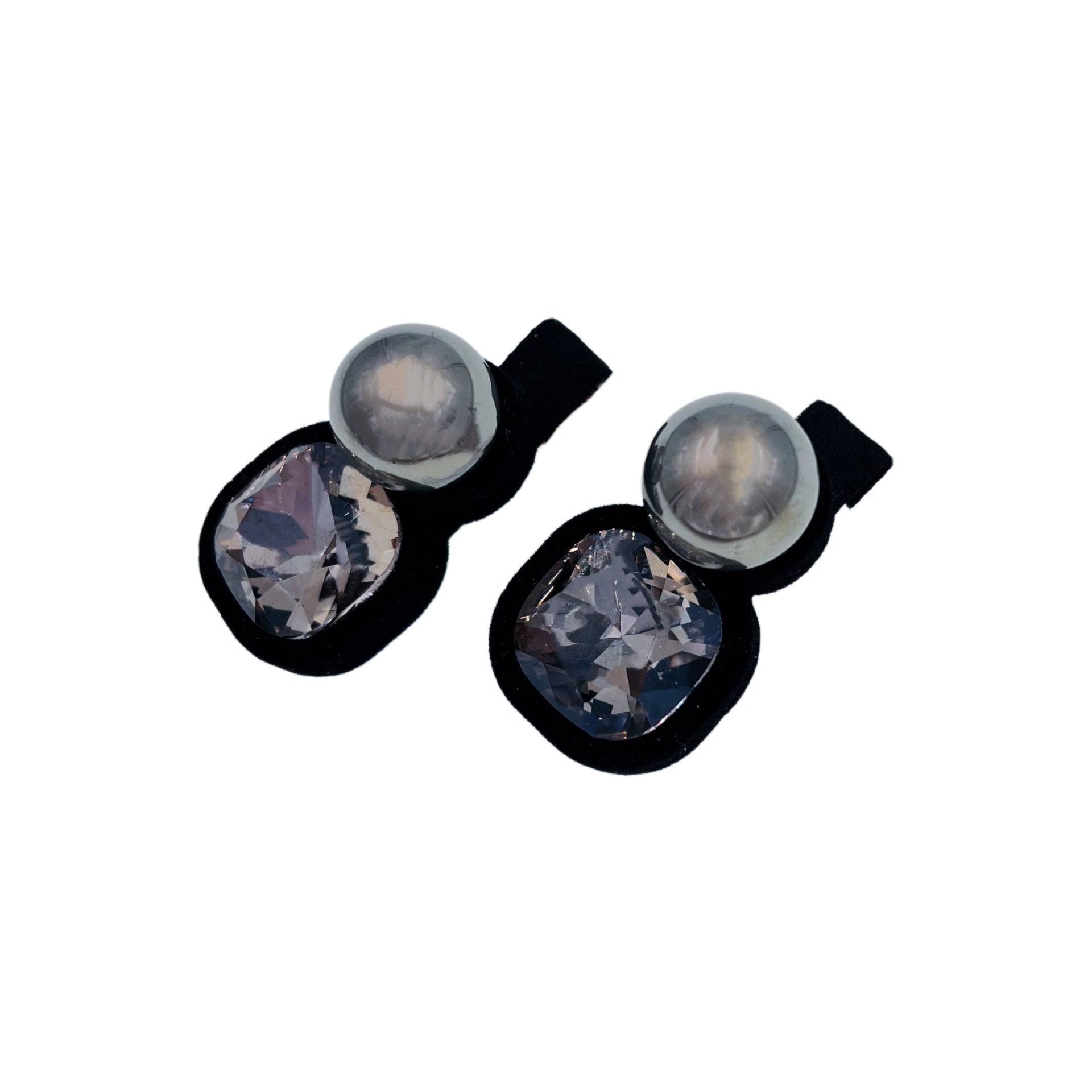 Handcrafted and minimalist, this petite alligator clip delivers a surprisingly luxe feel. Wrapped entirely in black velvet flocking, it offers a soft, refined touch with an elegant matte finish. The design pairs an oversized grey Austrian crystal with a high-quality grey pearl for striking contrast, while the crystal is framed with a velvet edge that enhances the interplay between cool brilliance and soft texture.