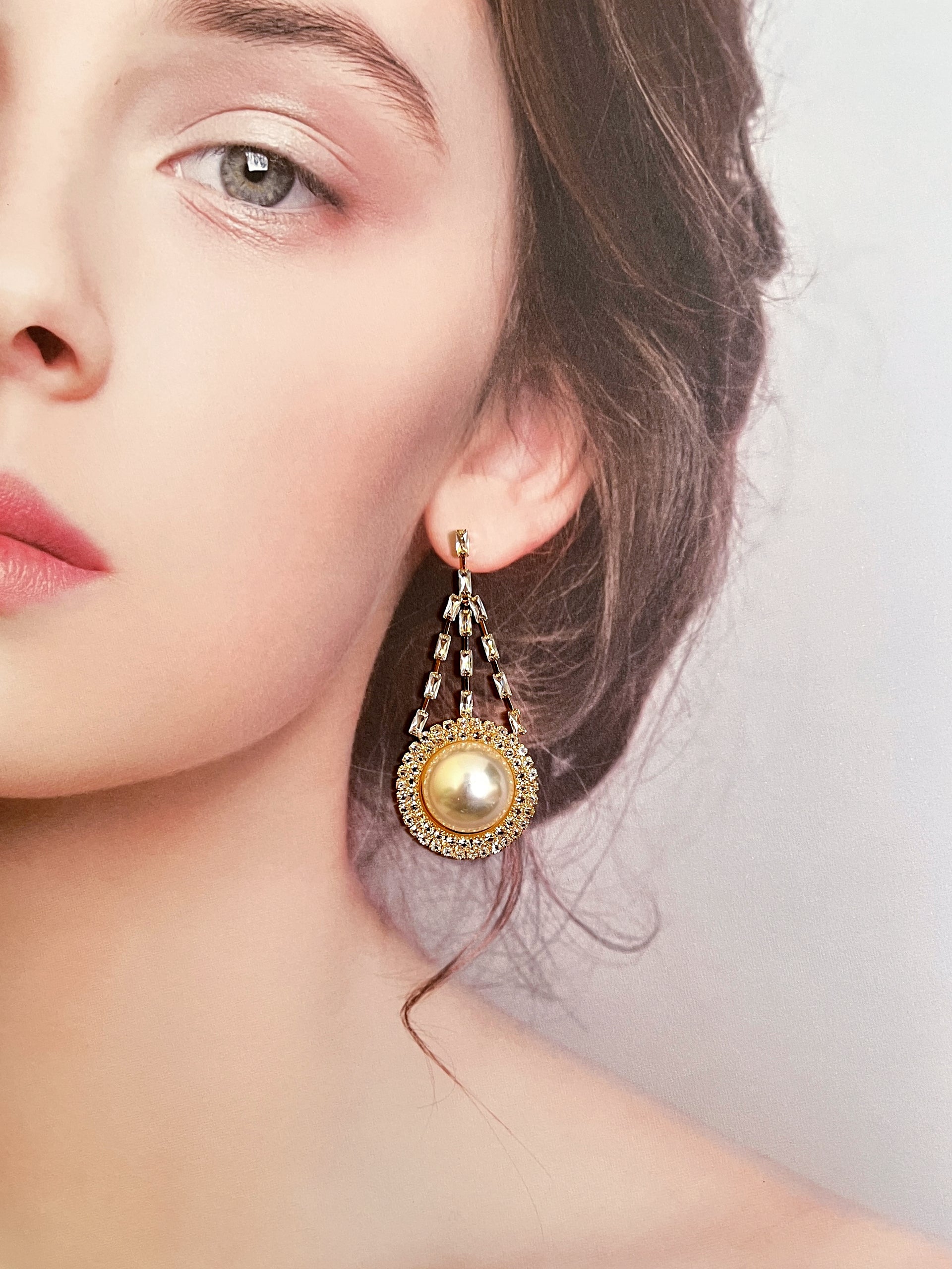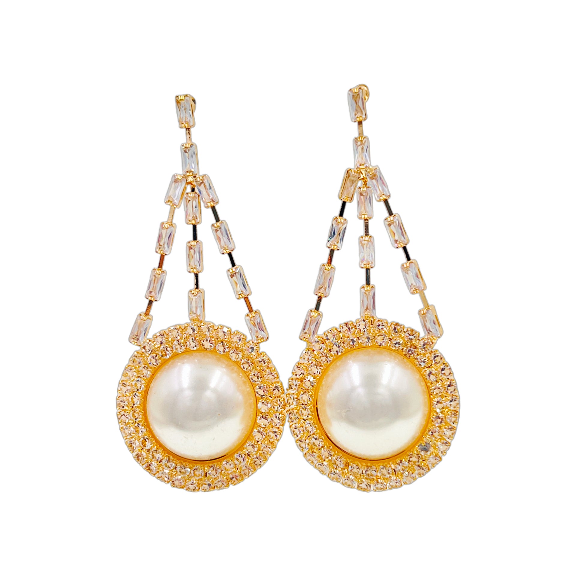 These graceful drop earrings begin with a square-cut zircon stud, from which symmetrical baguette-cut stones cascade downward, forming a sleek fringe silhouette. At the base, a circular setting frames a luminous white pearl at its center, encircled by a halo of sparkling stones—like a radiant crown for the pearl. The design marries classic elegance with contemporary structure, perfect for elevating both day and evening looks.