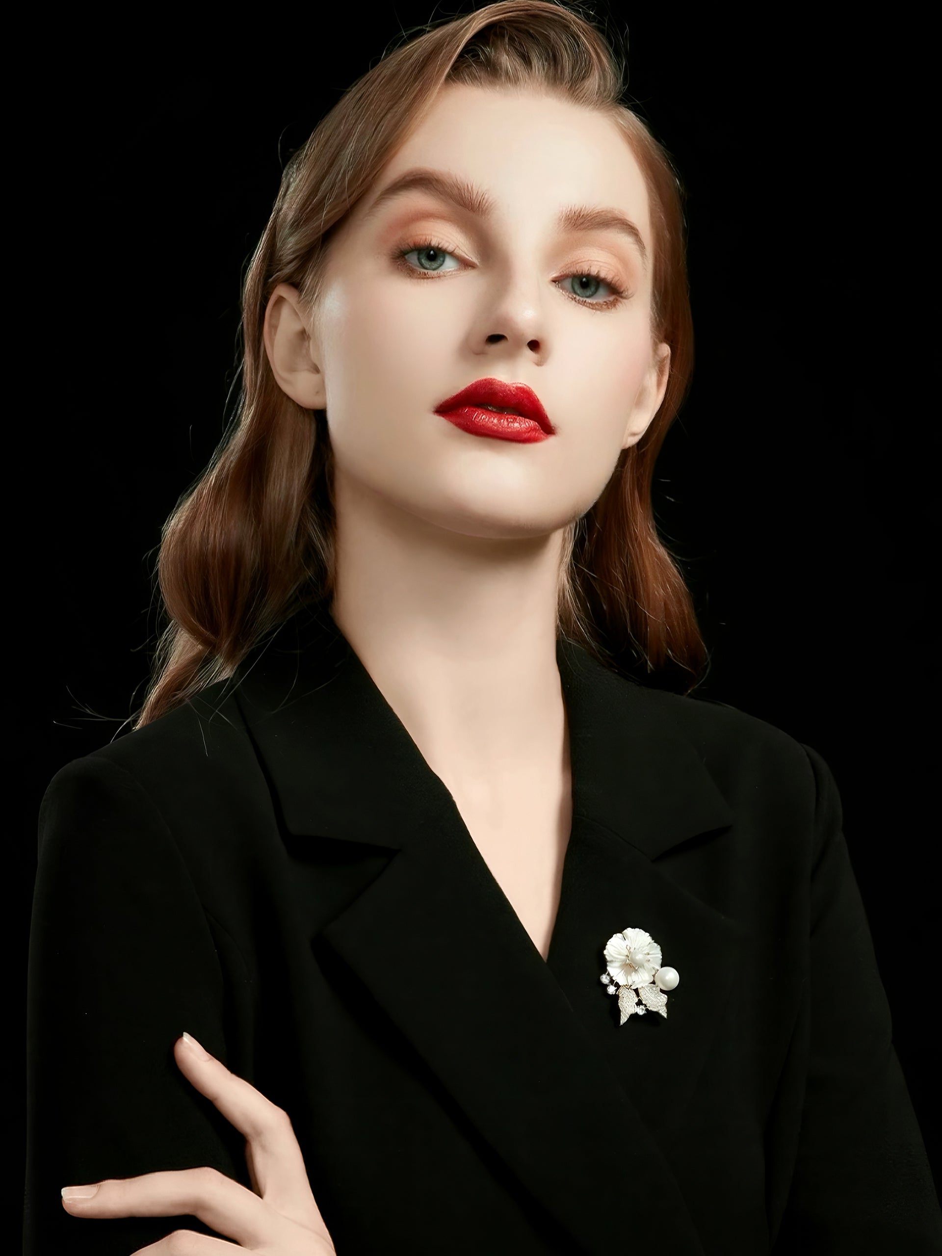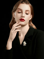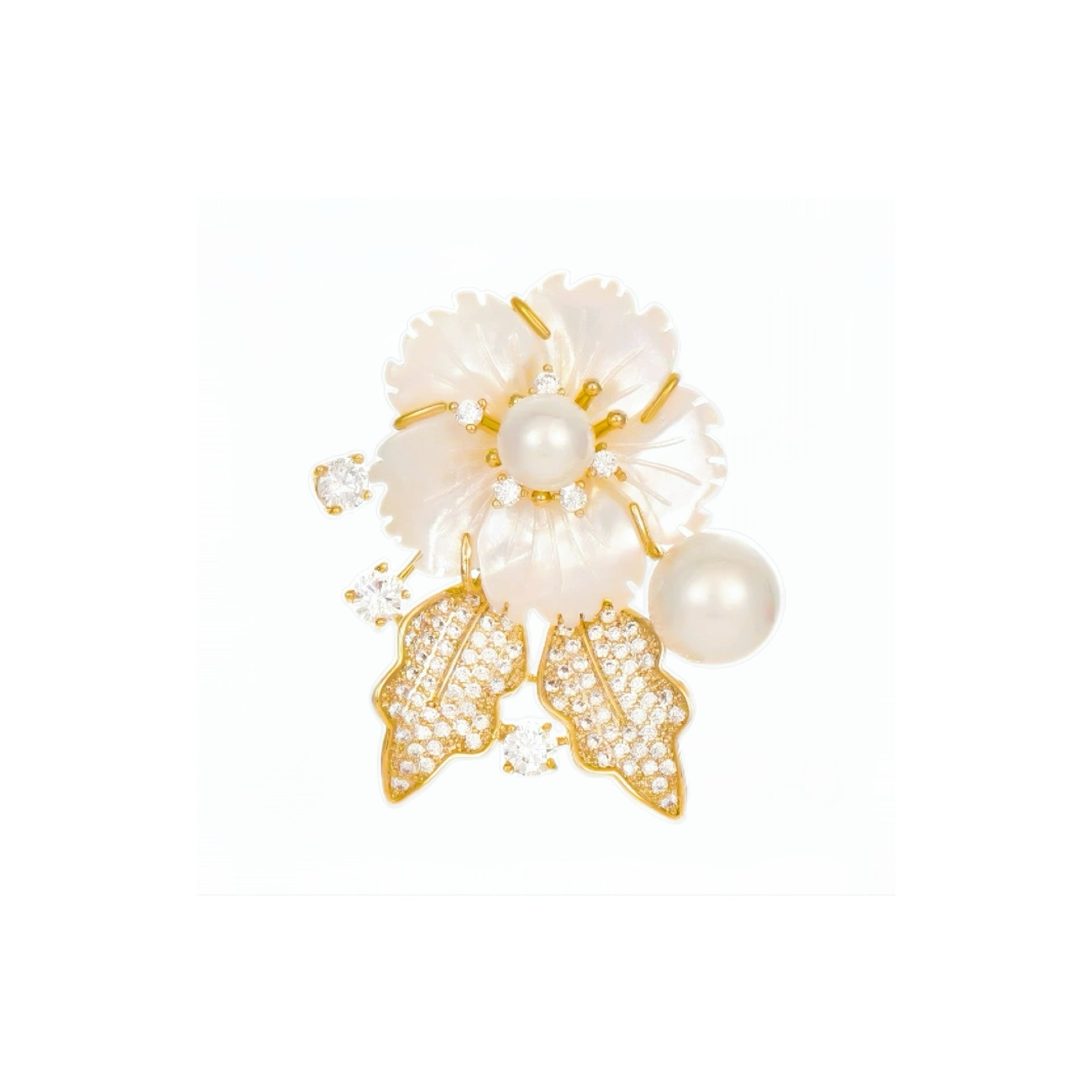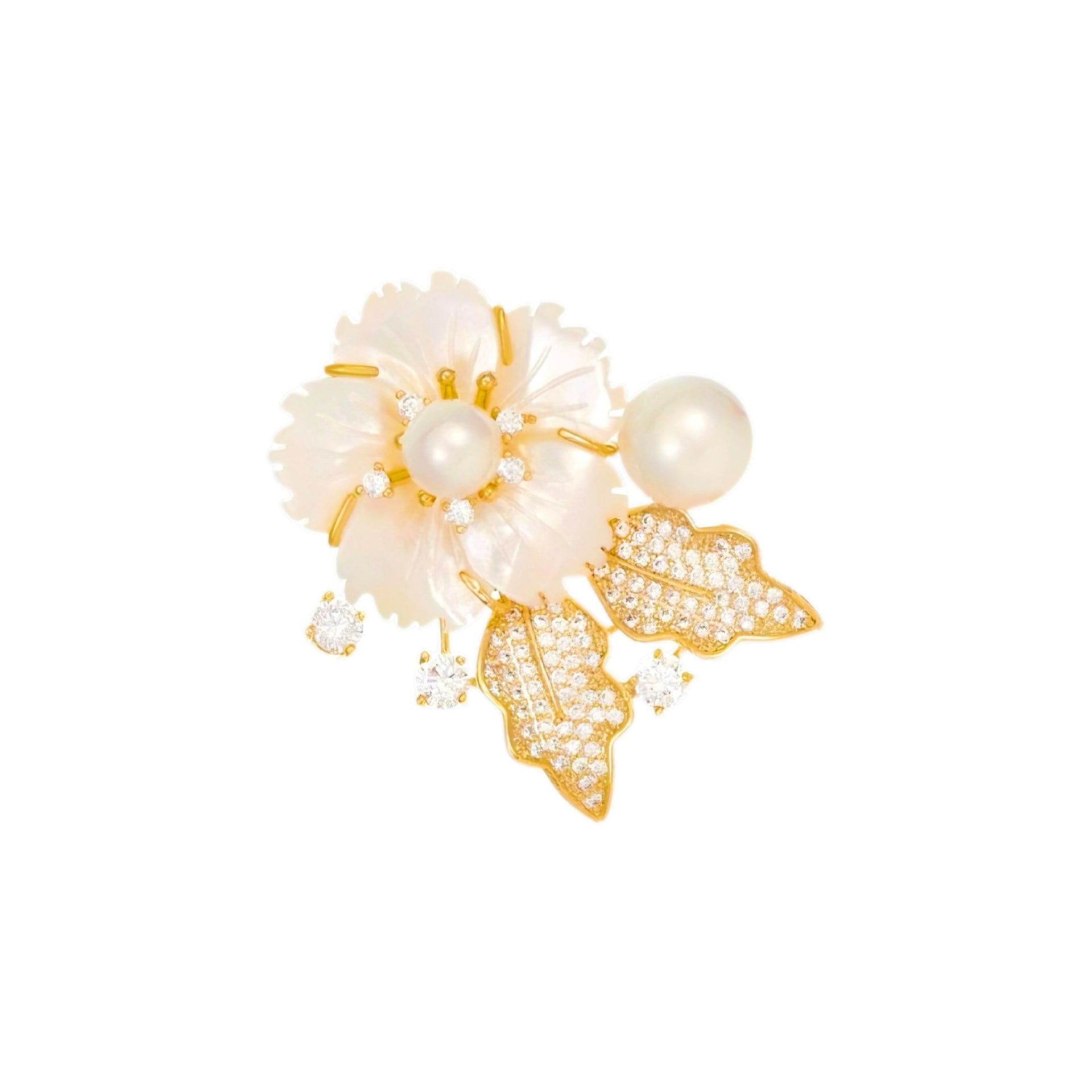 - A luminous shell pearl sits at the flower’s center, surrounded by a halo of 5A cubic zirconia