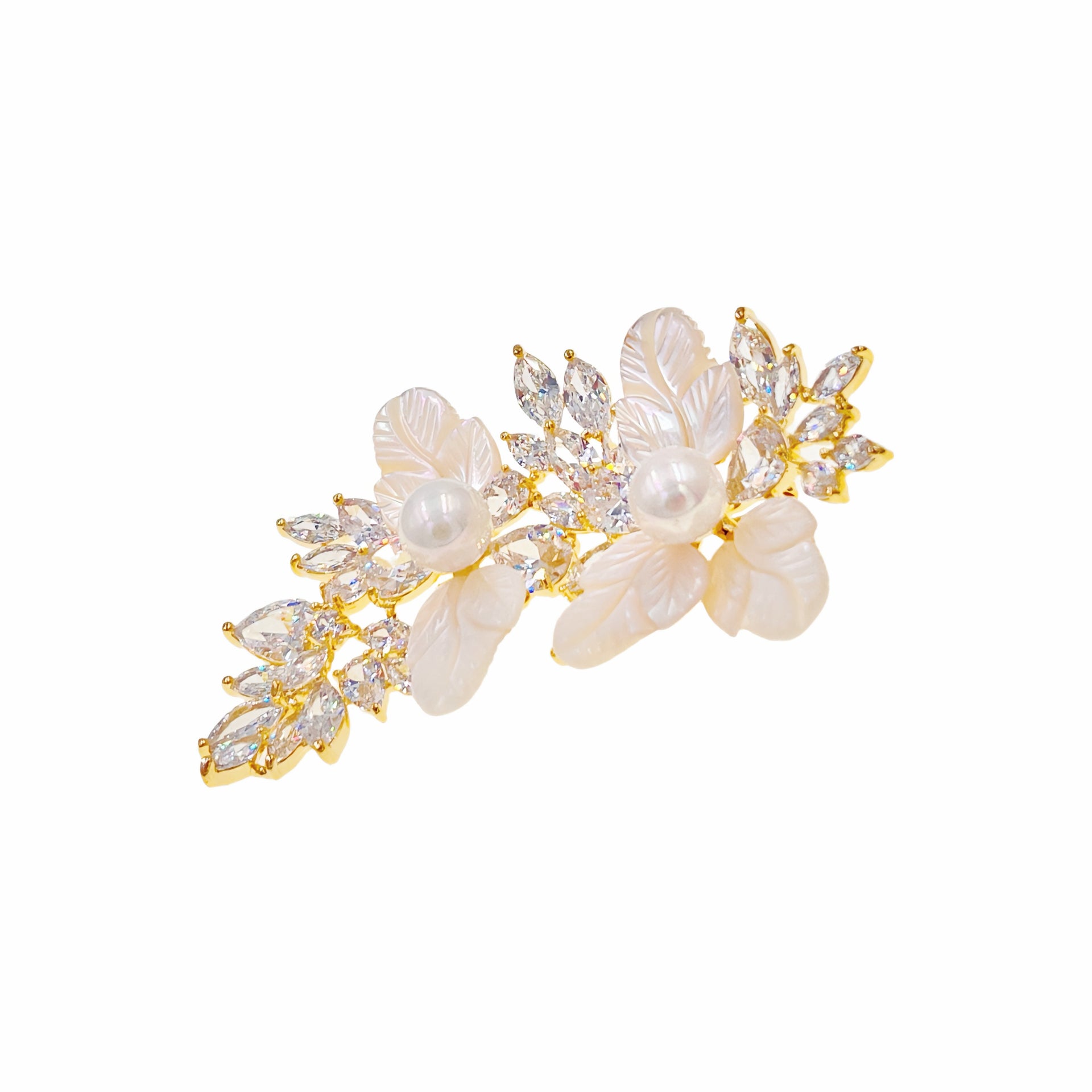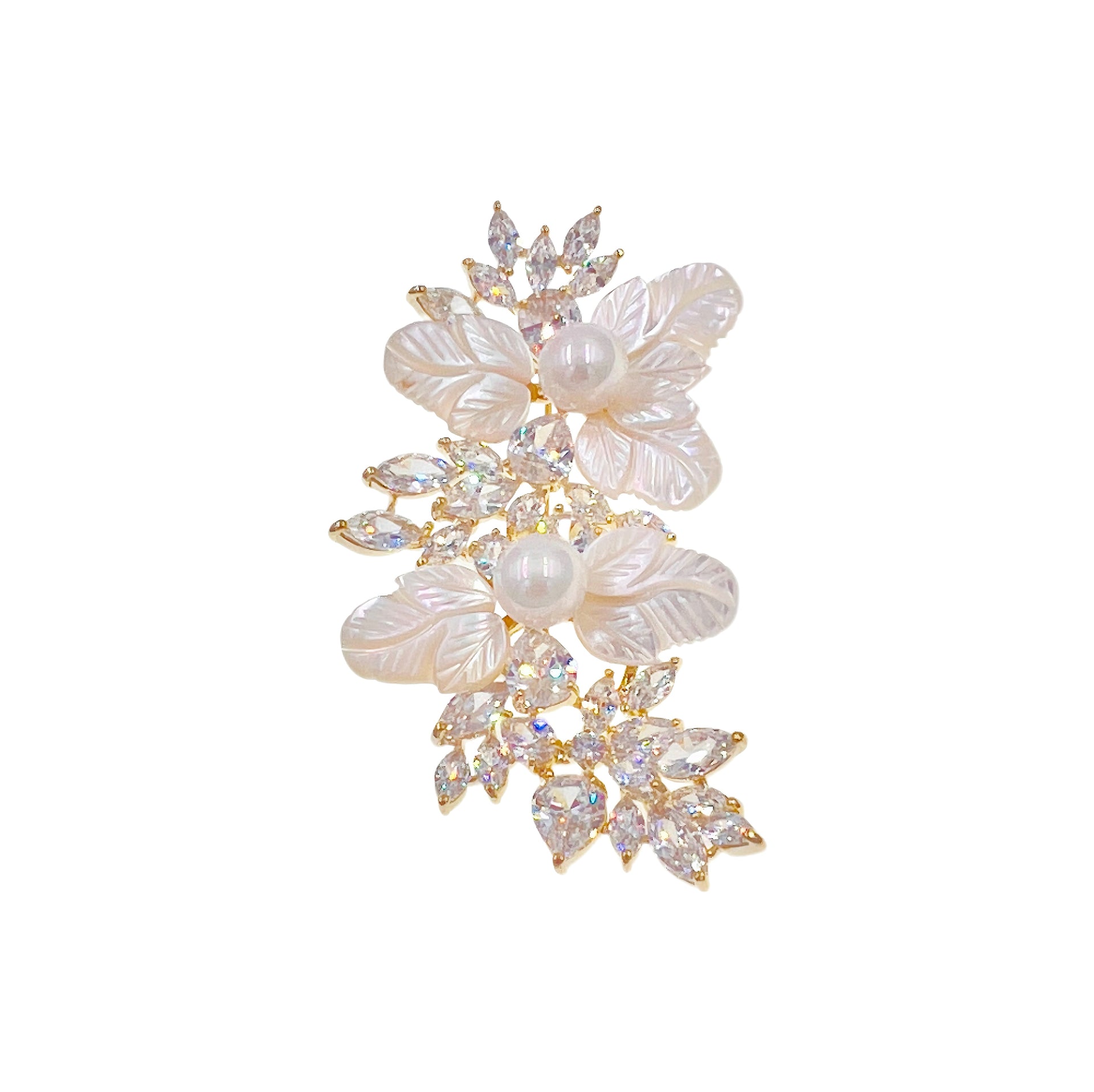 - A lustrous shell pearl forms the flower’s heart, adding depth and elegance