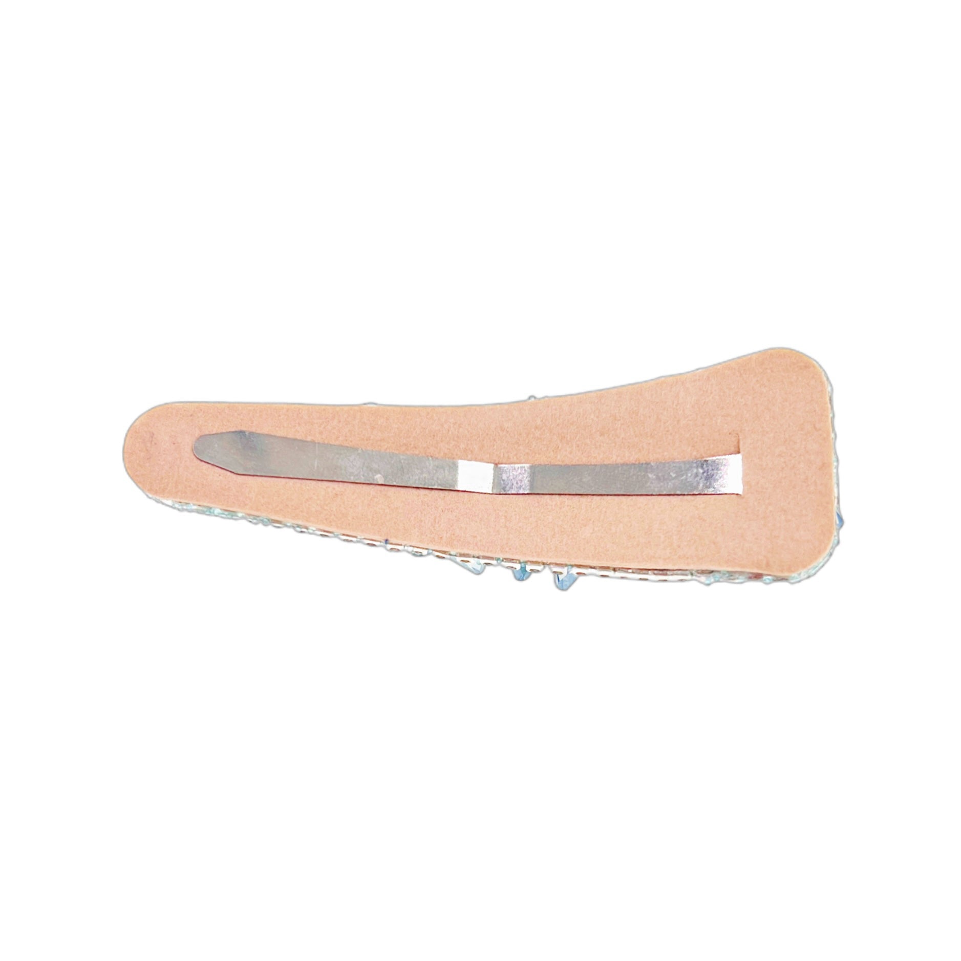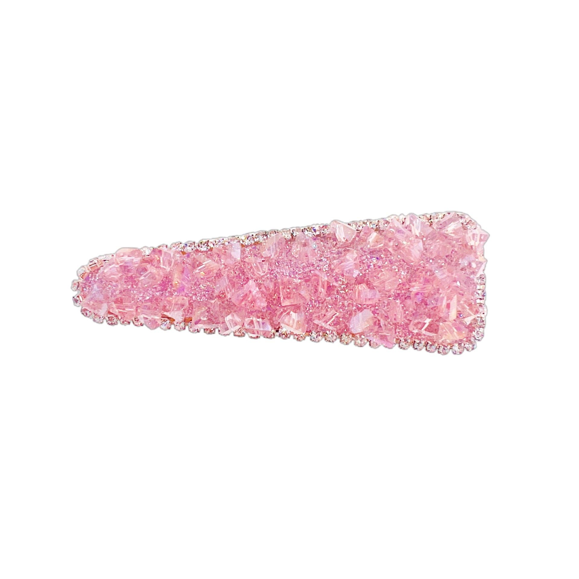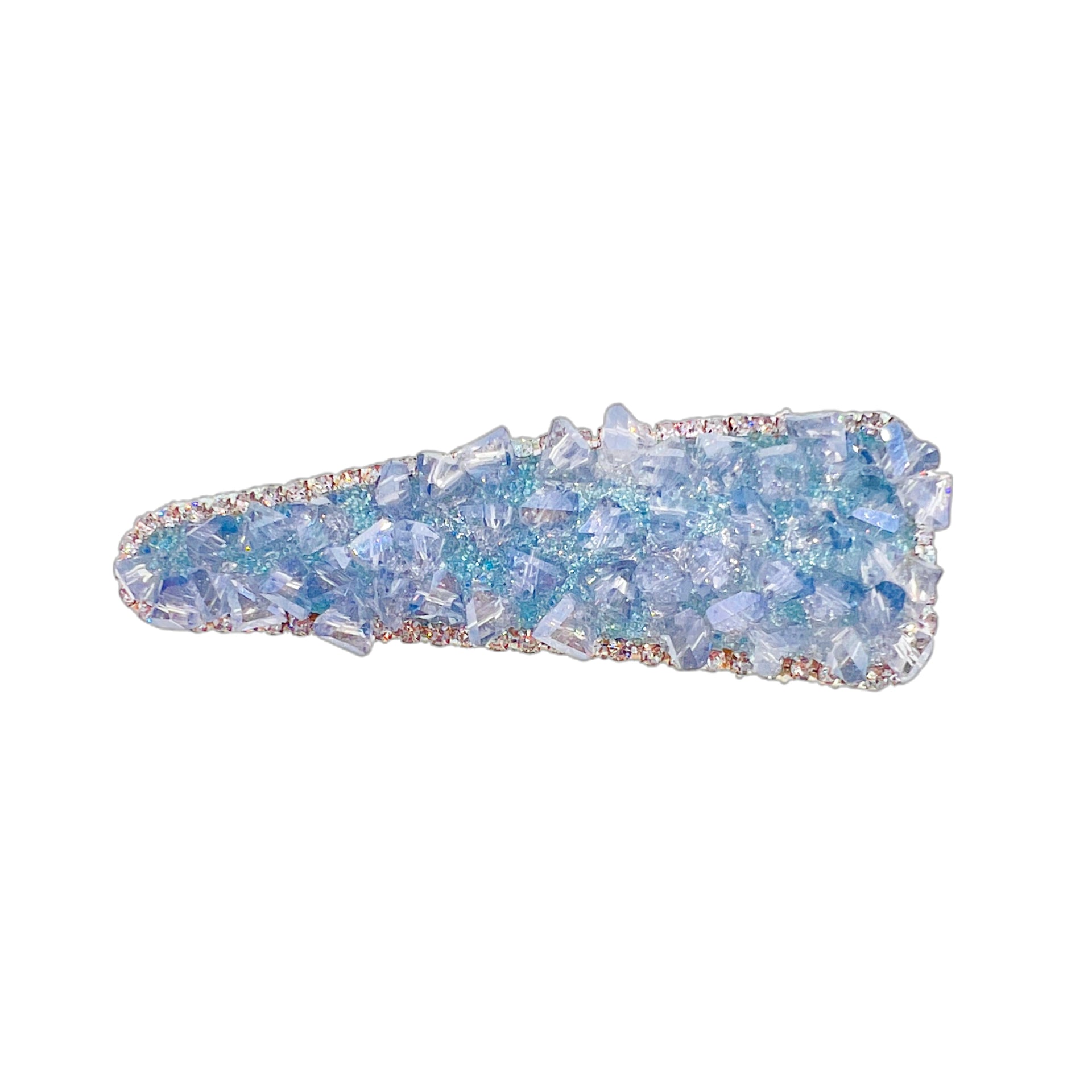 The Prisméa Click-Clack Clip features a supple leather base adorned with square-cut, three-dimensional ice crystals that radiate a luminous, glassy brilliance. Available in soft pink, pale yellow, and light blue, its gentle hues evoke the delicate tones of morning light—graceful yet modern. The elongated triangular silhouette flatters the face with clean, refined lines.
